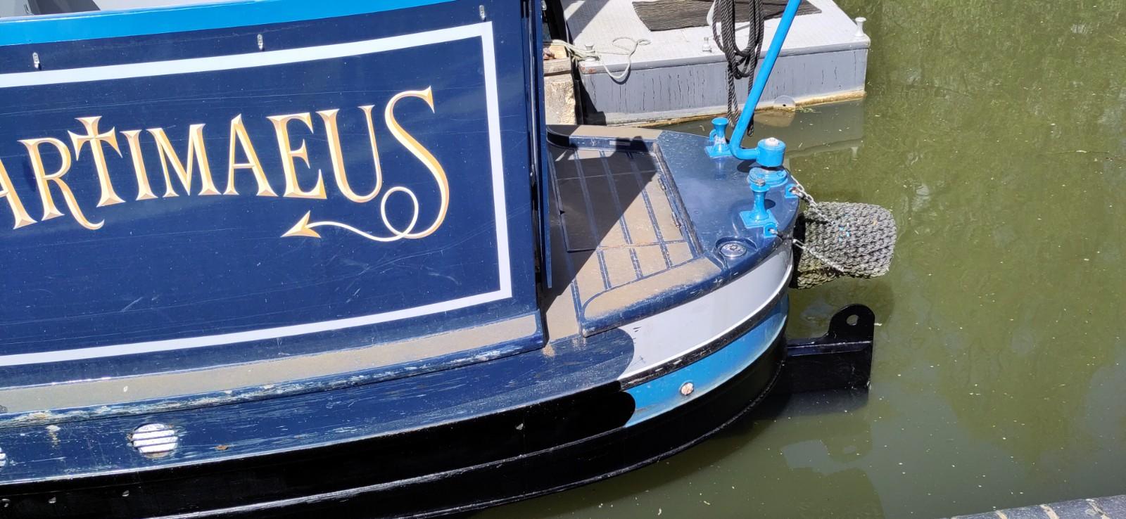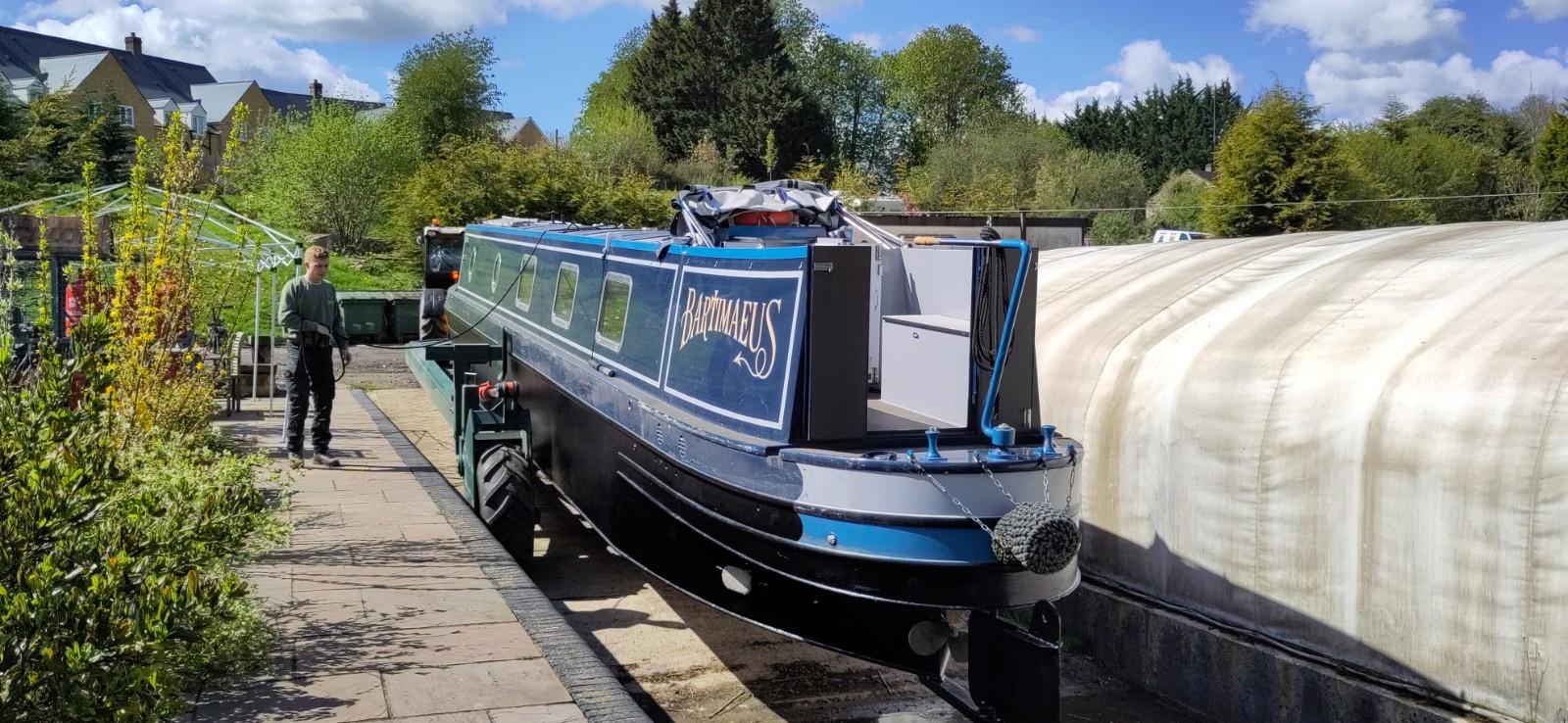 Before getting off, I checked no plates or mugs were on an open space and put things that might break on slide in a cupboard or on the floor. I removed the ladder and got ready to watch the proceedings. I was very impressed by Richard’s ability to reverse a tractor and very very long trailer around a corner and down a very narrow ramp only just wider than his trailer. The width of the canal was not wide enough for a straight reverse across and the boat then had to be controlled by ropes round 2 moored boats on each side of the slipway. It was a pretty tight space to guide the vehicles at each end of the proceedings. A dunt on the other side of canal, fortunately just a soft bit of earth and grass, and a crash of crockery later, (we had way more soup plates than necessary anyway), we were quite soon moored up against the next boat. The assistant had to stand on that boat, when trying to steer Bartimaeus round with a rope but it wat not tightly moored, so wasn’t the most stable place to be guiding from. I did a small amount of pushing to assist the turn, but mainly tried to keep back out of the way.
