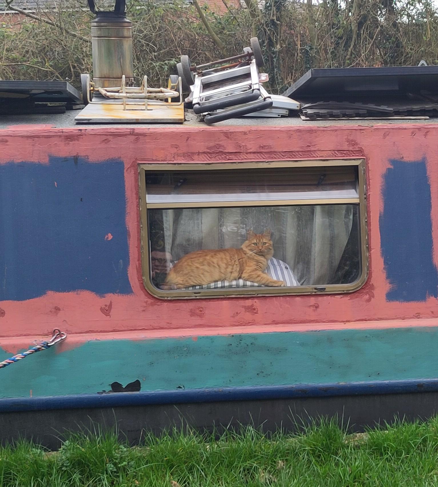 I was aware while still in bed, that the air was not full of birdsong but of the, roar of a mower. As we ate breakfast the mowing had stopped but then the strimming started. This was even louder, especially as it was the edge, where we were moored and the strimmer flicked along the boat and our window was sprayed all over with the strimmings. Bartimaeus was a sitting duck and getting as green as a mallard drake. I suggested that as we were near a water point we could go and give the port flank a hosing down. We needed water anyway so once the grass cutters had moved away Shane reversed back to the water point and we tied up. The combination of hose, cloth and squeegy wiper made a reasonable job. The boat drifted away as boat passed. The driver could tell by the coverage on the back deck what had happened. Once the tank was filled Shane cast off and I drove us past the boat moored ahead, to our original spot.