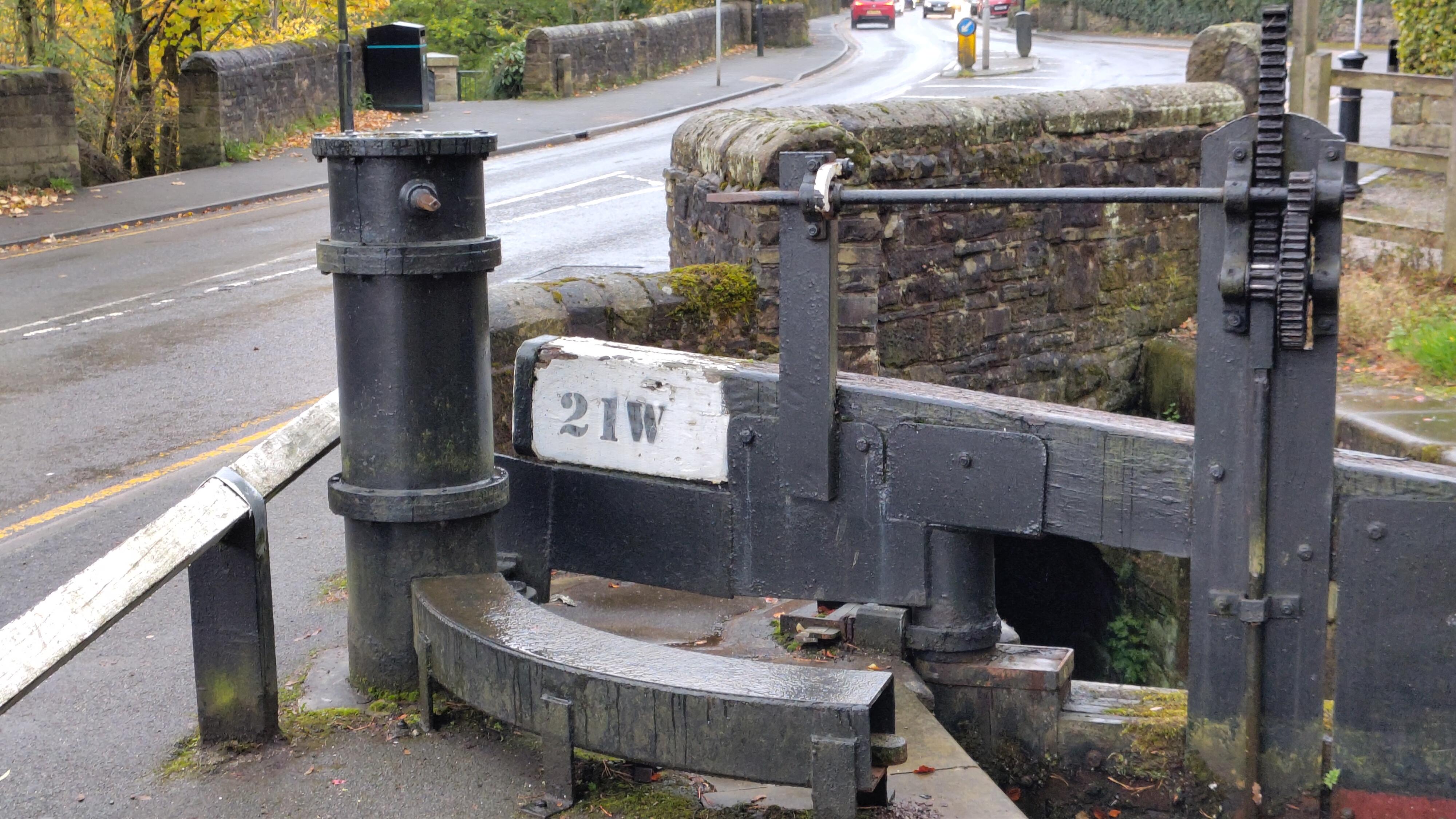 A couple of locks further on, I walked ahead to set the lock, and then dashed back to see if I could buy some bread for lunch. By the time I returned, Clare had opened the gate for herself and was returning to Bartimaeus. This lock had been modified to accommodate a road-widening since it was built. The tail gate arm was now too short to give enough leverage to open the gate, so a windlass operated gear had been installed. Once I’d worked out which way to turn it, it was very easy to use.