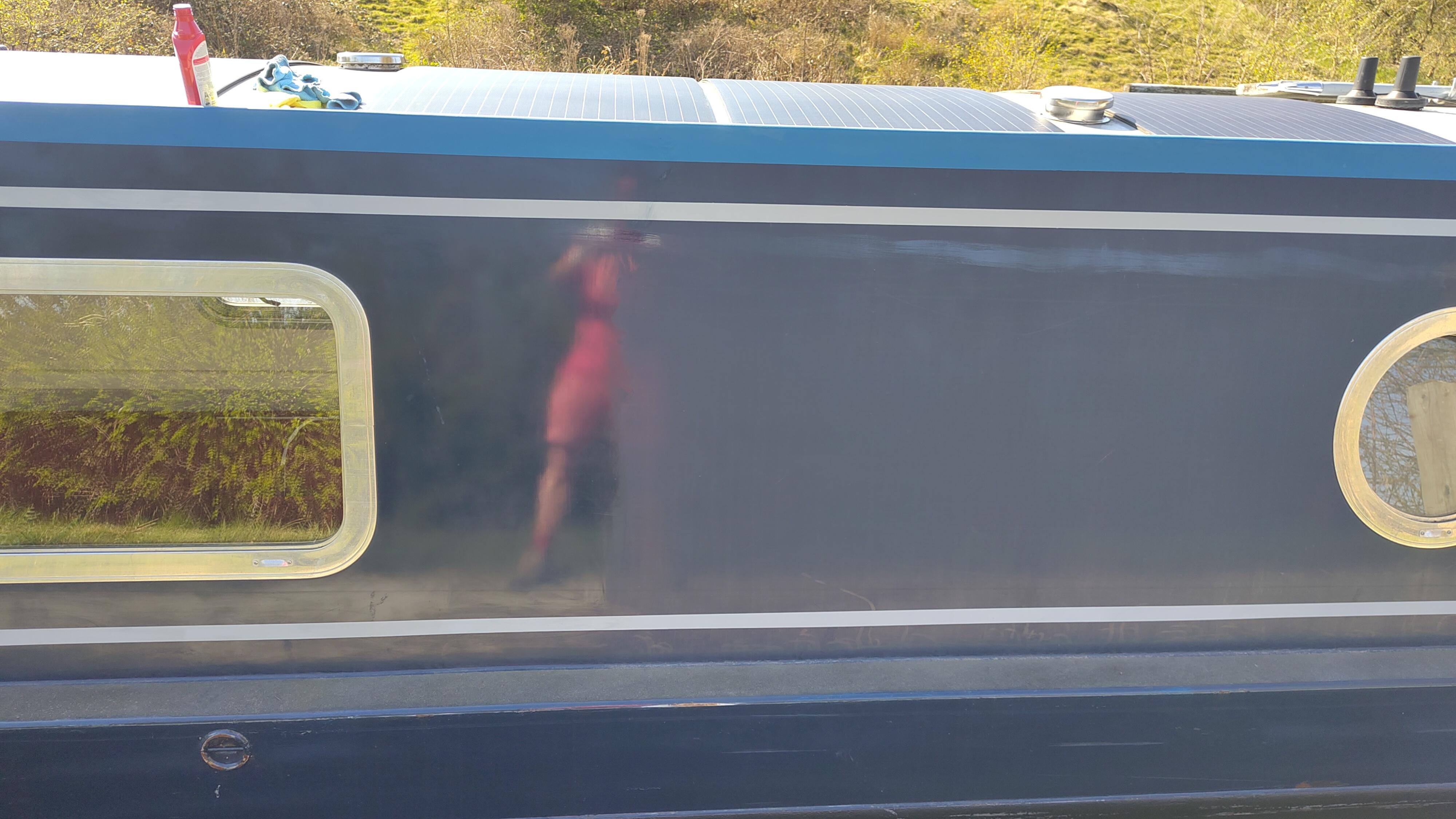 Our sunny spot opposite Chirk Marina has served us well. On Thursday morning, I noticed that the small tree on the bank was shading the panels for some of the morning. We were using the rings provided on the towpath, but the bow rope was already on the last one. I moved the strop at the stern forward one ring, and then deployed one of our handy mooring chains in the metal pilings, allowing us to move forward the required distance. Our charging rate promptly doubled!