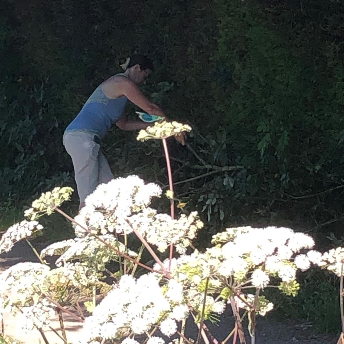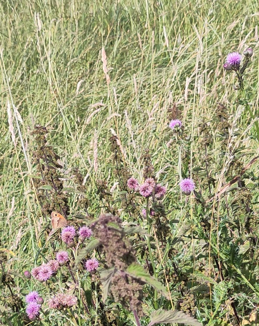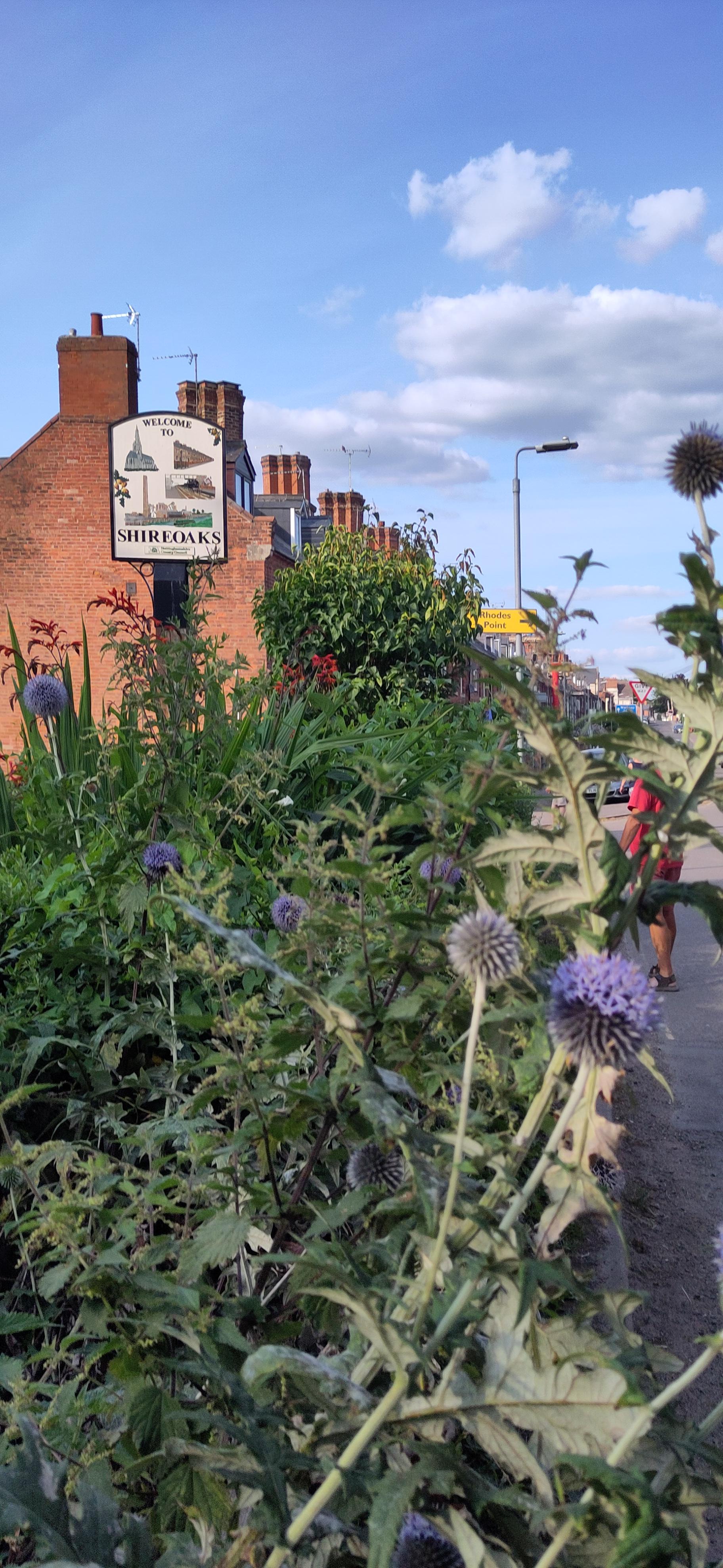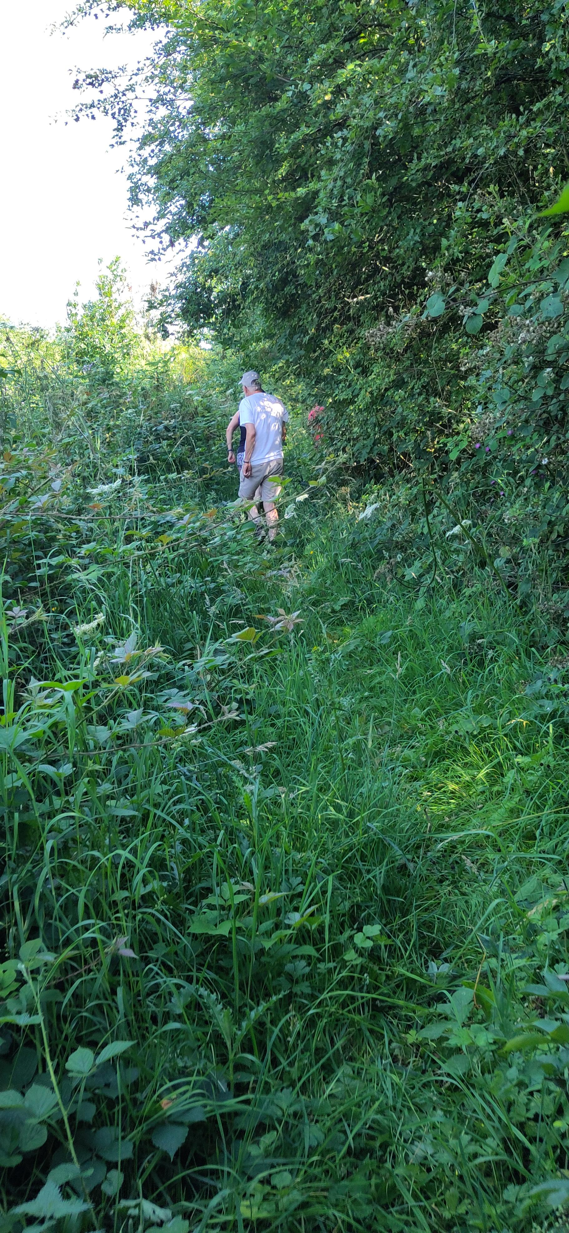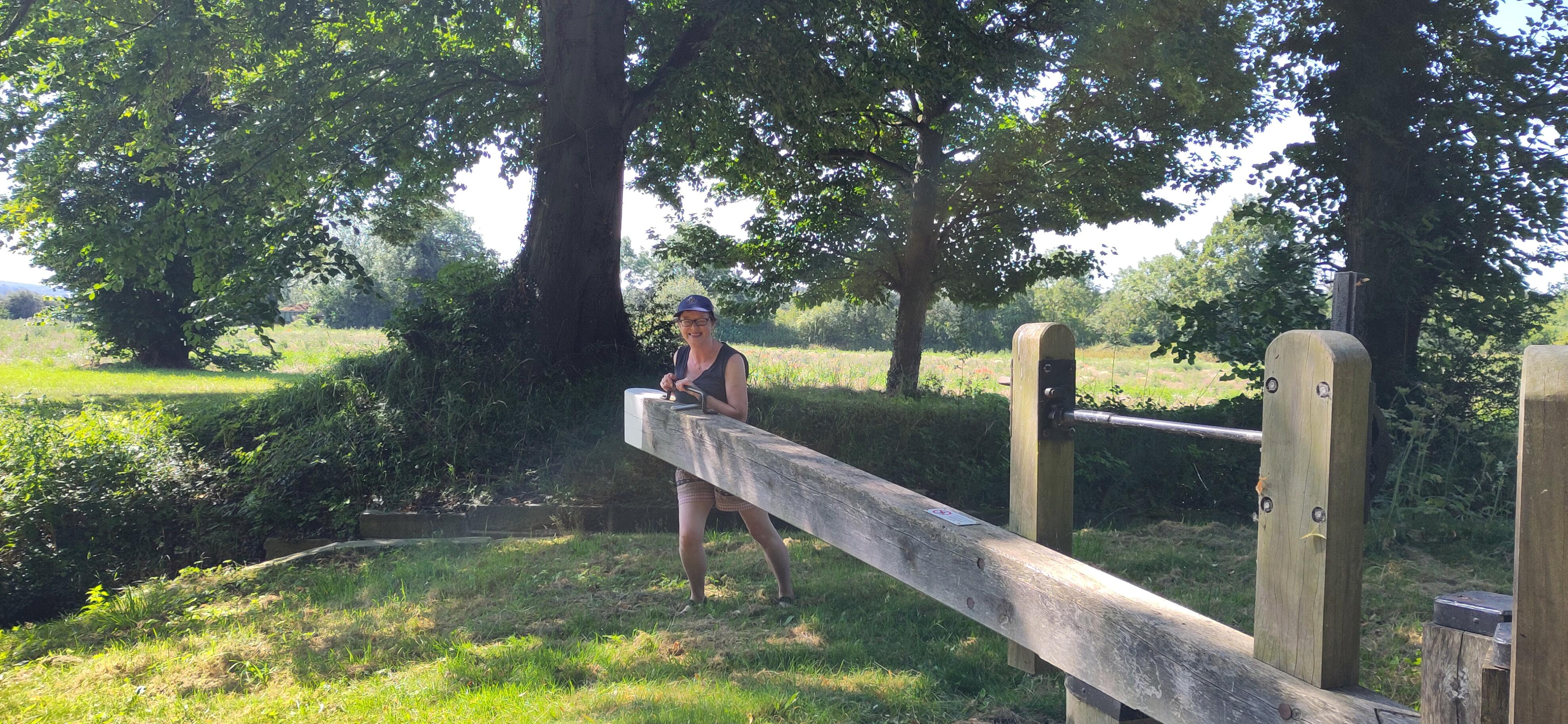 The next day was a major flight of locks so we needed some building up. While we were at breakfast, I saw our friend from the boat behind, who had enjoyed the same pub the day before, walking past with a boathook in his hand. I didn’t think this would be up to moving the tree. When I saw him return, I asked how it had gone. He explained it hadn’t even reached the tree from the bank. I told him our crew planned to tackle it with a saw and he agreed that would be what was needed. Roland and Shane set about it. Roland sawing, Shane photographing and taking branches from him. The lopping was going well but they had nowhere to put the branches, as they couldn’t reach either bank and so I went to get them passed to me from the boat to the towpath. Margaret was enjoying the damselflies but then came to join me in tucking the branches into the hedge, off to the side of the towpath.
