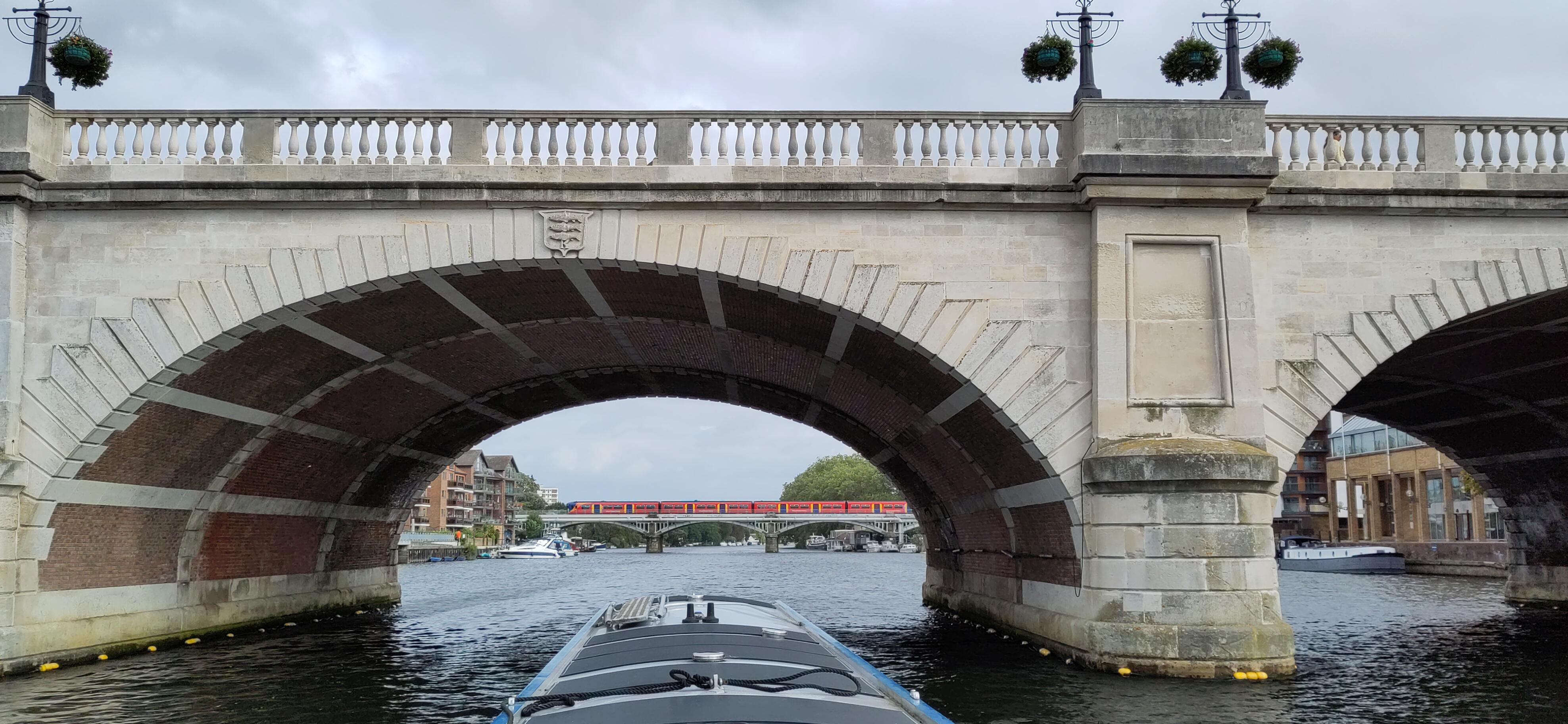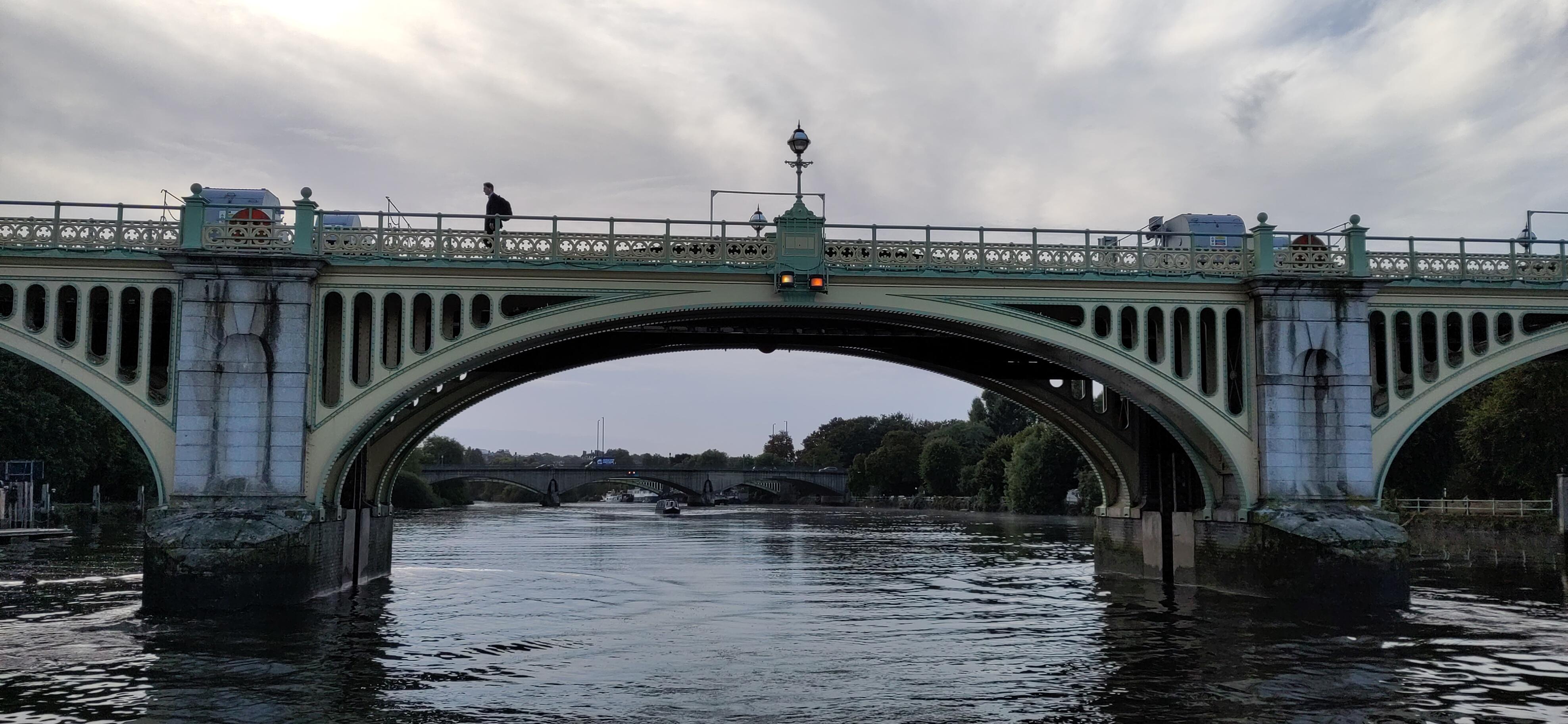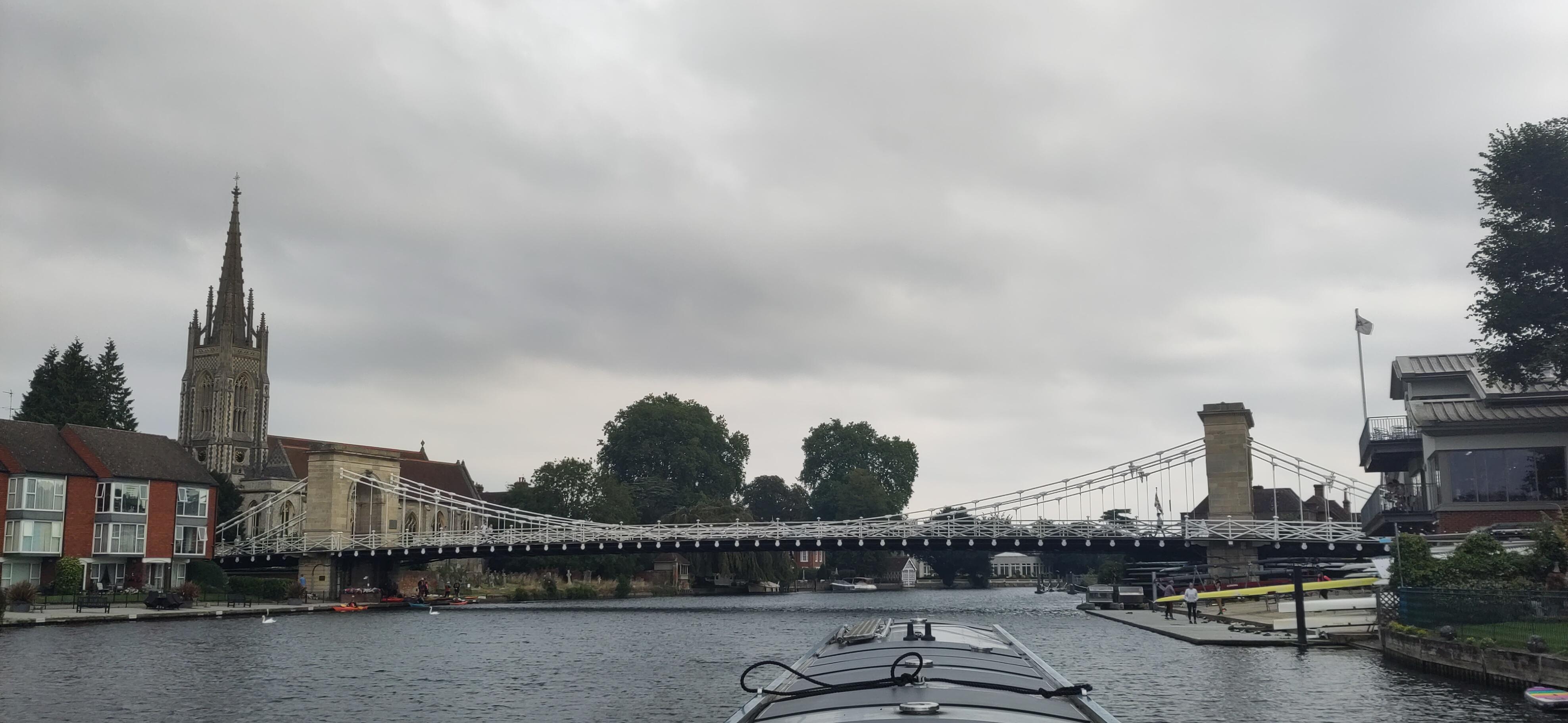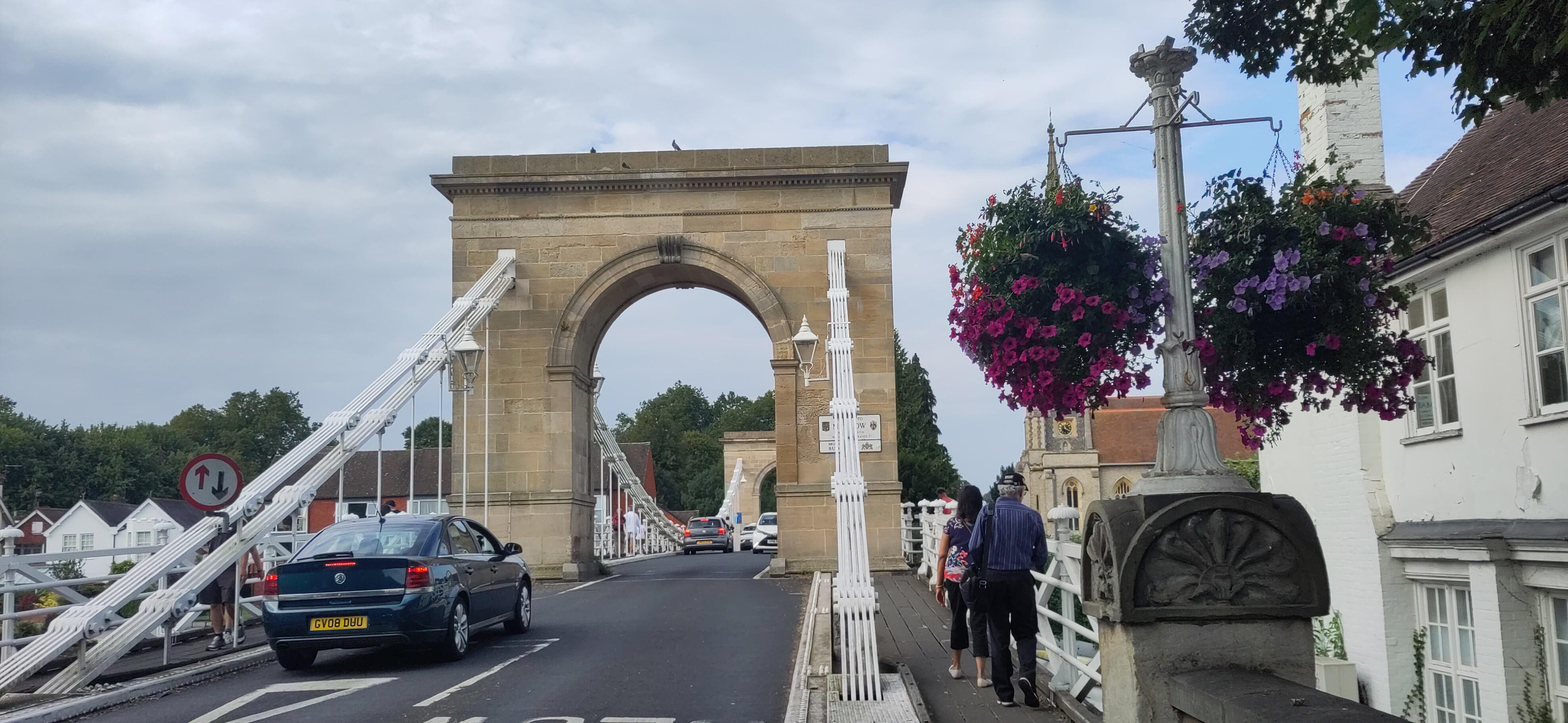 The next day we drove under it. The Thames is so much wider than the canal, and deeper, that the bridges are much higher, as well as wider arched, when arched, to allow large boats through. We had a much easier time of it than the cars above. In the Marlow suspension bridge the arches are only on the road and are on top of the bridge in stead of under it, though the stone supports do carry on below.