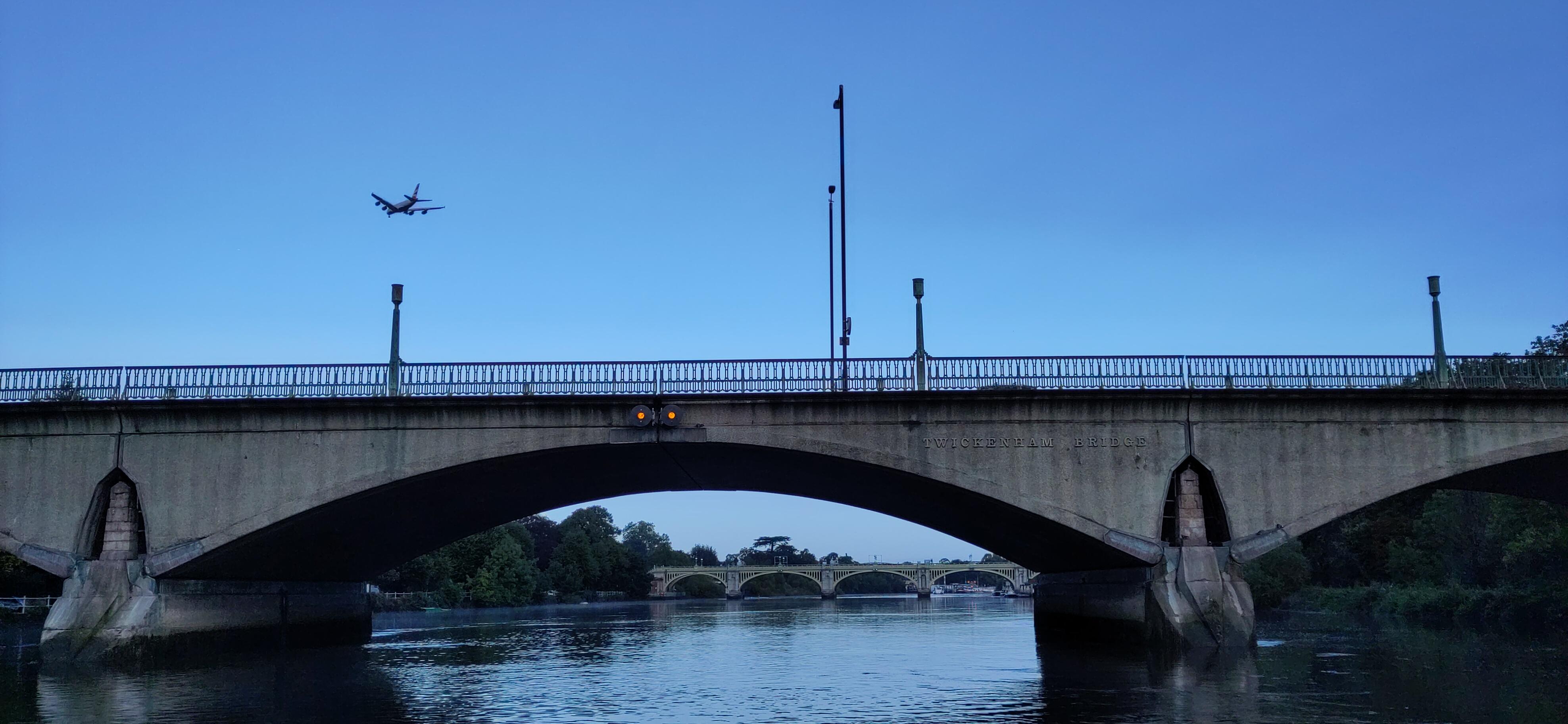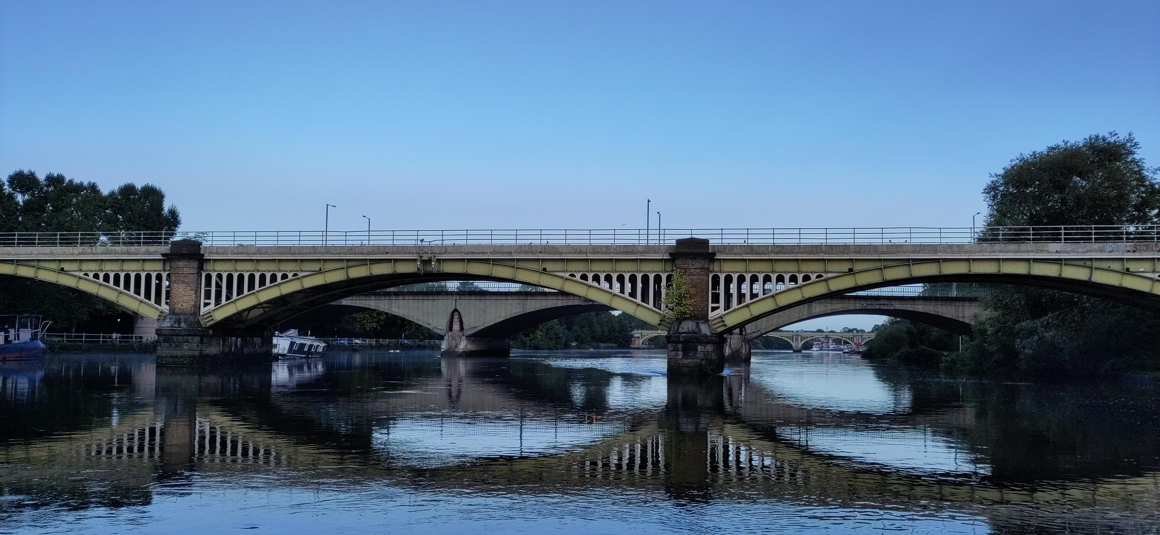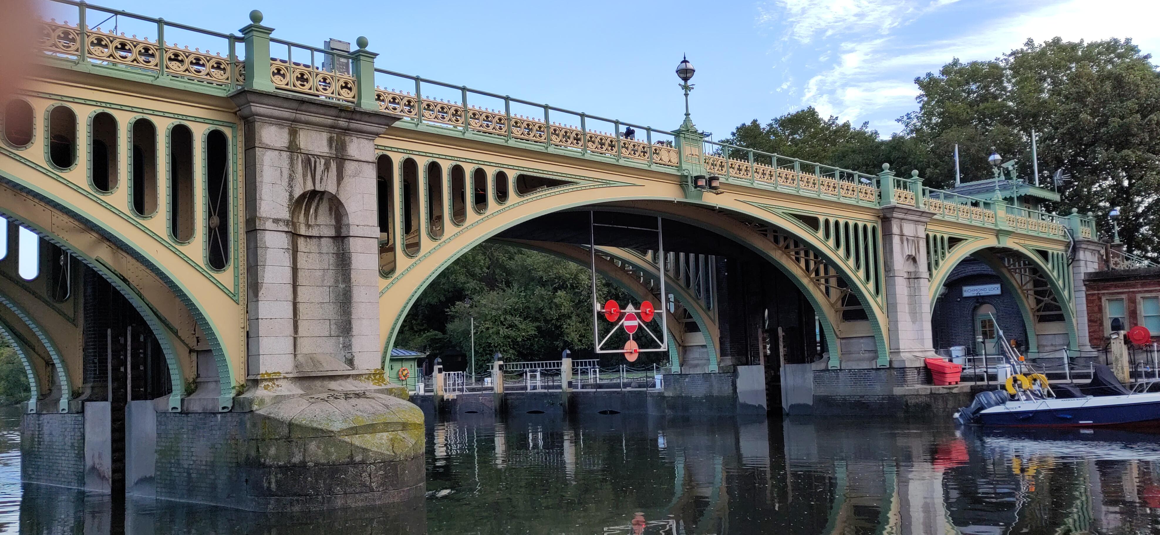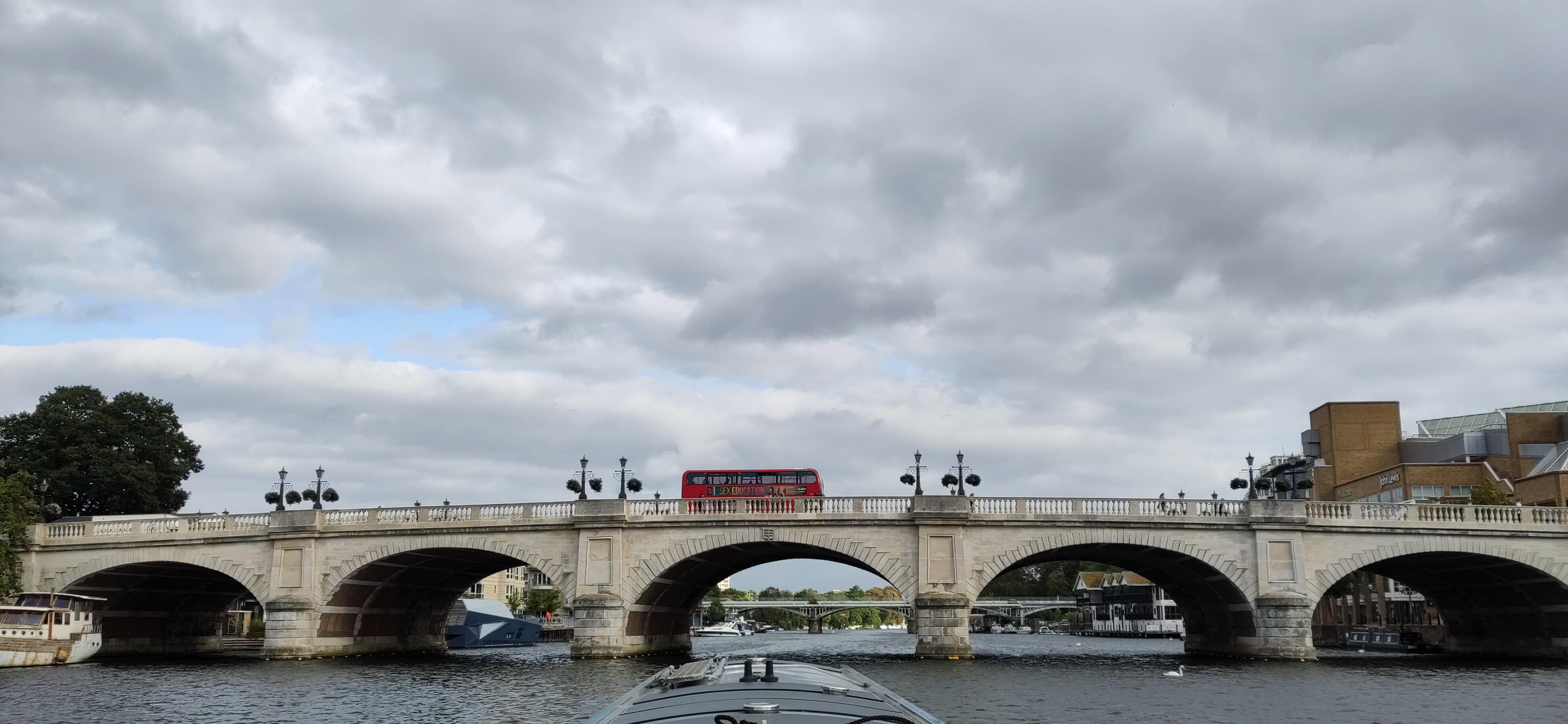 The next day we drove under it. The Thames is so much wider than the canal, and deeper, that the bridges are much higher, as well as wider arched, when arched, to allow large boats through. We had a much easier time of it than the cars above. In the Marlow suspension bridge the arches are only on the road and are on top of the bridge in stead of under it, though the stone supports do carry on below.