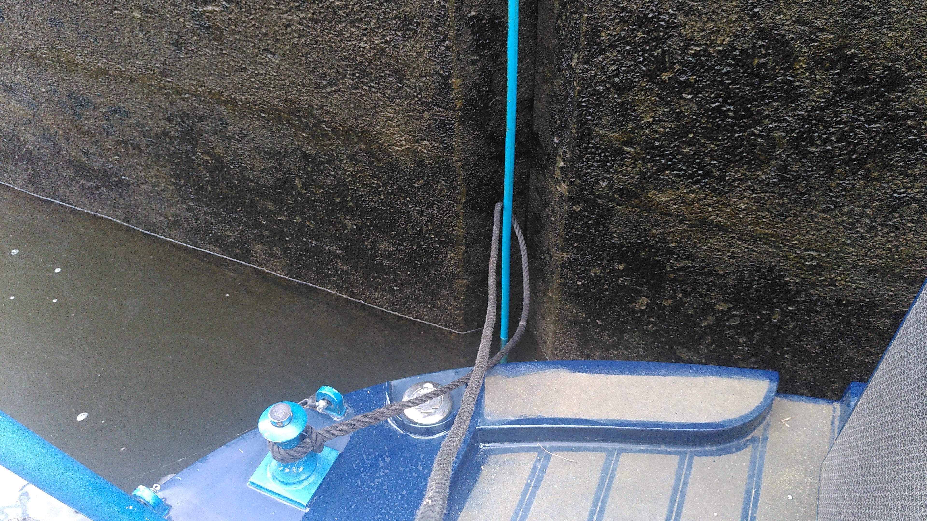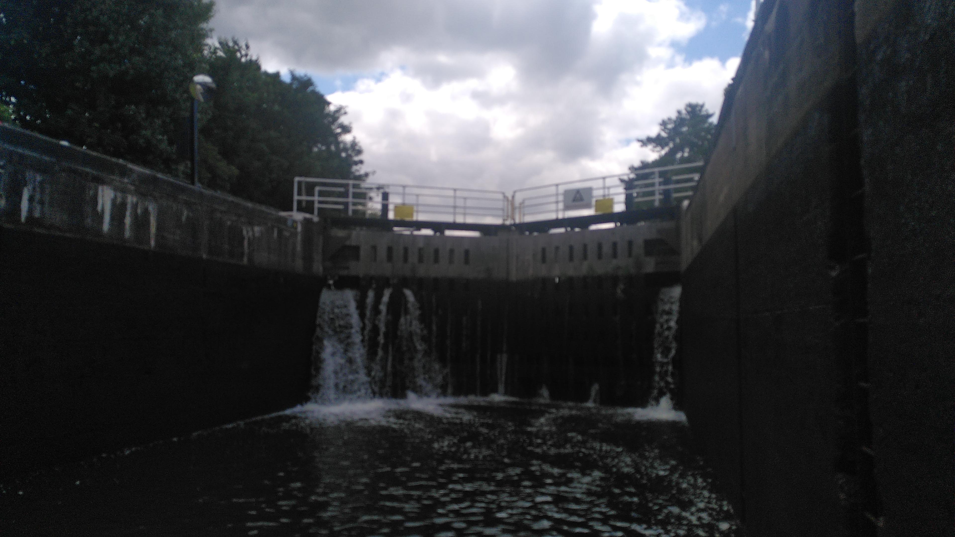 While we were preparing, the wide narrowboat I’d seen earlier had arrived. The lock-keeper spent a long time explaining things to the crew. It sounded a bit tetchy at times, but the lock-keeper’s good humour resulted in smiles on both sides. It didn’t help that the conversation had to be shouted across the lock, the skipper was not entirely sober, and his crew were young boys. When everything was settled the descent in to Holme Lock began. It was a long way down, and went quite slowly.