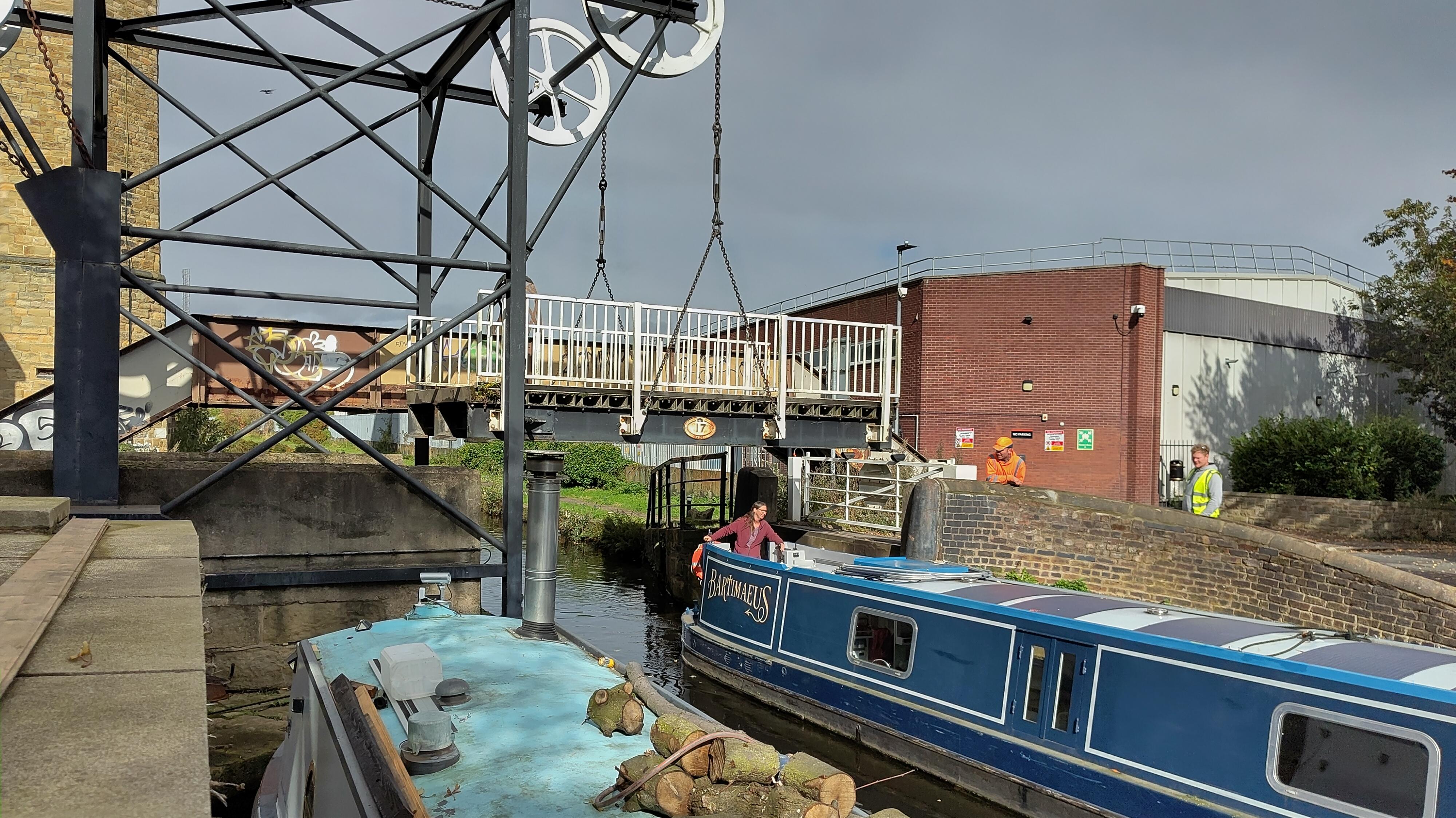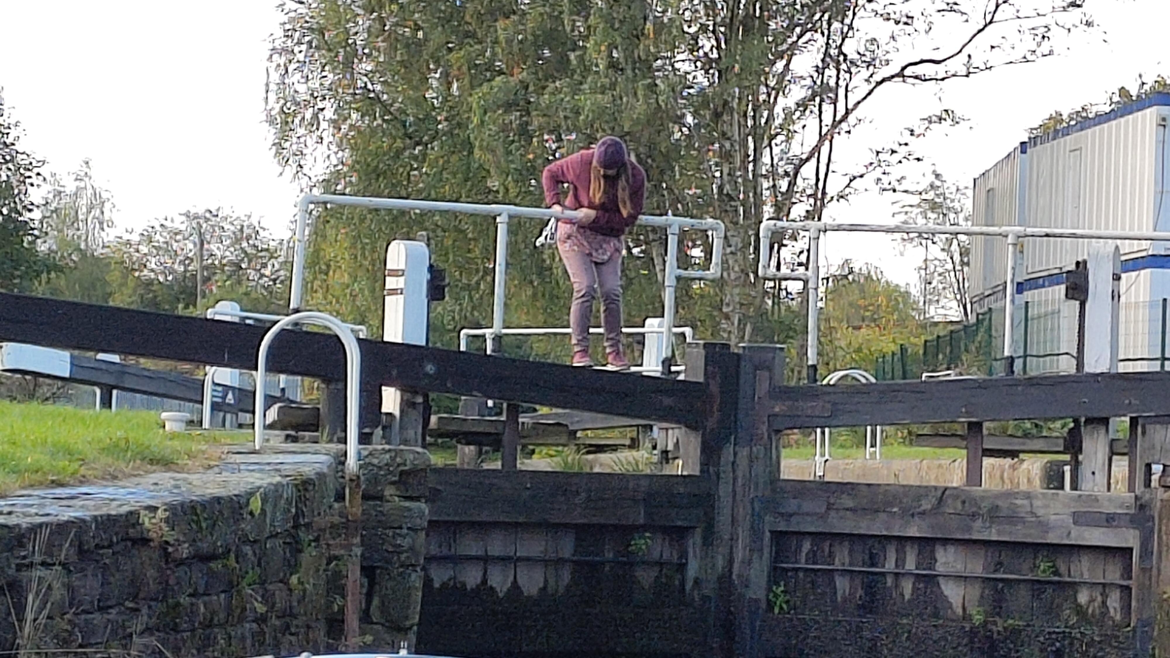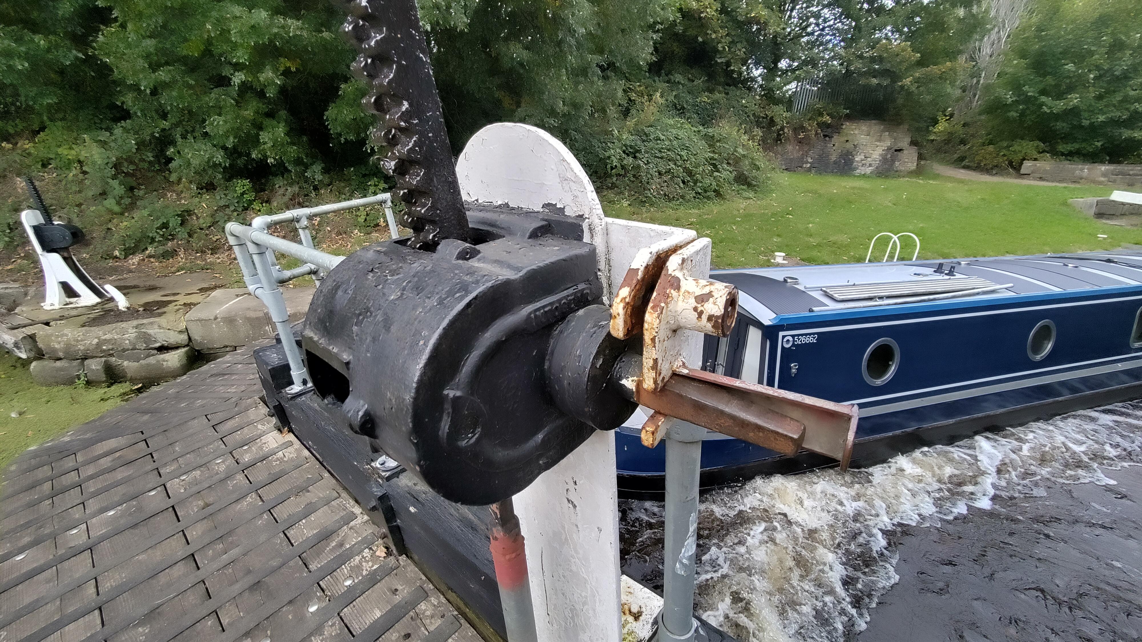 I had managed to get the strop at the stern on to a bollard by now. It wasn’t the best mooring, but it did guarantee that we’d be able to reach the boat. With Clare safely back on the towpath side, we concentrated on the paddles. I tried the ratchet windlass on the nearside one. With the handle horizontal, if I leant my whole weight on it I could just move the paddle. Lifting the handle again and repeating I managed to get the lock to start emptying. Clare had shut the errant gate again, and now the water movement held them shut. I was able to walk round to the other side and repeat the paddle opening.