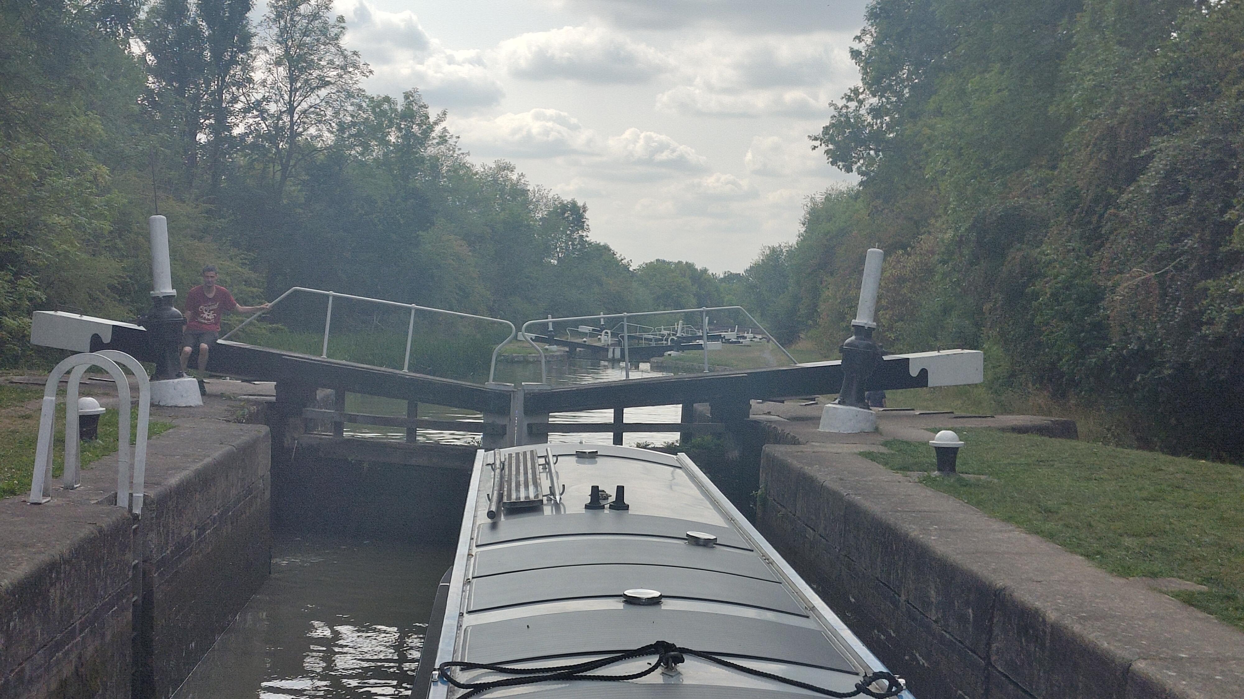 We made short work of the flight, but locking is hard work and the afternoon was very hot, so by the time we stopped, Clare and Bryn were both keen to have a shower. As the afternoon cooled, we went for a short walk in to Long Itchington. We found a pub for a drink. Other pubs were available, but ours turned out to also house an Indian restaurant, so we checked the menu. We couldn't resist a carry out curry - which turned out to be excellent.
