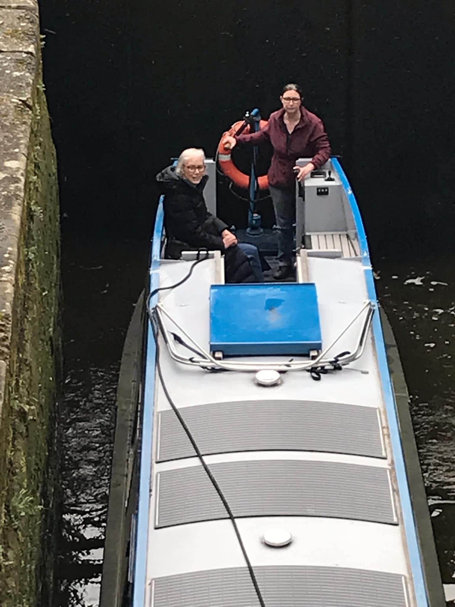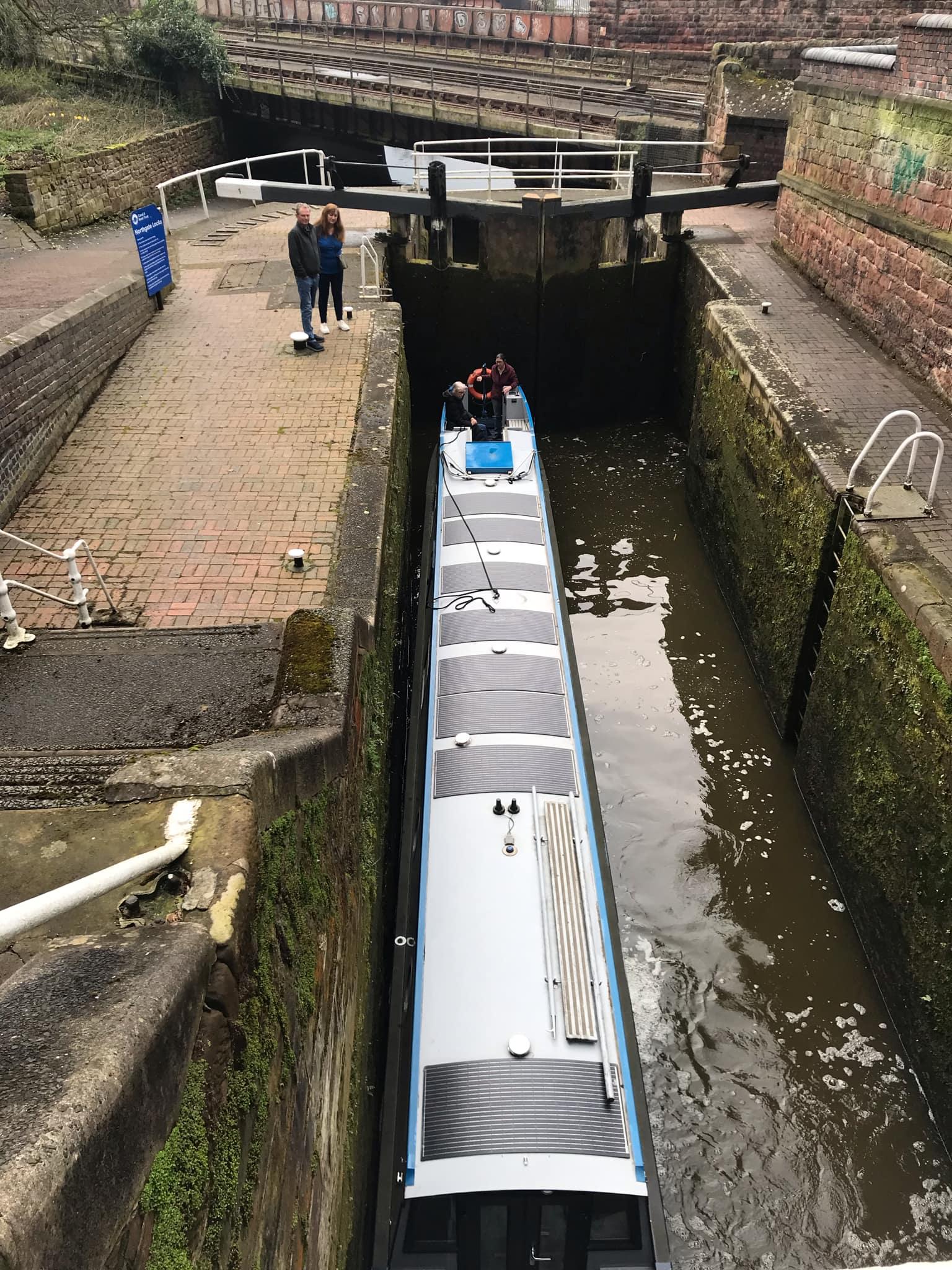 When a volunteer asked if I was ready for the sluices to open, I asked about the front passenger and spray to be told this lock was fine but the next was unwise and the doors should be closed. I decided to run to Christine and explain and she was on it for closing the doors already, but then decided to come to the back and brought her cushion in, sensible move. She didn’t have her camera but Geoffrey did, so he got some pictures, since he wasn’t needing to wield the windlass.