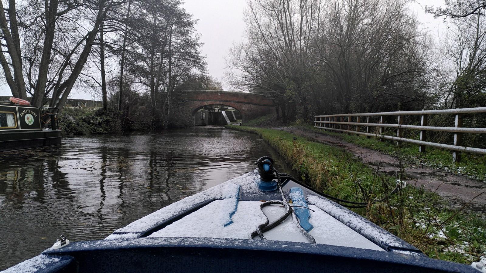 The wind was still strong all day, but we wanted to move up to the bottom of the Tardebigge Flight to give us a head start tomorrow. So in late morning we wrapped up warm and set off. The wind was blowing hard straight on to the towpath, so before Clare and Bryn set off for the lock I asked them to give the nose a really big push. I was then able to drive away from the bank and down the canal at a pronounced angle.