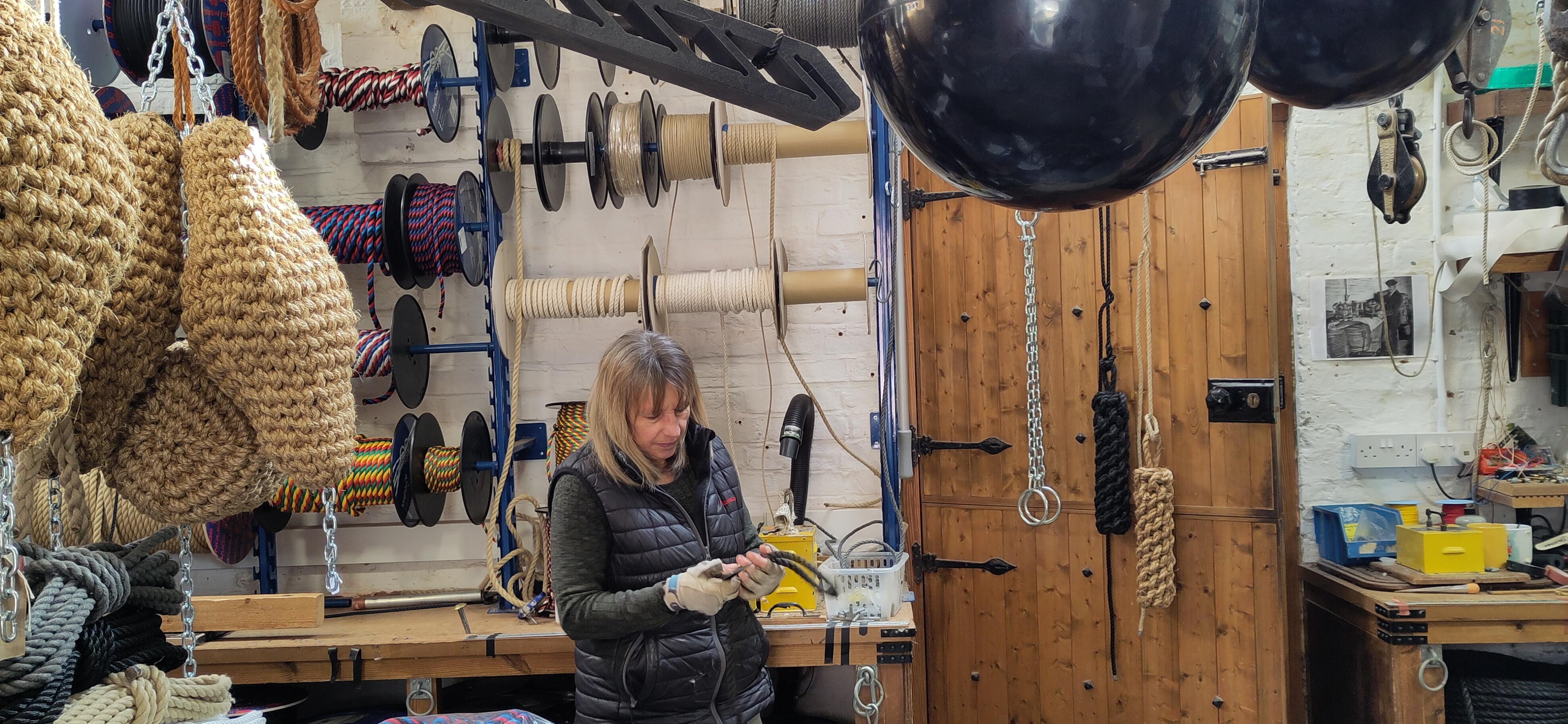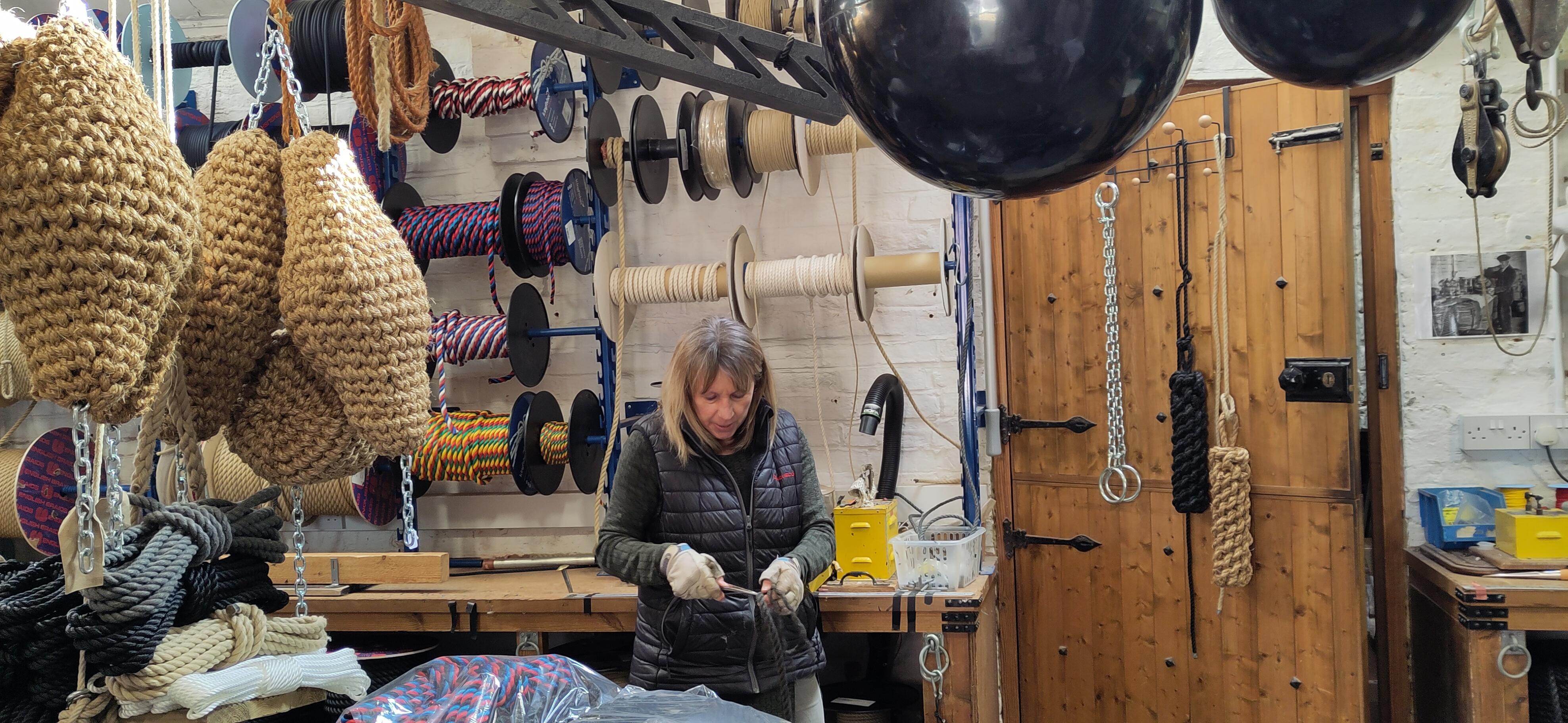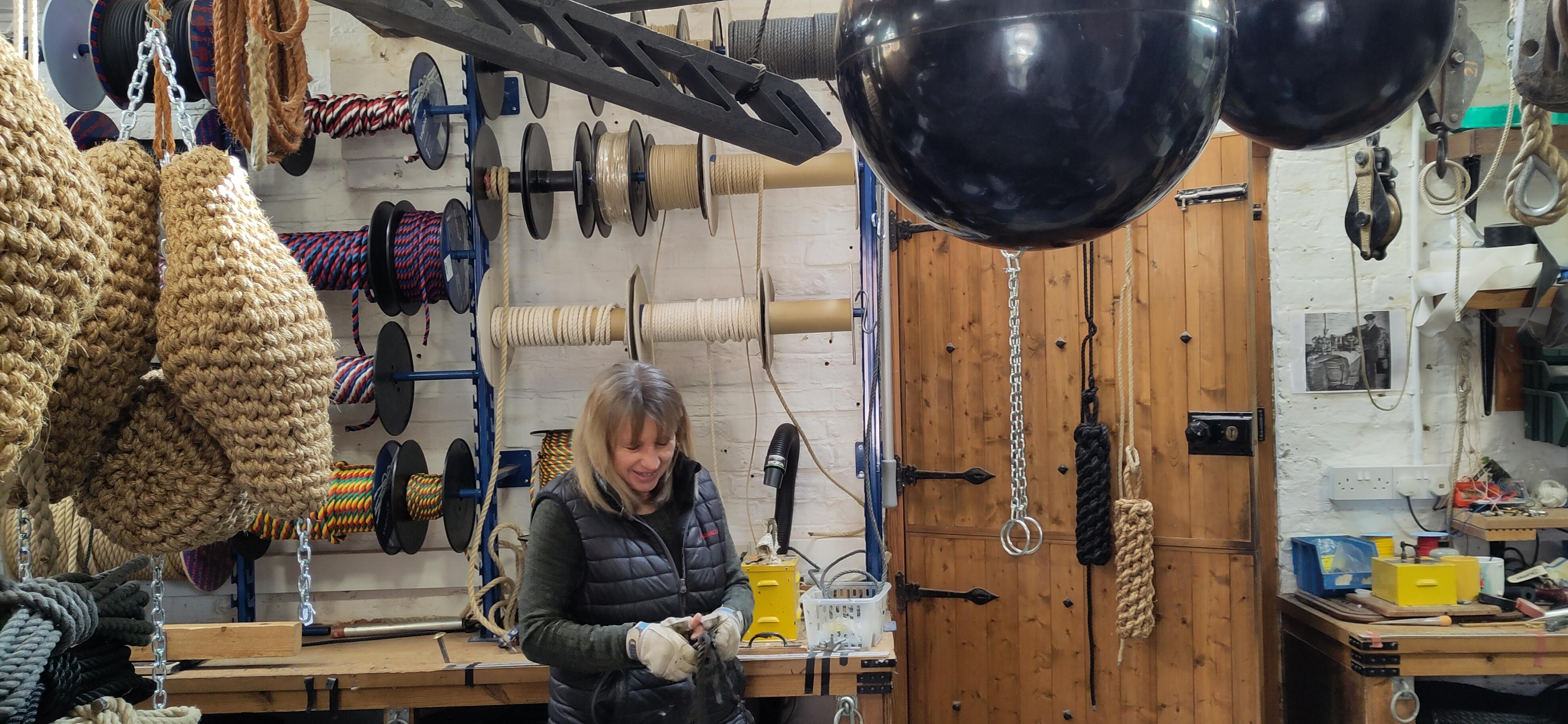 After our tasty lunch we went into Braunston marina and visited a little niche shop called “Tradline Rope And Fenders”. On a previous visit we had watched a man handmaking a fender in traditional rope knotting. Our back rope had acquired a nick in it and we didn’t want it to give unexpectedly so we went to see their range. The shop was empty and the lady asked if she could help. They had plenty of rope for sale by the metre, but she offered another service, we’d not expected. Did we want the rope cut and respliced? Shane had been thinking some short ropes with ready made loops could be handy for quick short term use and had seen them in the shop, called strops. So rather than buying them ready made we nipped back and swapped over our thin mooring rope for an older thicker one stored in the locker. We went back and she set about cutting, splicing, and making newloops there and then, producing a short strop and a medium strop from our rope. I have several meaning for the word strop now and I learned a new word as she told me the tool she used when making the loop was a Swedish fid.