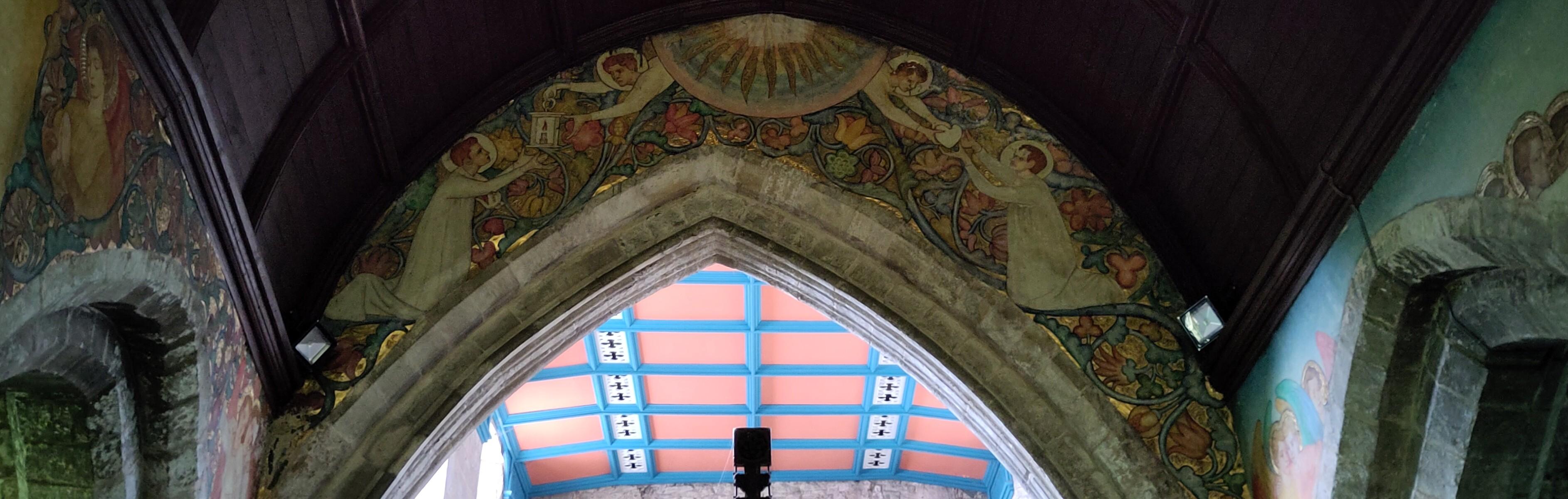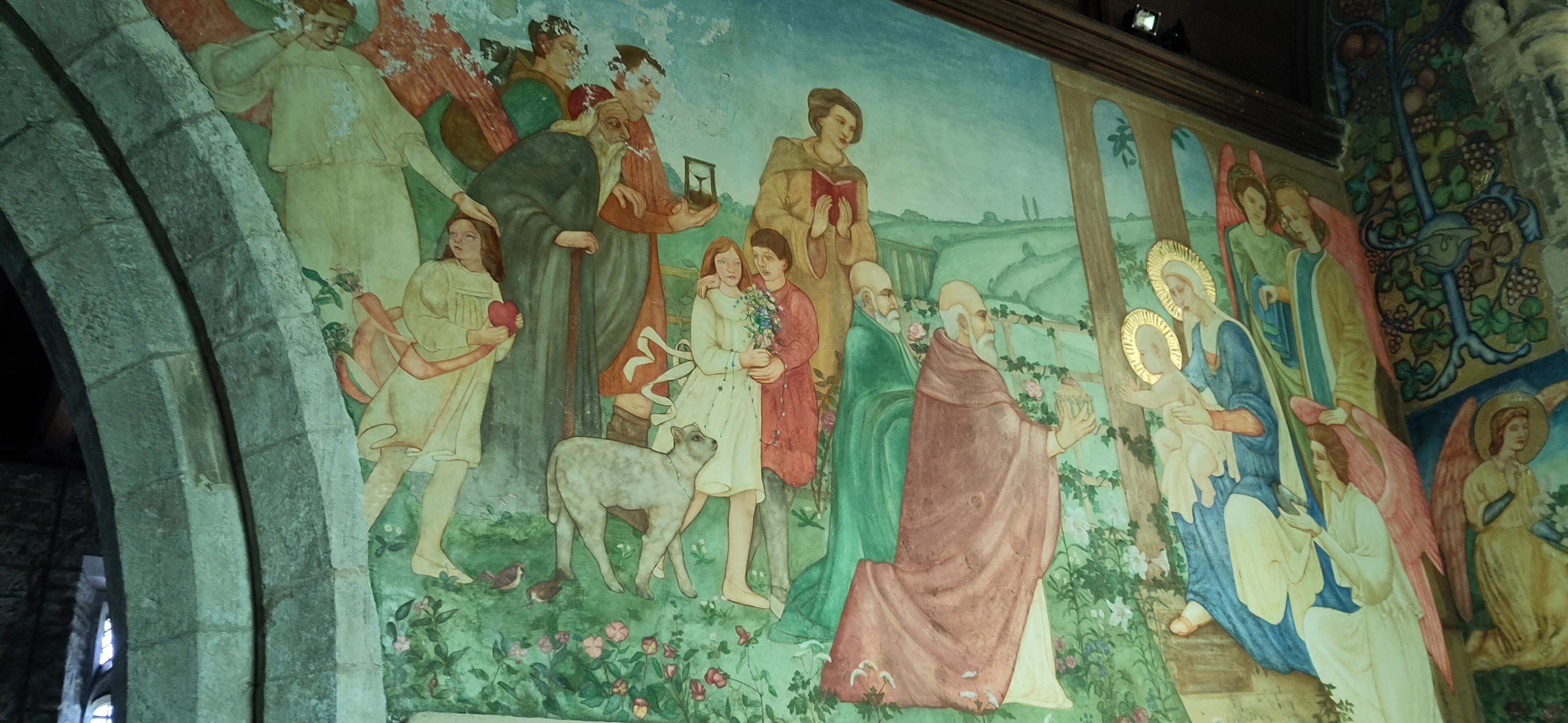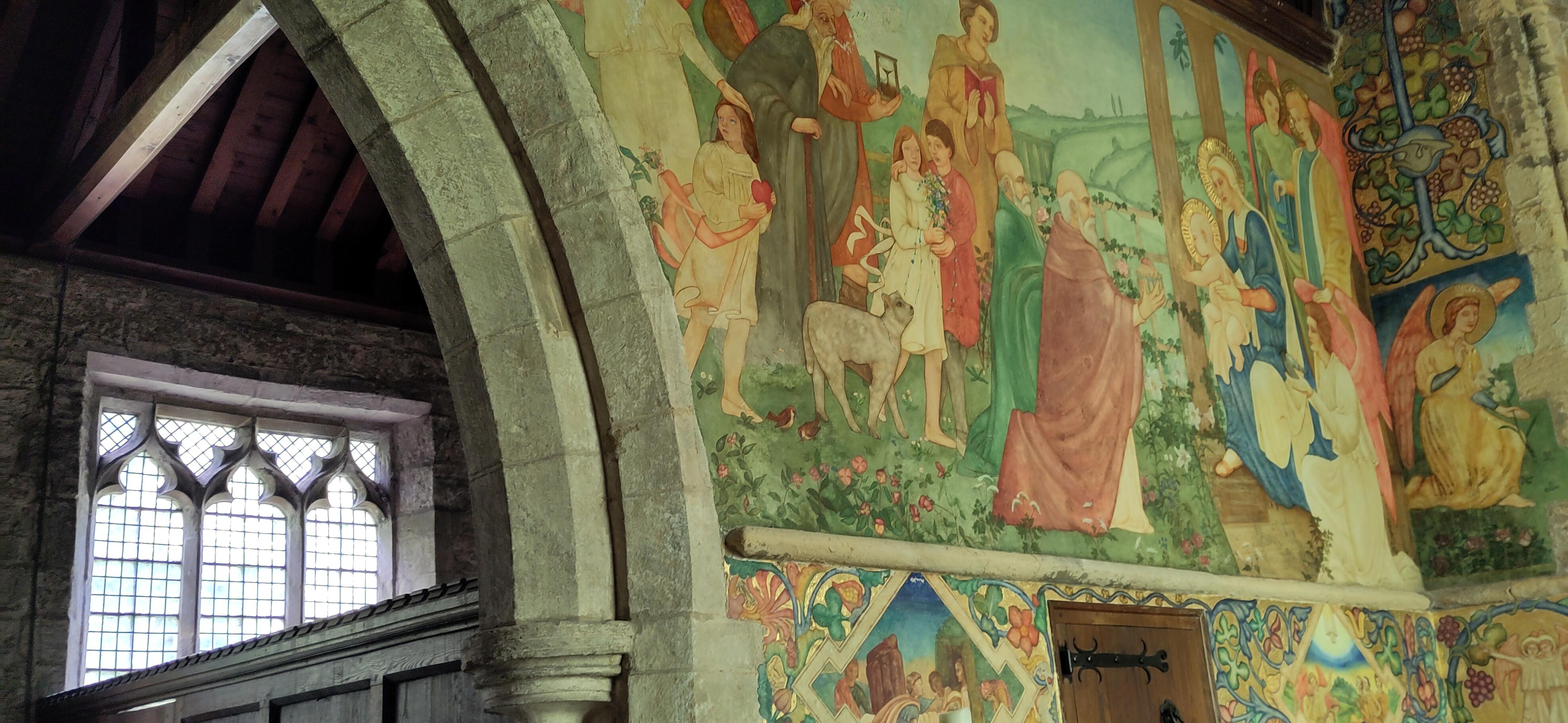 I achieved my goal of finding buttons for sale at Retford market. We were all pleased the water was deeper beyond Retford and that we moved along well. We had a good distance to cover but Shane had seen something of interest that he had a notion to visit en route, a little church. Its claim to fame was the murals inside, by Phoebe Anna Traquair. Unusually for a woman artist of the time, she managed to continue her art, not as a mere hobby, but commissions for large works, while married and having four children. One of her works we have seen before at the chapel of rest at the old children’s hospital. It was a place for parents and not the general public and when the site was sold it was preserved and we got a chance to see it as it was opened for the public with explanatory talks.