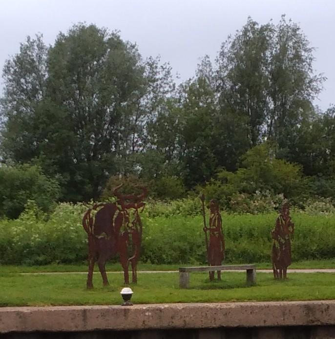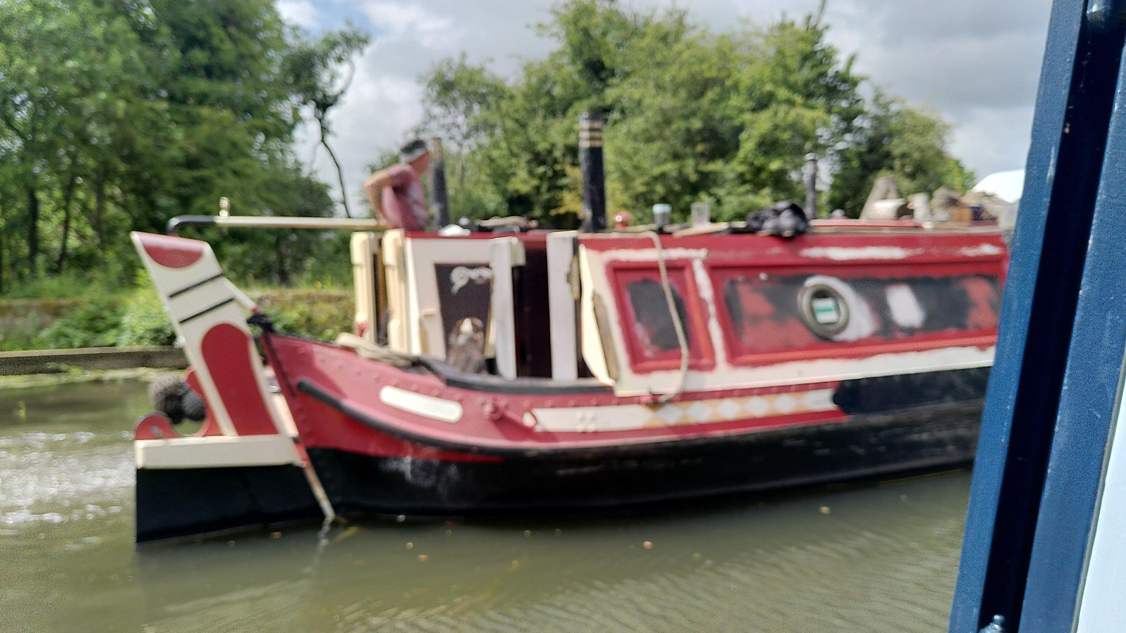 I was impressed with their slick manoeuvres. We set off ourselves and headed for water. A day trip hire boat came close to us but managed to get past, only by driving themselves through the trees at the other side.I called out that going through the trees was all part of the adventure. The driver smiled, waved and apologised saying “sorry, as you can see we have no idea what we are doing!” They then came back over to our side to moor up. We had about finished getting water and headed off towards a bridge. From the front I gestured there was a boat coming in case Shane hadn’t seen it. Often at a bridge hole there is a judgement about whose bridge it is and who will wait to let the other through. There are no give way lines or signs about who has priority. I wasn’t sure which of us was nearer but the closer we both got, the more obvious it was that, unusually, this bridge was, wide enough ( and high enough) to allow two boats to pass under it and so we met exactly under it, and crossed smoothly.