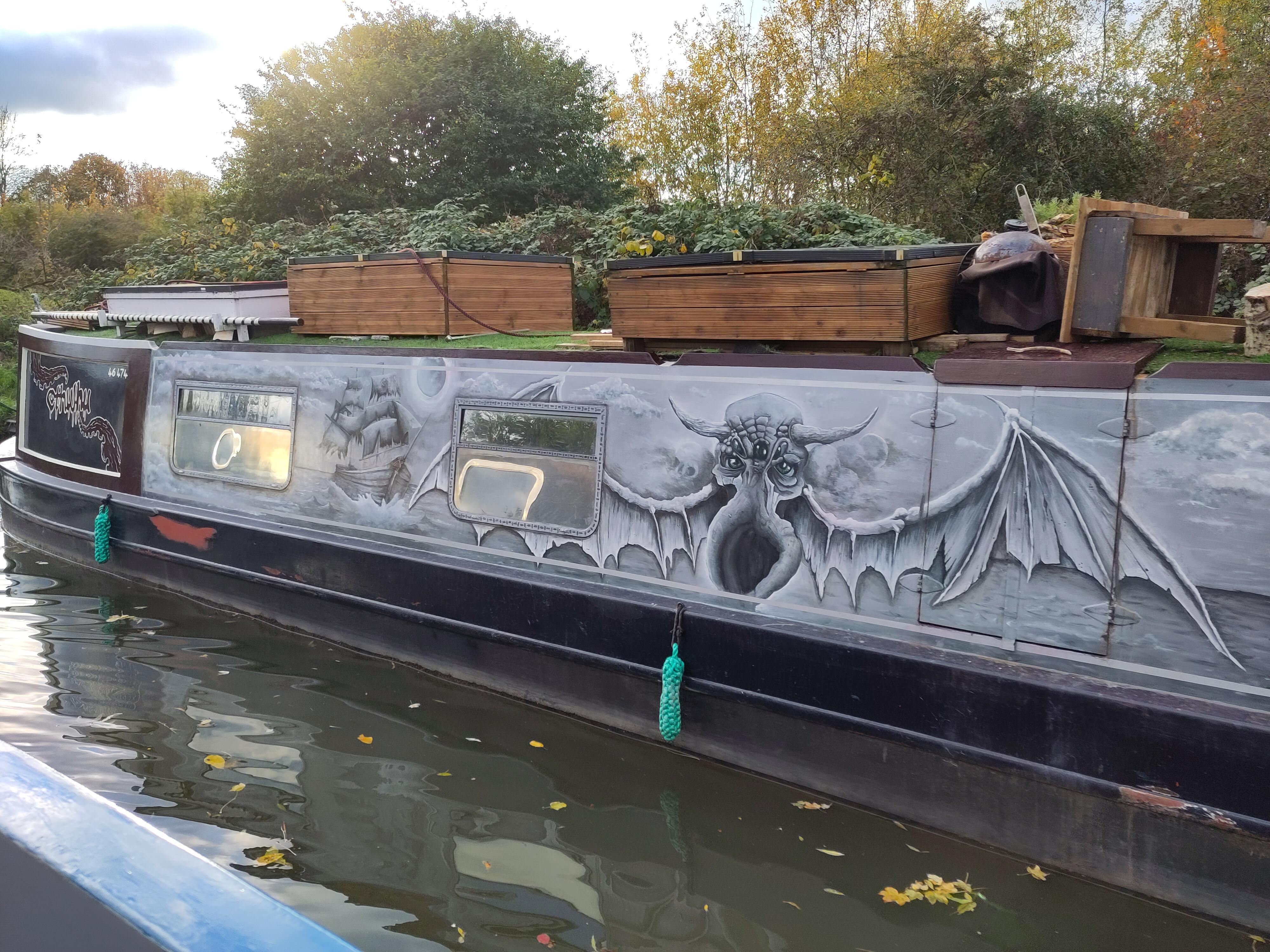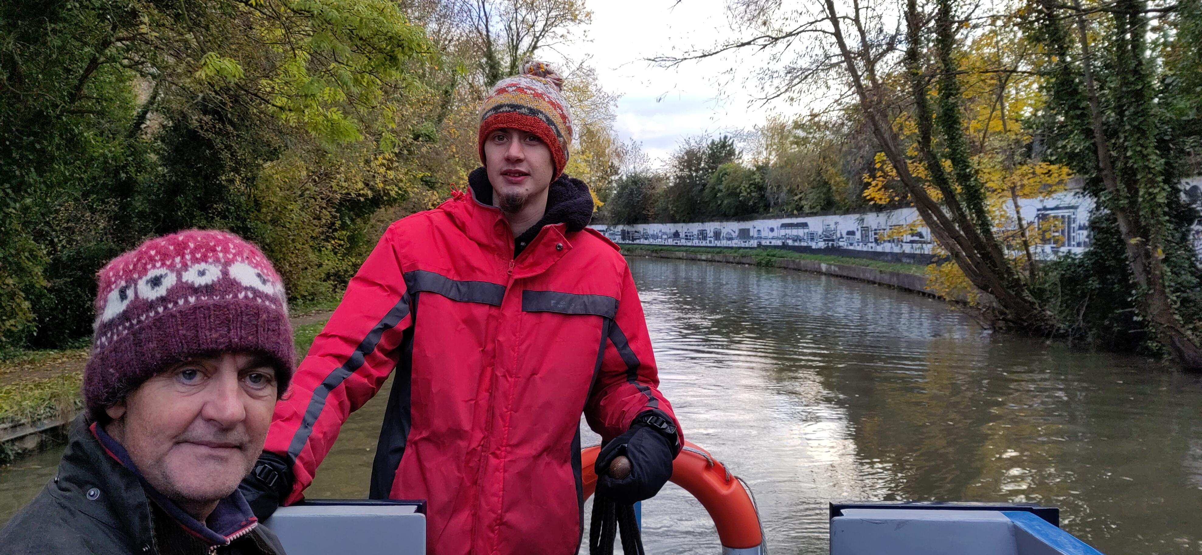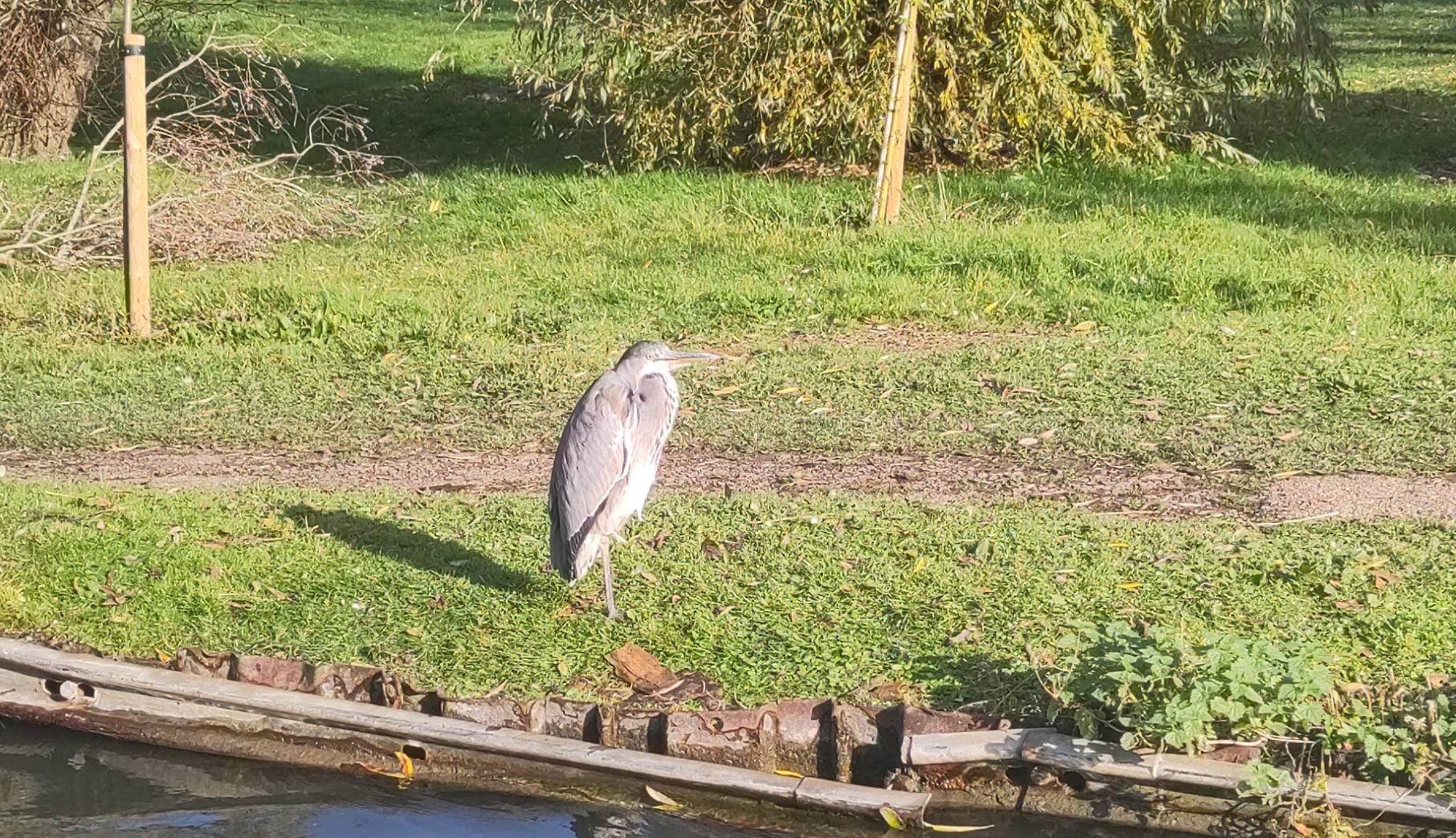 It was an excellent day for kingfisher sightings, starting with a boat named “Kingfisher” (a different one from the one we’d previously been on – which we passed yesterday). Later, a spot of lustrous blue caught my eye in a bush on the side, and as I tried to draw Clare’s attention to it, it took wing, darting ahead and confirming my suspicion that I’d seen a kingfisher. The kingfisher went on for a while, darting ahead whenever we got close, until we lost sight of it at a bridge. Later in the day we had another sighting much like the first, a streak of blue darting ahead of us as we went along.