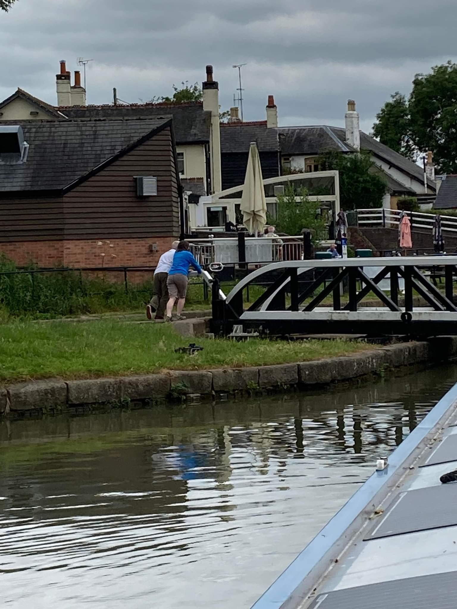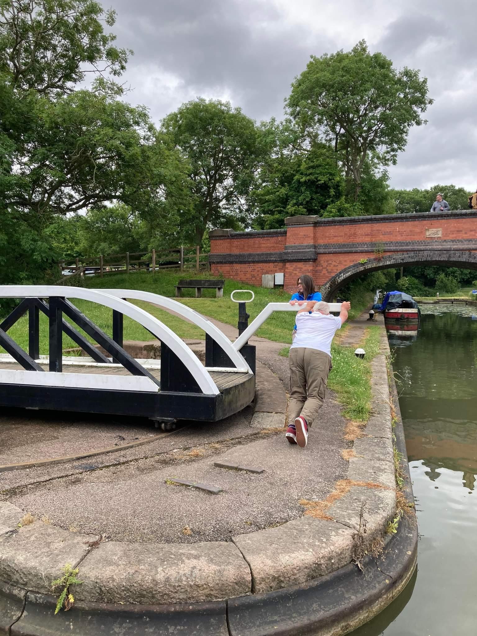 After a blether and beverage, we headed towards the basin, and I was preparing to do the small pedestrian swing bridge there. Shane had done it last time and not reported it as problematic. It was half open with a man standing at it but it wasn’t clear what he was doing and we couldn’t see anyone else lining up. When I got there, his explanation was that he couldn’t get it to close again. I said we would manage no bother with two of us, but now we needed it open. Wendy recorded the joint effort and it was a piece of cake (oh no that was later…thanks for the cake Wendy, it is all finished now).