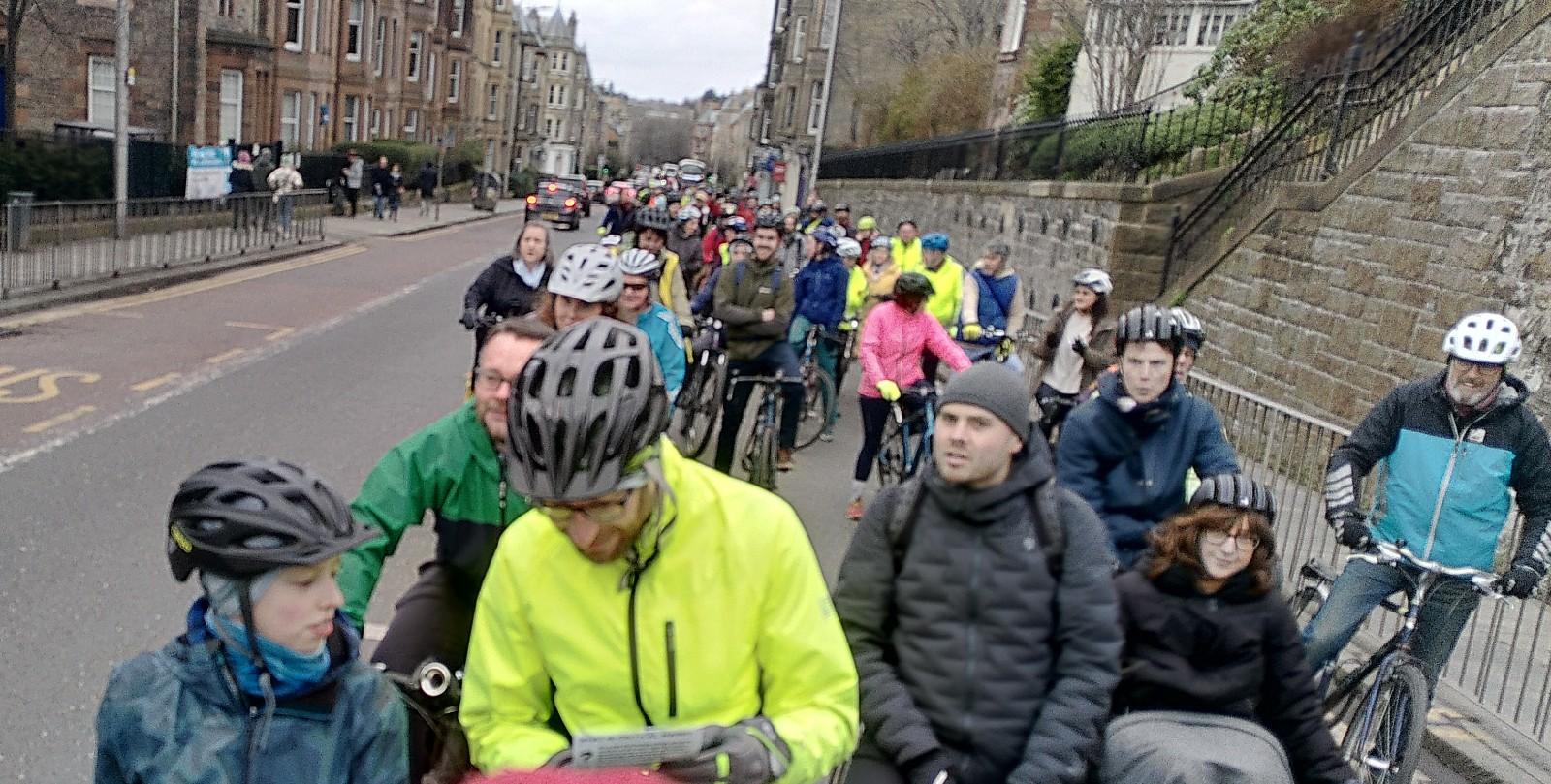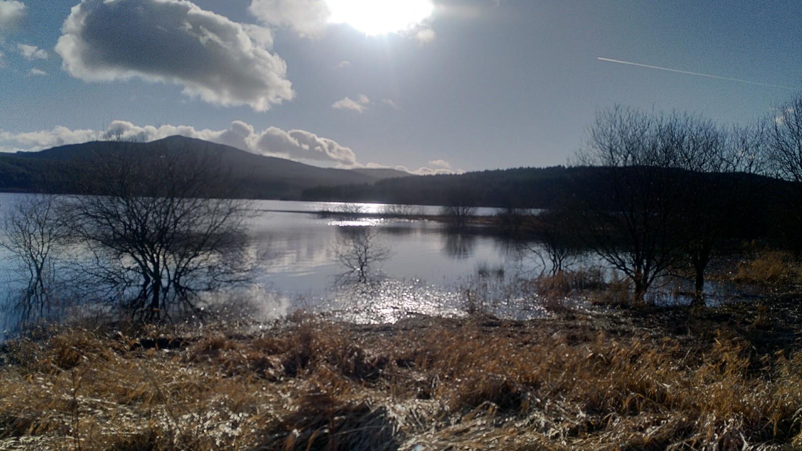 We climbed up the hill to Kippen where we’d planned to stop for lunch. Warmed by the climb, and with shelter from the buildings, we decided to eat outside in the warm sun. Soup and a sandwich still left room for a cake. At the top of the village, we joined the pretty lane which avoids the slightly busier road for the rest of the climb. We swooped down through Fintry then up to and along the Carron Valley Reservoir.