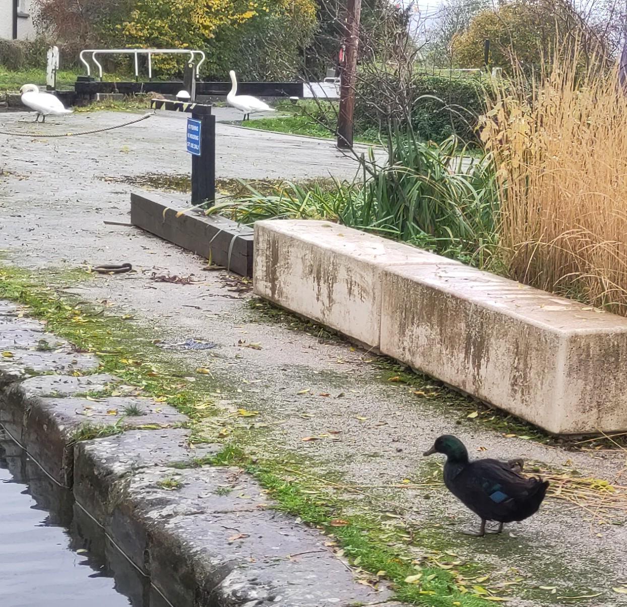 The afternoon brought more locking. The canal’s levels were high, with some locks having waterfalls over the top of their gates. We encountered a wide boat going the other way to us just after a junction, he’ll be going a different route to the one we’d just covered since the locks we’d been through were narrow ones. Carrying on, I hopped off to open an already half-open swing bridge. I got it open, but found it wouldn’t shut; it got stuck halfway, just like we found it! Luckily, a walker on the towpath lent me a hand in closing it before crossing the bridge. As the day continued, we went from going up to going down locks, making progress which put us ahead of schedule on our way towards the marina where Bartimaeus will spend the winter.