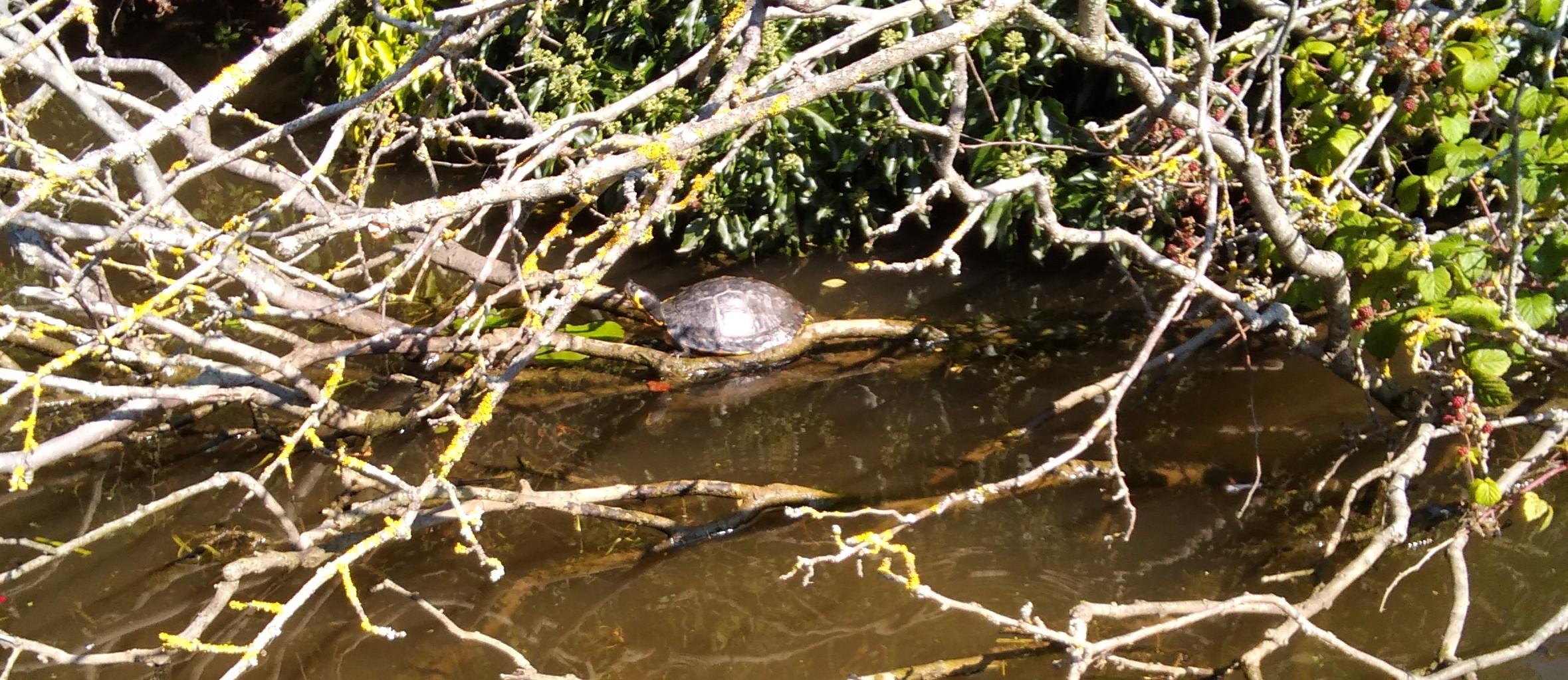 When Heather was driving she suddenly shouted “turtle!” I’ve never seen that before. It wasn’t in the water but sitting on a branch – even stranger! We reversed to get a good look. We all had just enough time for a picture, then it moved and became unseated and flailed its legs, but quickly got purchase and disappeared into the water.