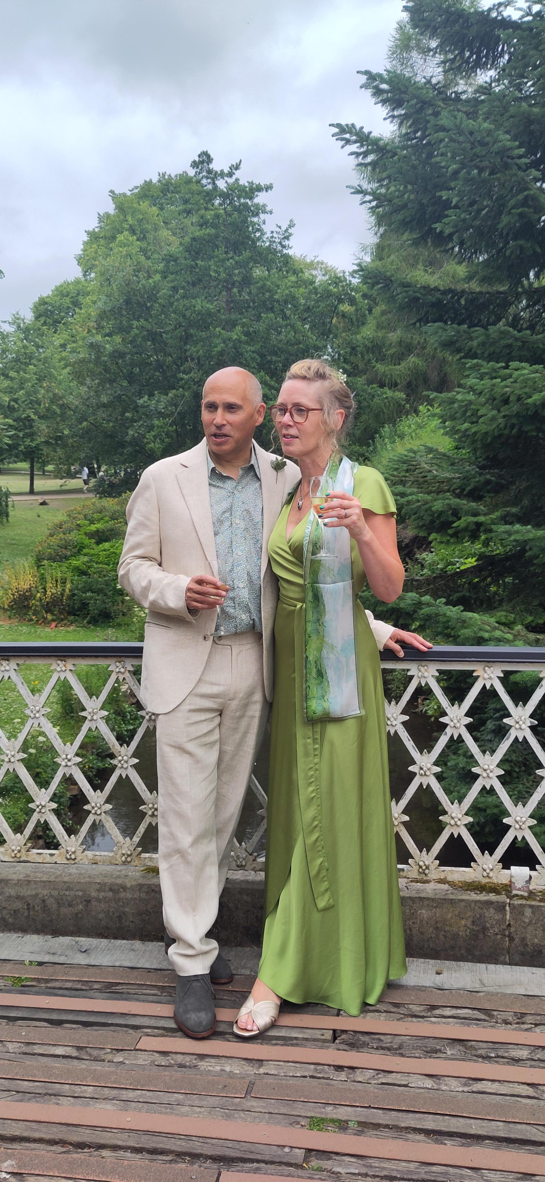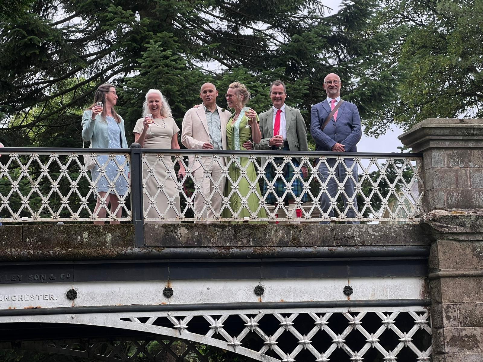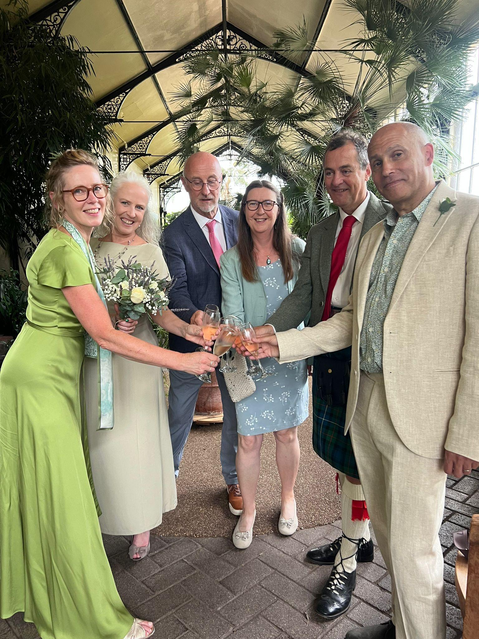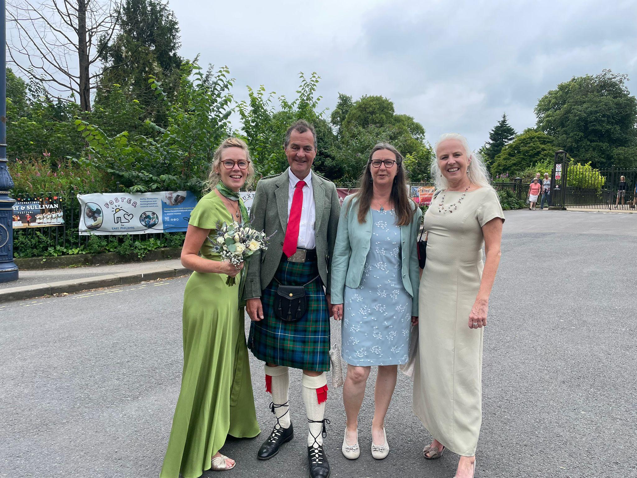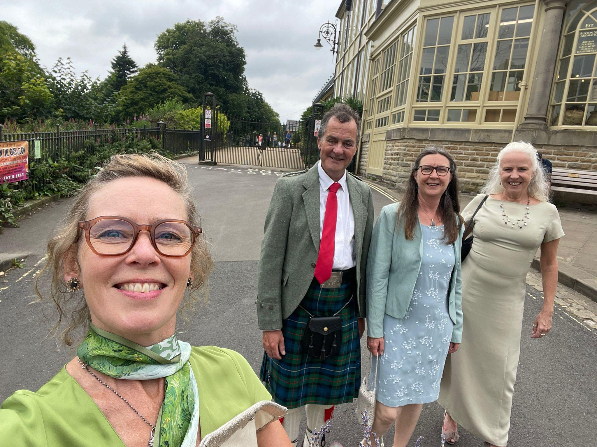 In the morning of the wedding, we missed Richard at breakfast, but he followed us out of the hotel, as we set off a tad early to a cafe for a drink. The chaps had coffee and I had "apple love mint" tea, which I reckoned wouldn't show a stain on my clothes, even if I spilt it, compared to tea and coffee. Then we had the delightful surprise to see the other three in the party approaching. I was very pleased to discover that with no communication about it, we had chosen dresses in a similar colour range. I was glad I hadn't chosen the purple one and stuck with a duck egg shade.