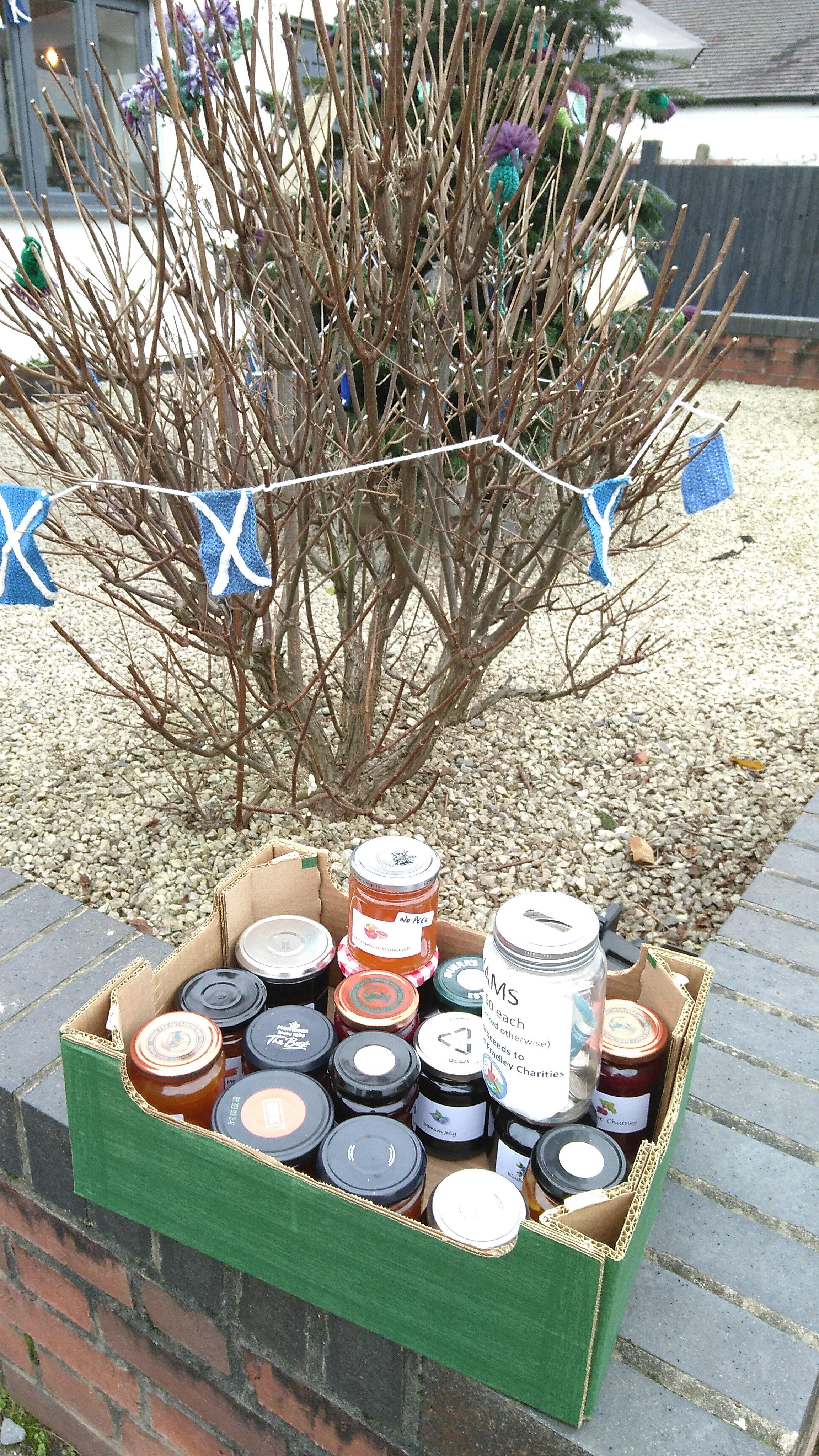 Last time I went shopping I wondered about getting more jam, but we still had a little. I remembered that we had had some good hauls at honesty boxes in August last year and wondered if that was just available in summer when there is a glut of soft fruit. We are currently enjoying, at breakfast, a particularly good jar from a farm shop in Great Haywood, that is very like home made jam. This morning, before leaving (but after the jammy breakfast) I went into town to get fresh bread for lunch. As I was approaching the small shop I saw the very thing I had been thinking about, not on a country lane or church, but on the Main Road. The contents was very varied. I chose 2 kinds of jam and two kinds of marmalade. Alrewas must be like “Ayr, which ne’er a own surpasses, for honest men and bonnie lasses”.