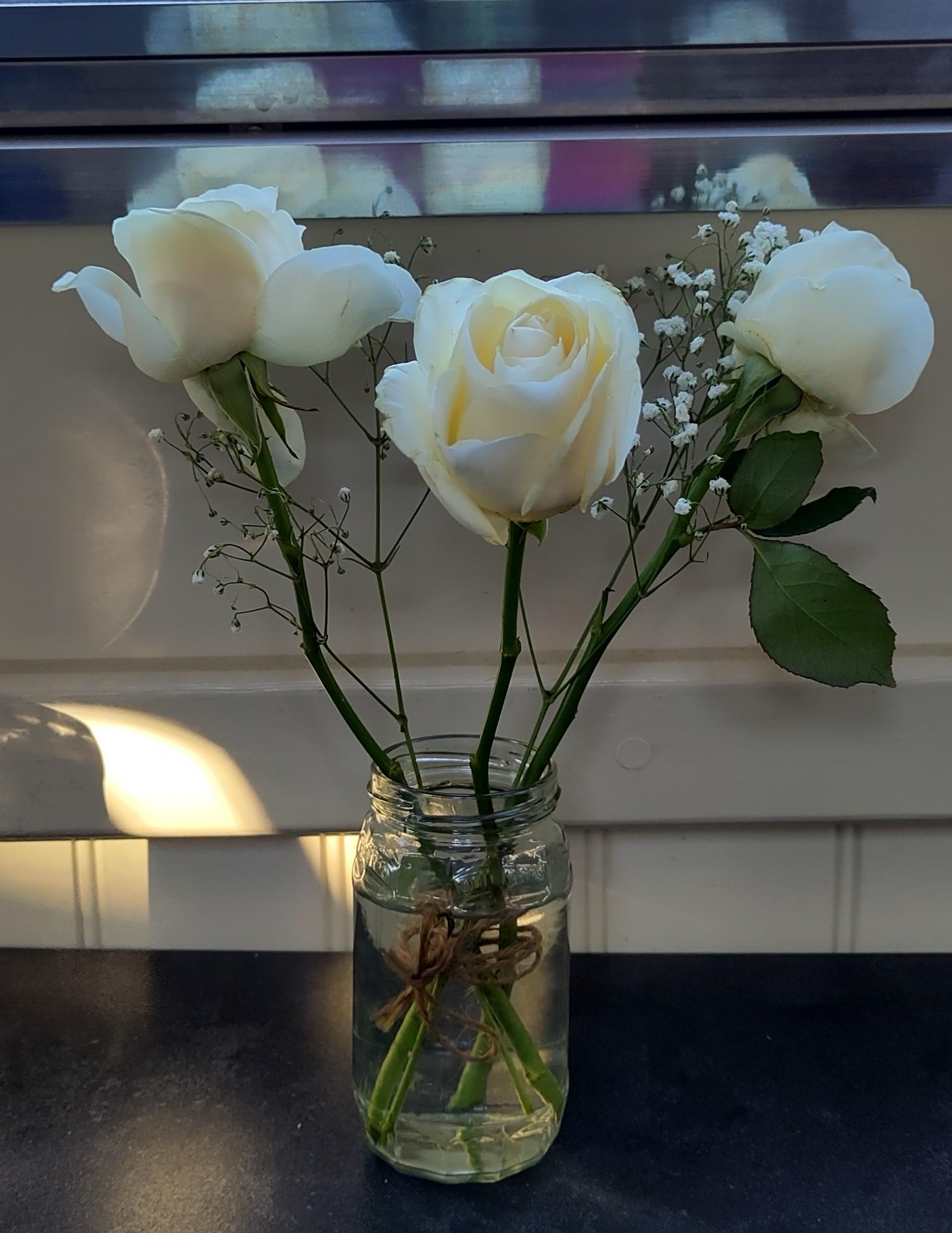 On the train I had charge of Lorna's bouquet of thistle, lavender and white roses and other greenery to keep for drying. Nye was going to take it back to Edinburgh. Lucky he had come along! Lorna had included some roses and gypsophila I could keep, so the first job back on the boat was to find a suitable container, fo them.