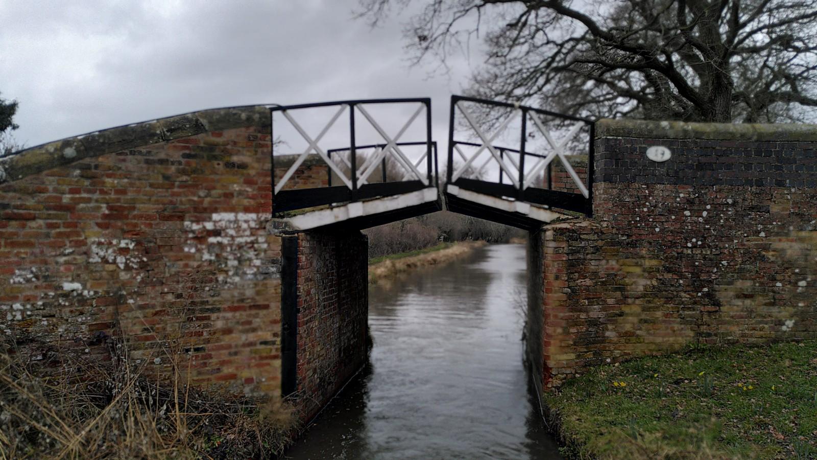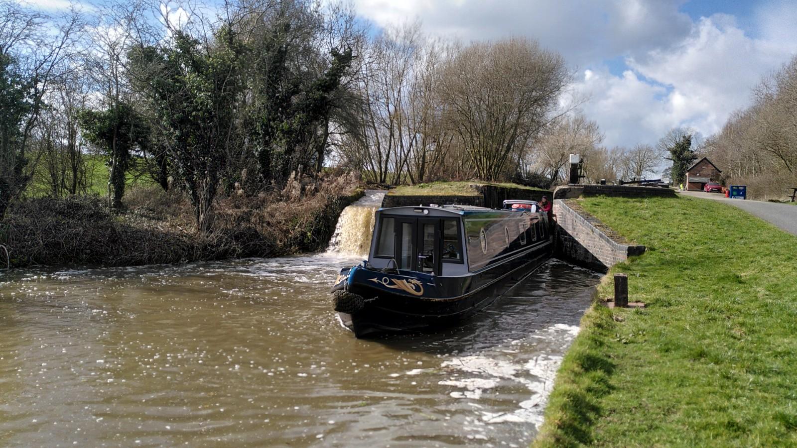 The day started bright and yesterday’s blustery wind had blown away. Despite that, the air was cold, so we put on a lot of layers before setting off. The towpath was still extremely muddy, so neither of us went ahead as we approached the day’s first lock. As it turned out, that was a good decision – the lock was not only set our way, but the head gate was sitting open, so we just cruised straight in. The additional benefit of this situation when locking down is that it is very easy for someone to get off the boat to work the lock – no ladders involved.