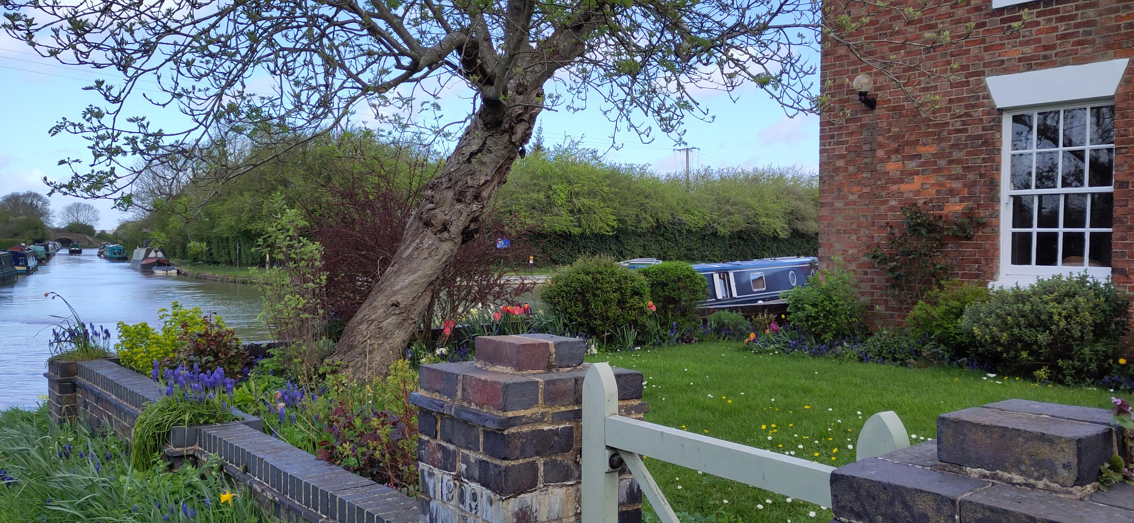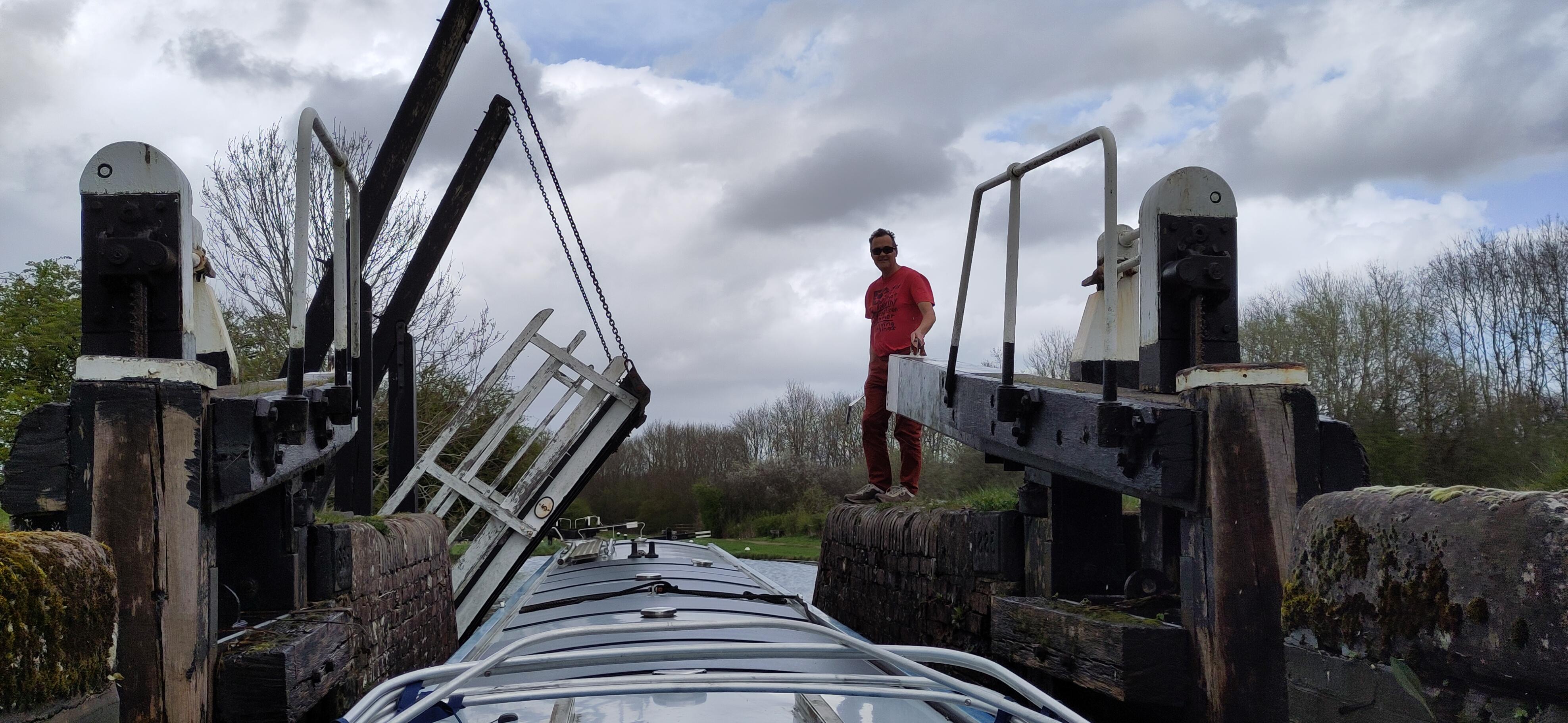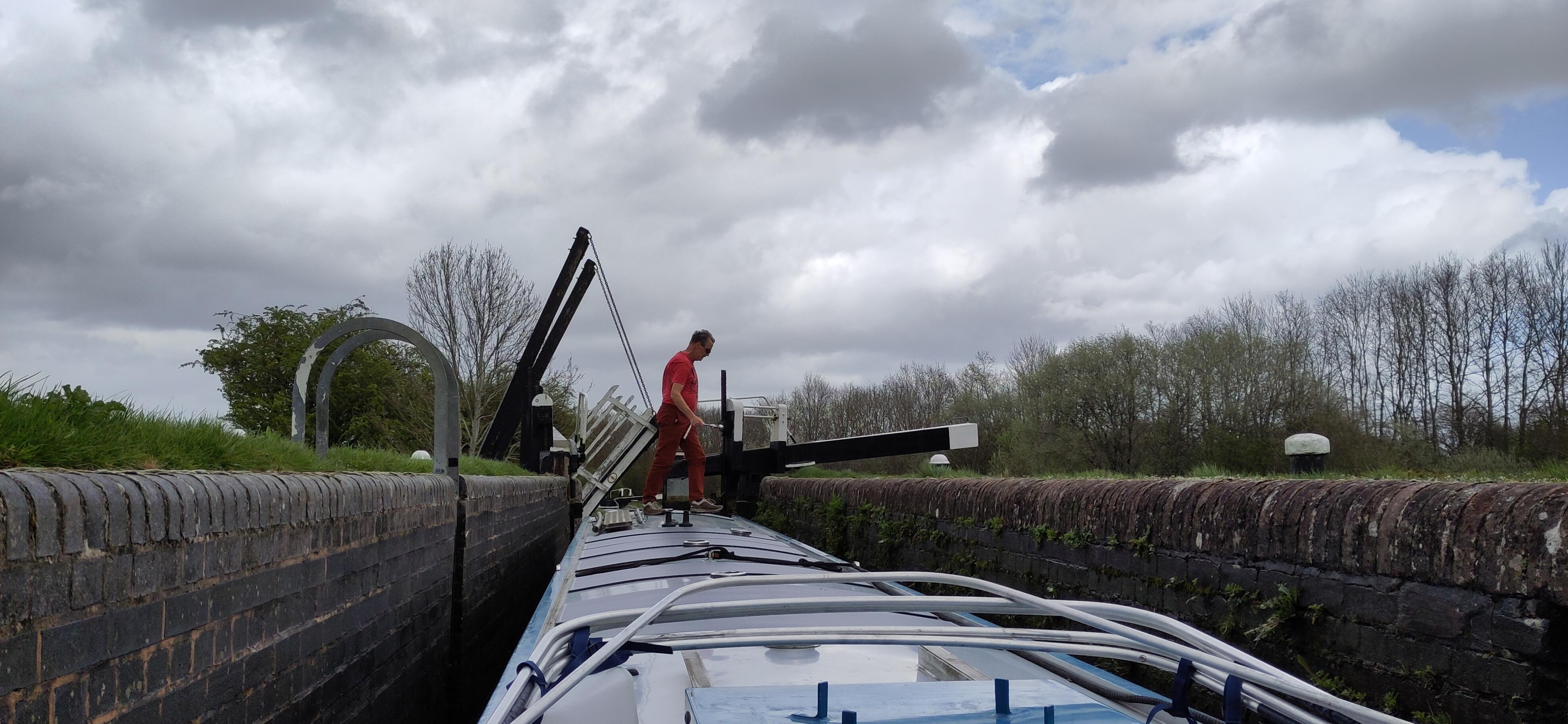 Shane set off and squeezed along past Gayton marina where boats were moored three deep, and we stopped to have lunch before tackling the flight. In deference to my knee, I took the tiller when we got to the lock and Shane took the windlass. At the first lock he got no peace as, first one, then two, excitable collies sniffed his toes and circled him, looking eagerly for snacks, of which he had none. As he went to the next lock a third collie emerged and trotted after him. Nobody was with them but they didn’t stray far from home and ceased following him.