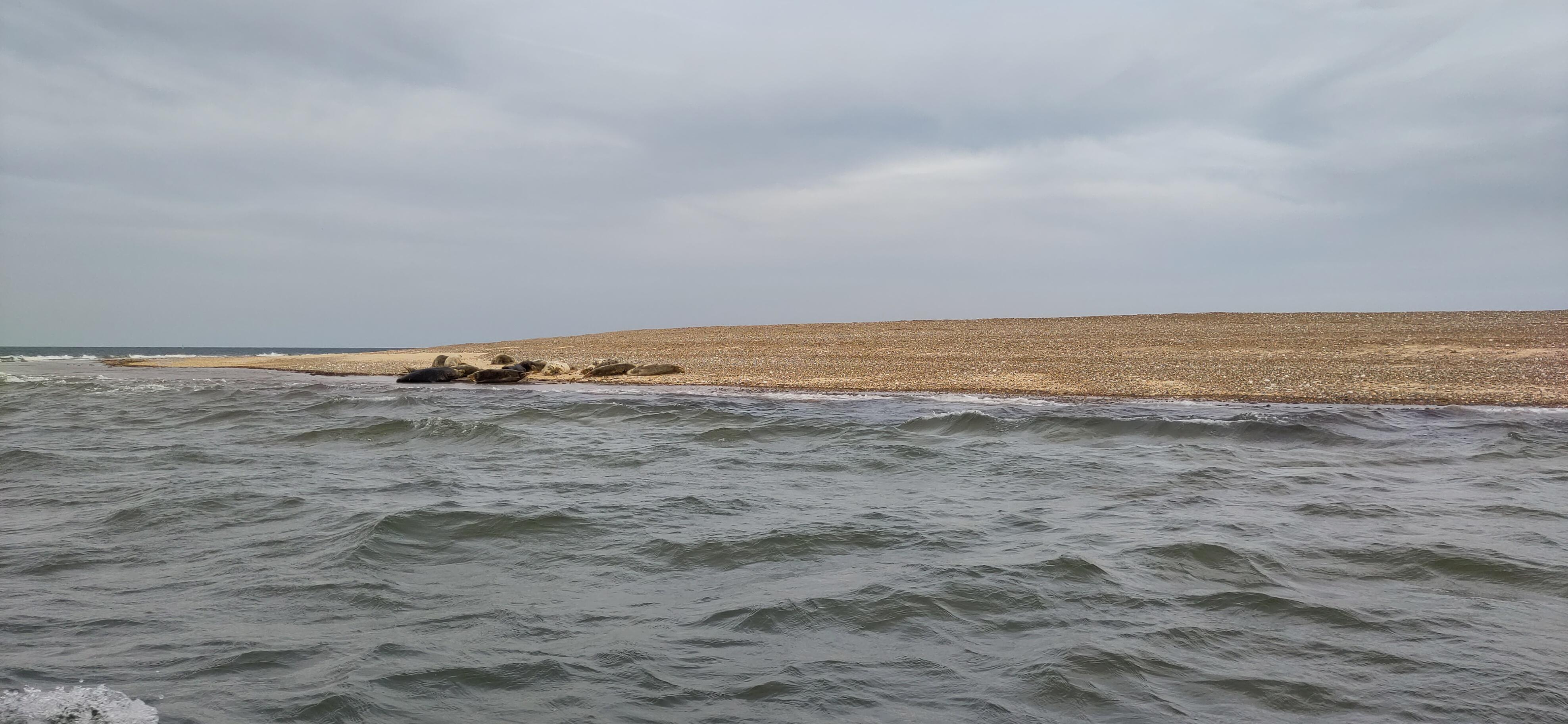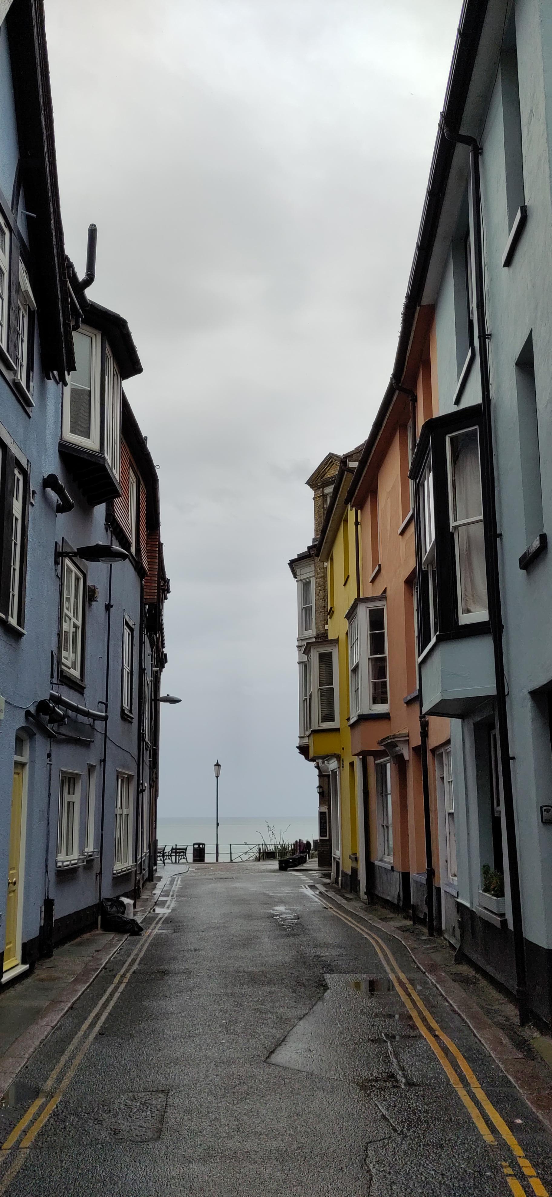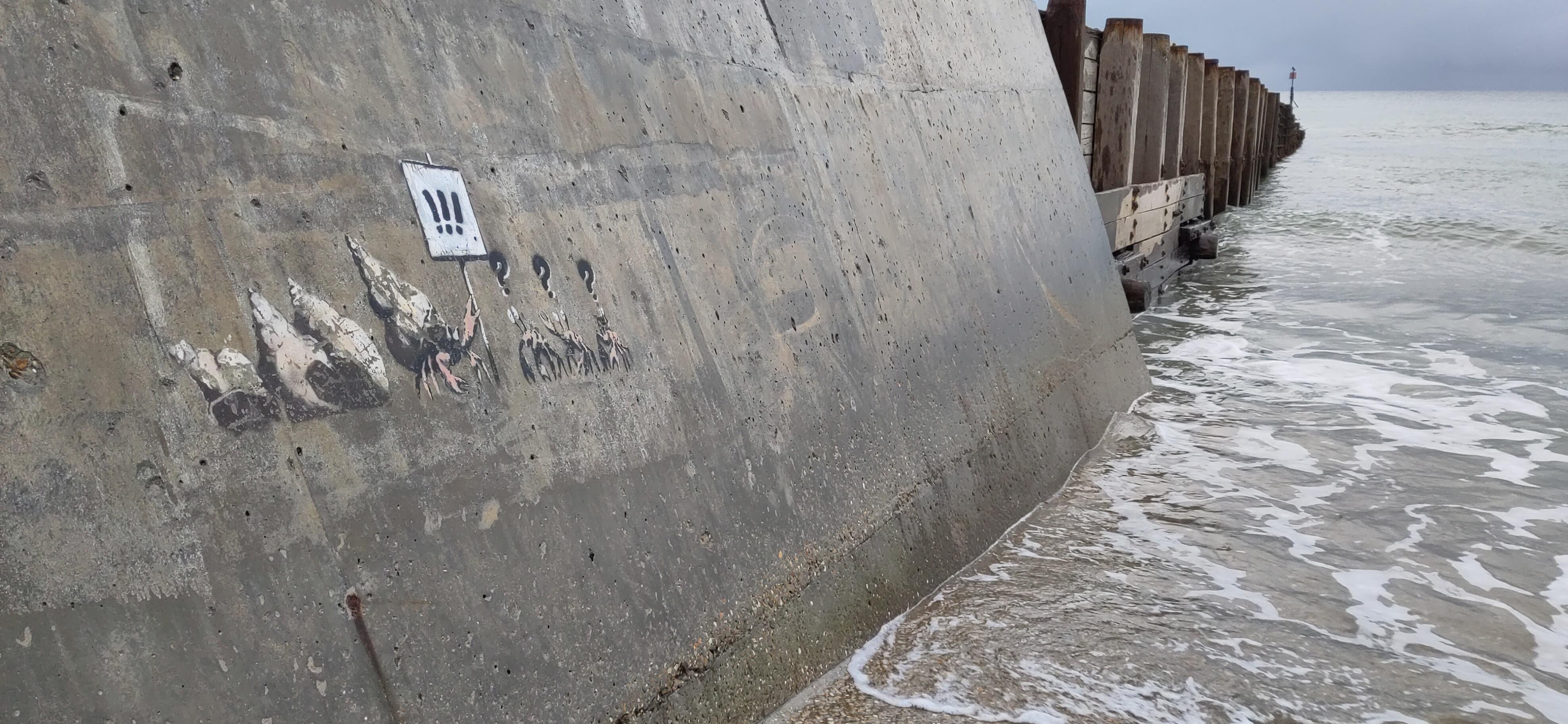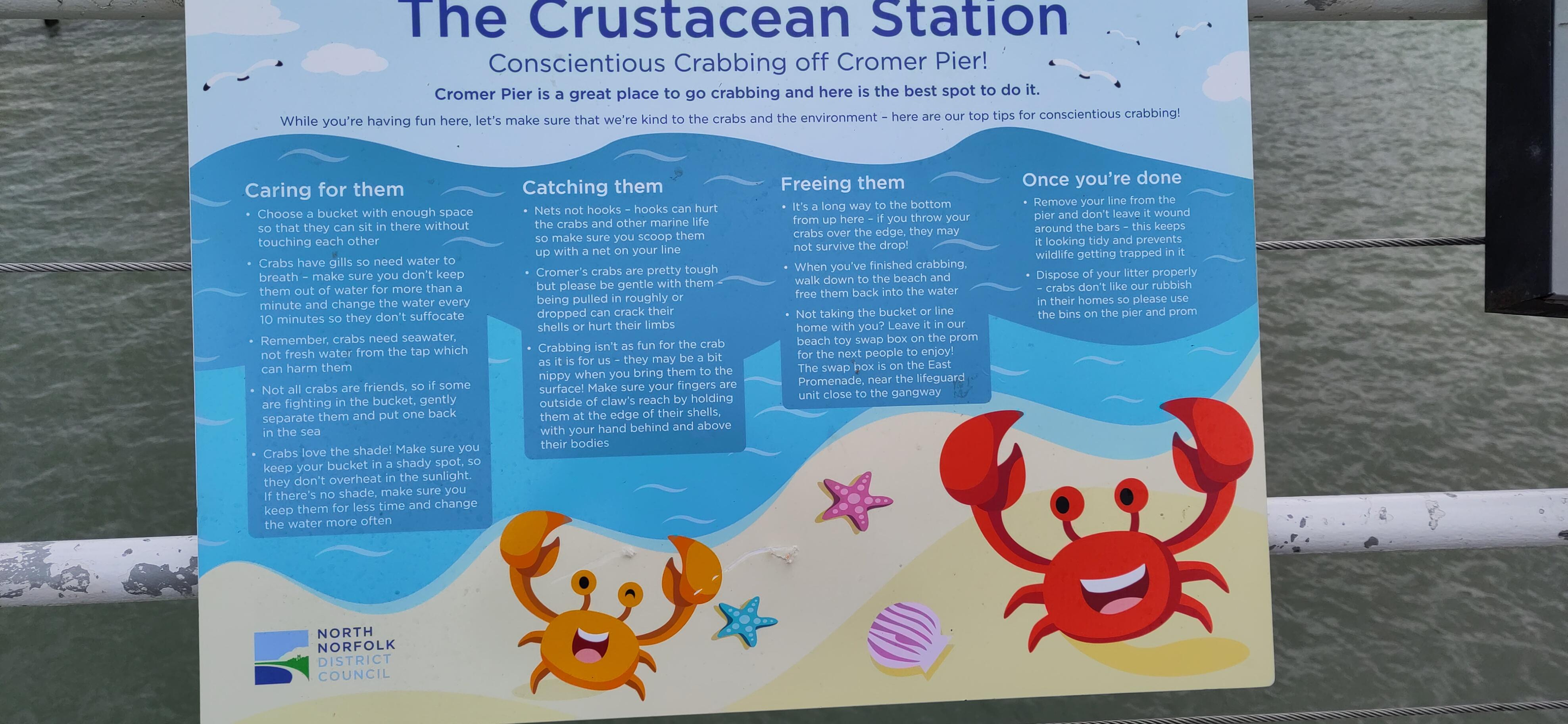 The rain had abated when we left the church, so to complete the Cromer experience I fancied a walk along the beach to get closer to the beach huts. Shane, David and Nye had headed back but Bryn and I enjoyed the multicoloured flint shingle, finding many “witch stones” with holes worn through the centre, and took one back to Nye. The beach huts were even more multicoloured. At the end was a Banksy of crabs without a home, feeling slightly guilty that locals are priced out of housing by the holiday accommodation market.