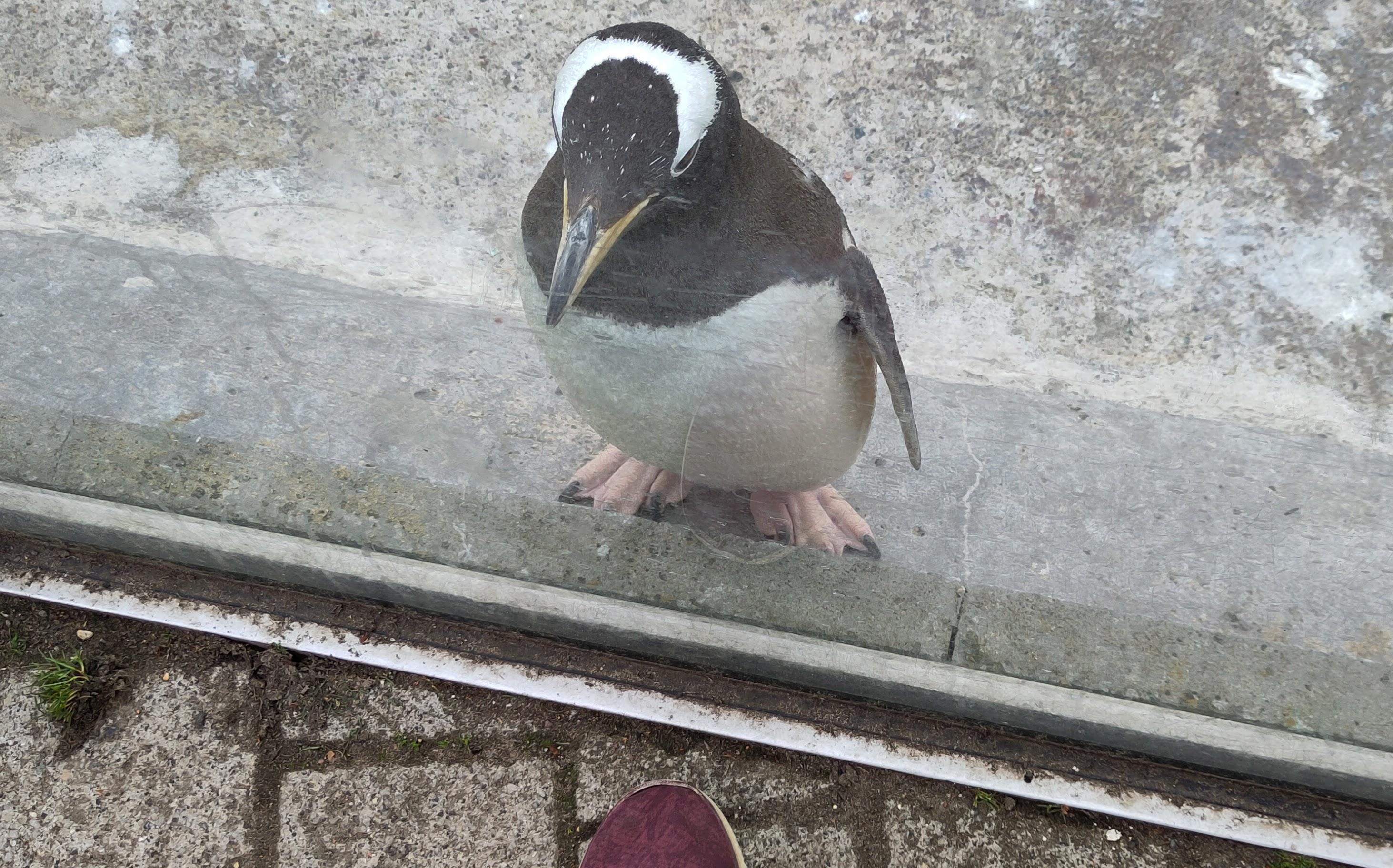 Later on from another area, we could see some penguins away from nests. They were coming right to the edge and reminded me of the ducks that had visited our boat, tapping their beaks, but this time I was outside and the birds were on the inside looking out, though it was an outdoors enclosure. Perhaps it thought there was another penguin there , reflected in the perspex, ‘who was looking in and who is looking out?, it might be wondering.