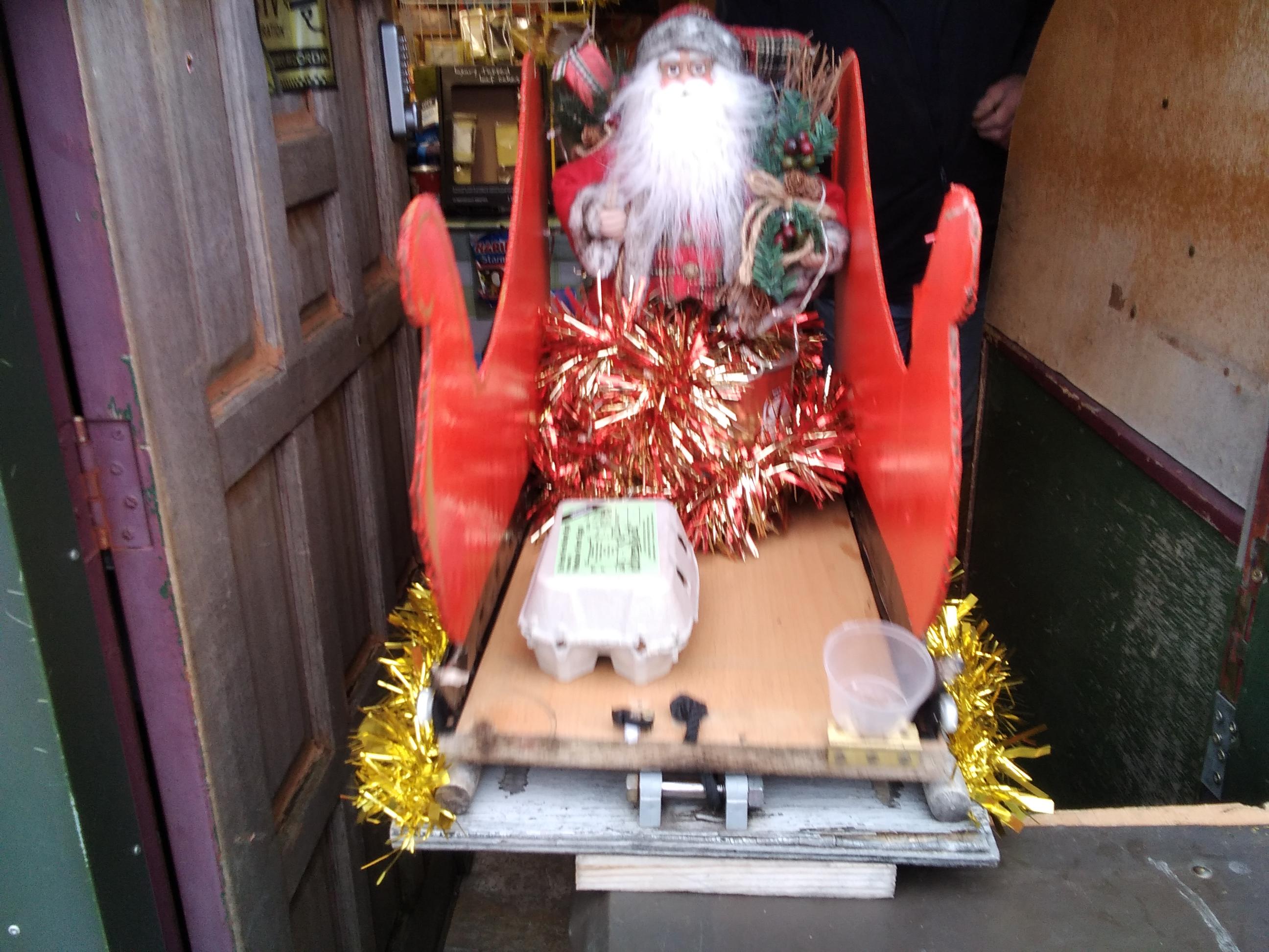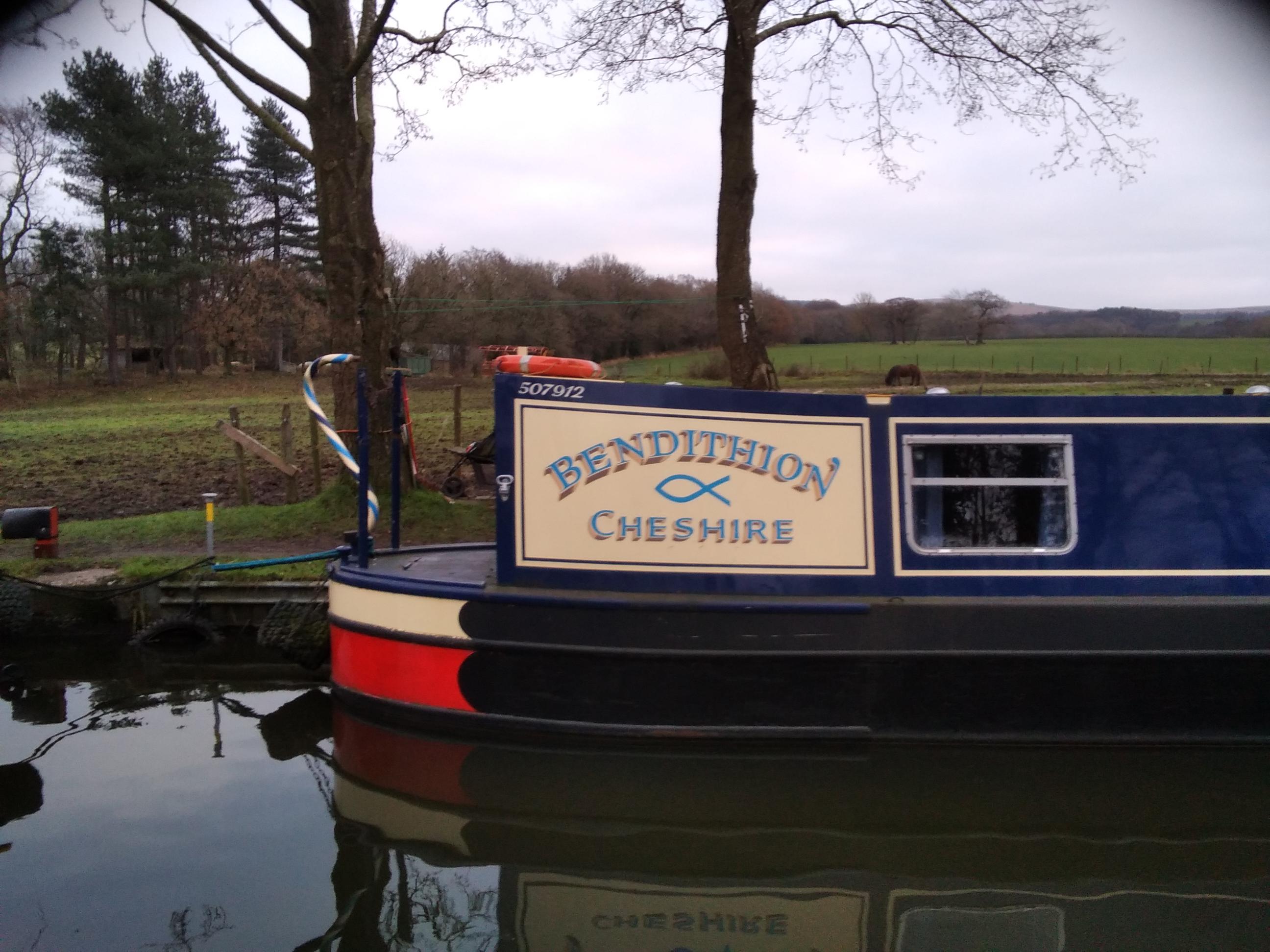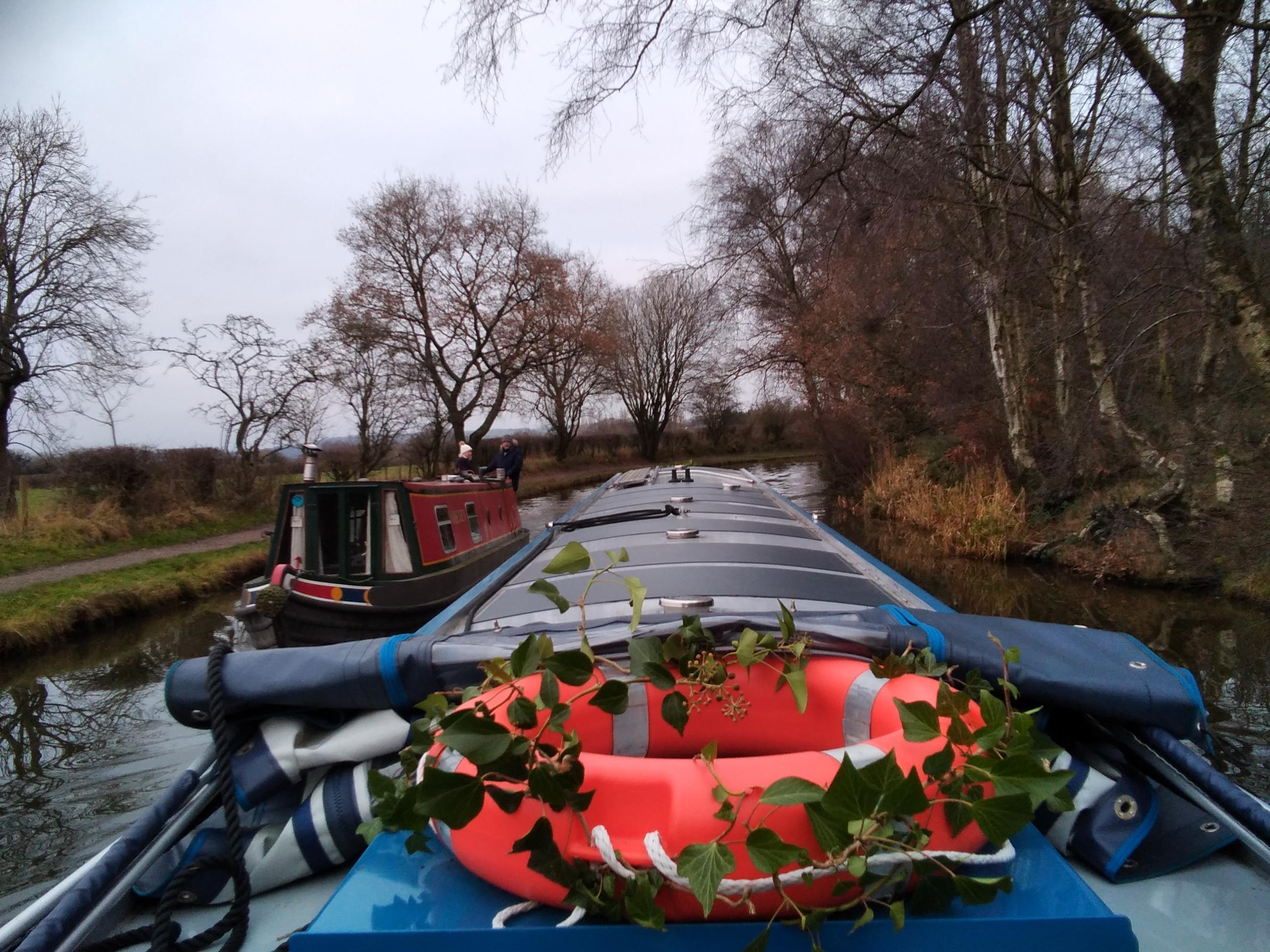 We have now arrived in Marple and got moored 5 minutes from Nye and David’s flat. I put some finishing touches on the tree in its new position and did some more wrapping and arranged some presents under the tree. Then we went round to see Nye, David and Bryn. There was a pile of post for us at Nye’s – a redirected card from a schoolfriend of mine, a card from a schoolfriend of Bryn and Nye’s for all of us, a present for me from a friend, Margaret, a pay slip of back pay, for me and a huge pile of books that Shane had ordered for himself! I admired their original decoration theme – Christmas tree frogs. Bryn and Nye cooked a tasty pasta bake for us. We look forward to a few more meetings over the next few days. Shane is just finishing unwrapping all those books. We’re going to need a bigger shelf!