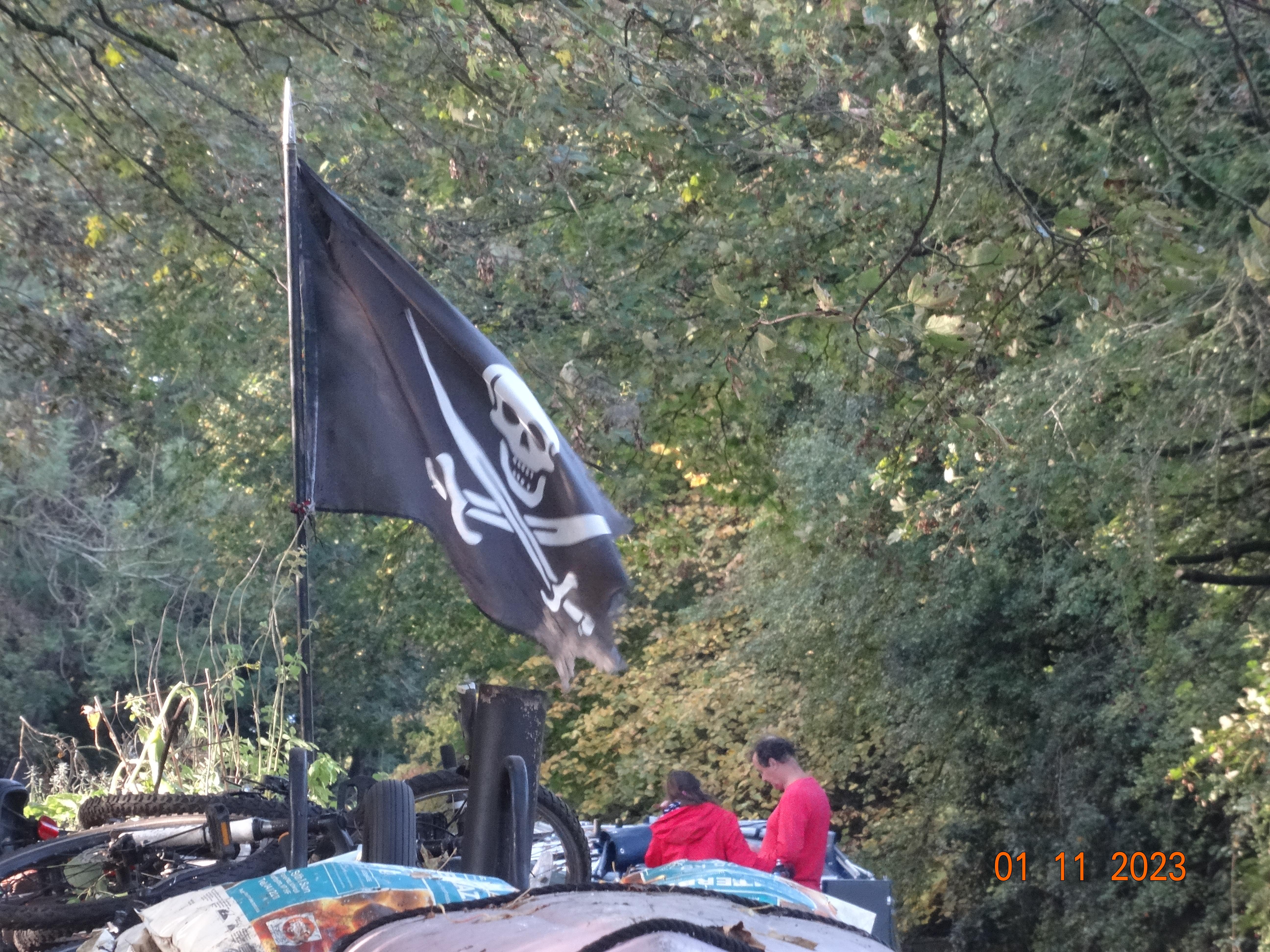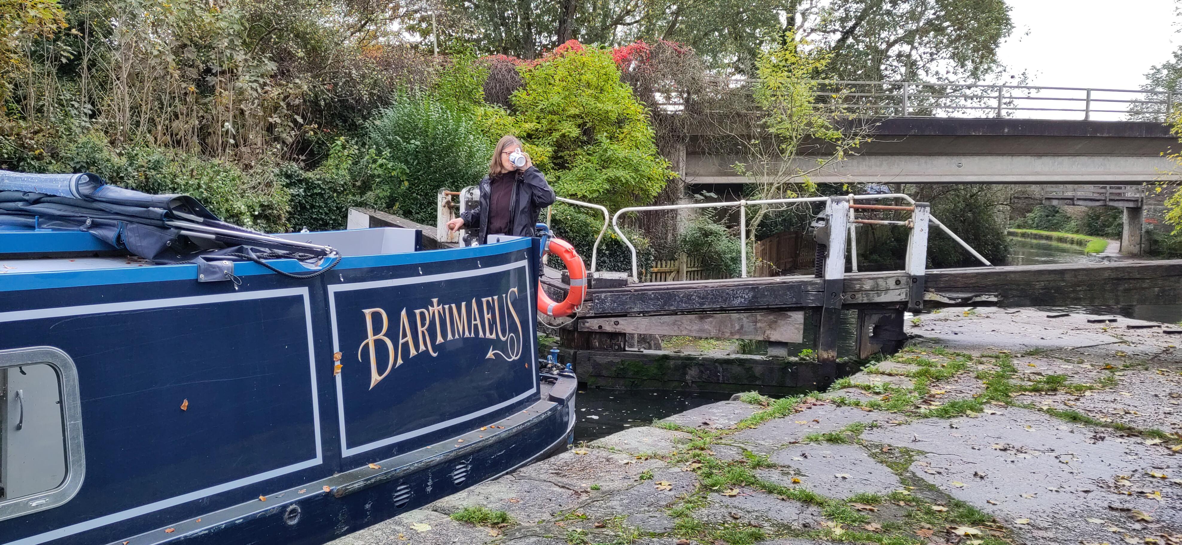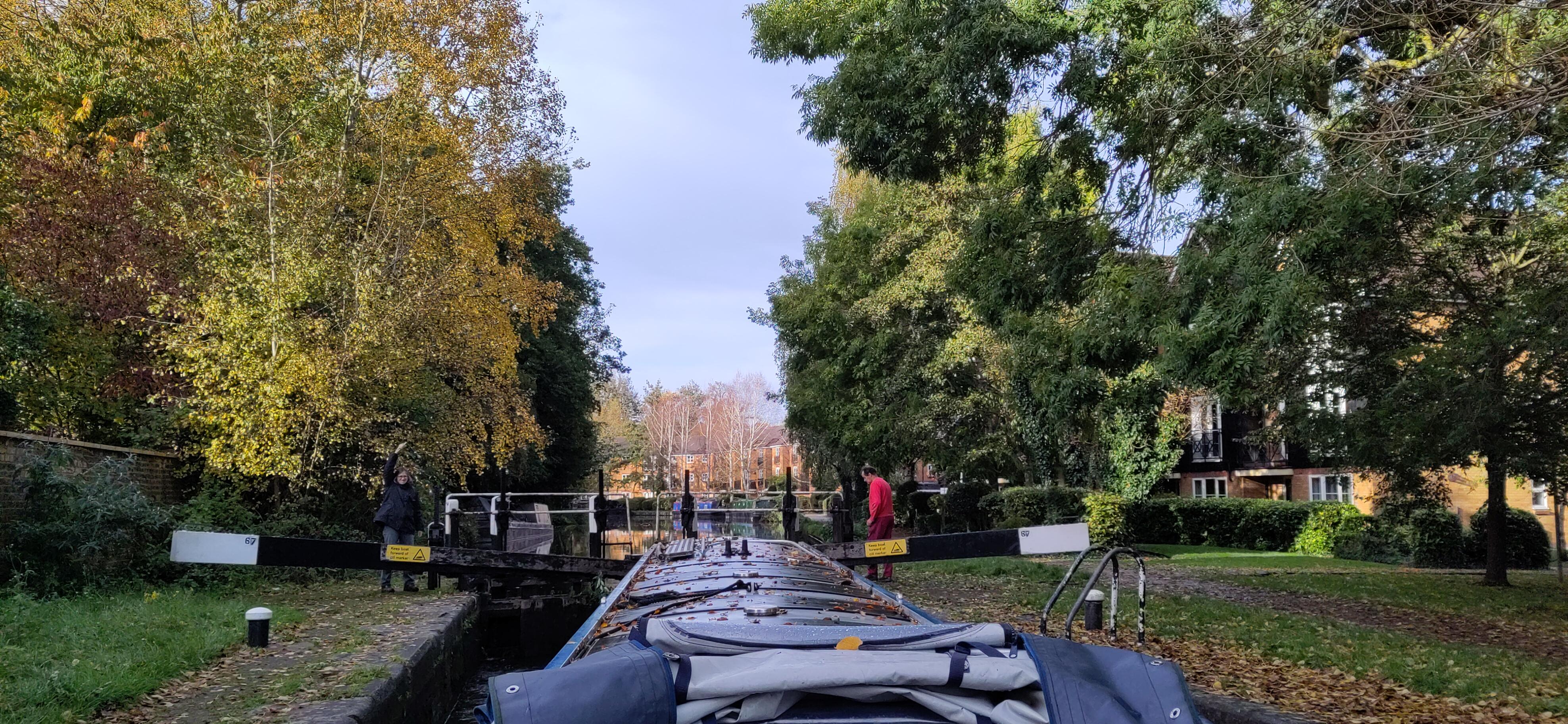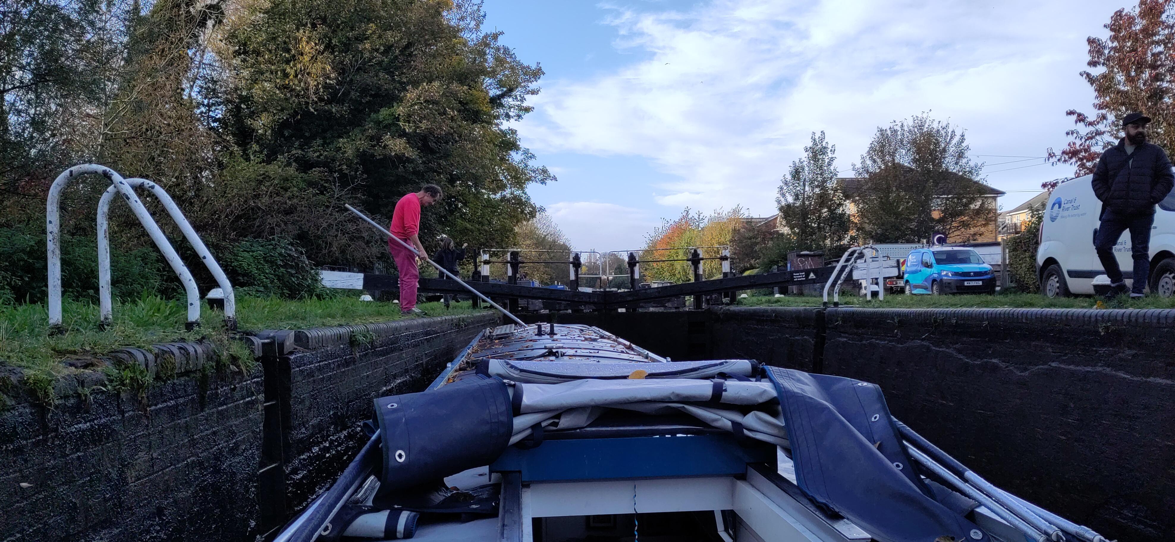 Shane had his own windlass issue today too. At one lock, while Heather was trying to deal with the recycling and catch us up, he was hurrying to do the lock alone and his windlass slipped off the gate arm and off the platform. When Heather arrived, she passed me the bin and hurried to start winding the other end but he had to tell her to stop as he couldn’t wind down his end as he’d dropped the windlass. Not again! This time it was fortunately not in the lock but in the bushes. He asked me to swing the boat across the lock so he could get to the boathook, while the lock was filling. He managed to retrieve the windlass and then found I wasn’t so near the side. He used the boathook again, but this time to pull the boat over where he could reach it and put the boathook back in its rightful spot – not sure what the family watching and videoing made of that but they seemed to enjoy the spectacle of boating shenanigans and shouted “well done!” as I exited the lock.