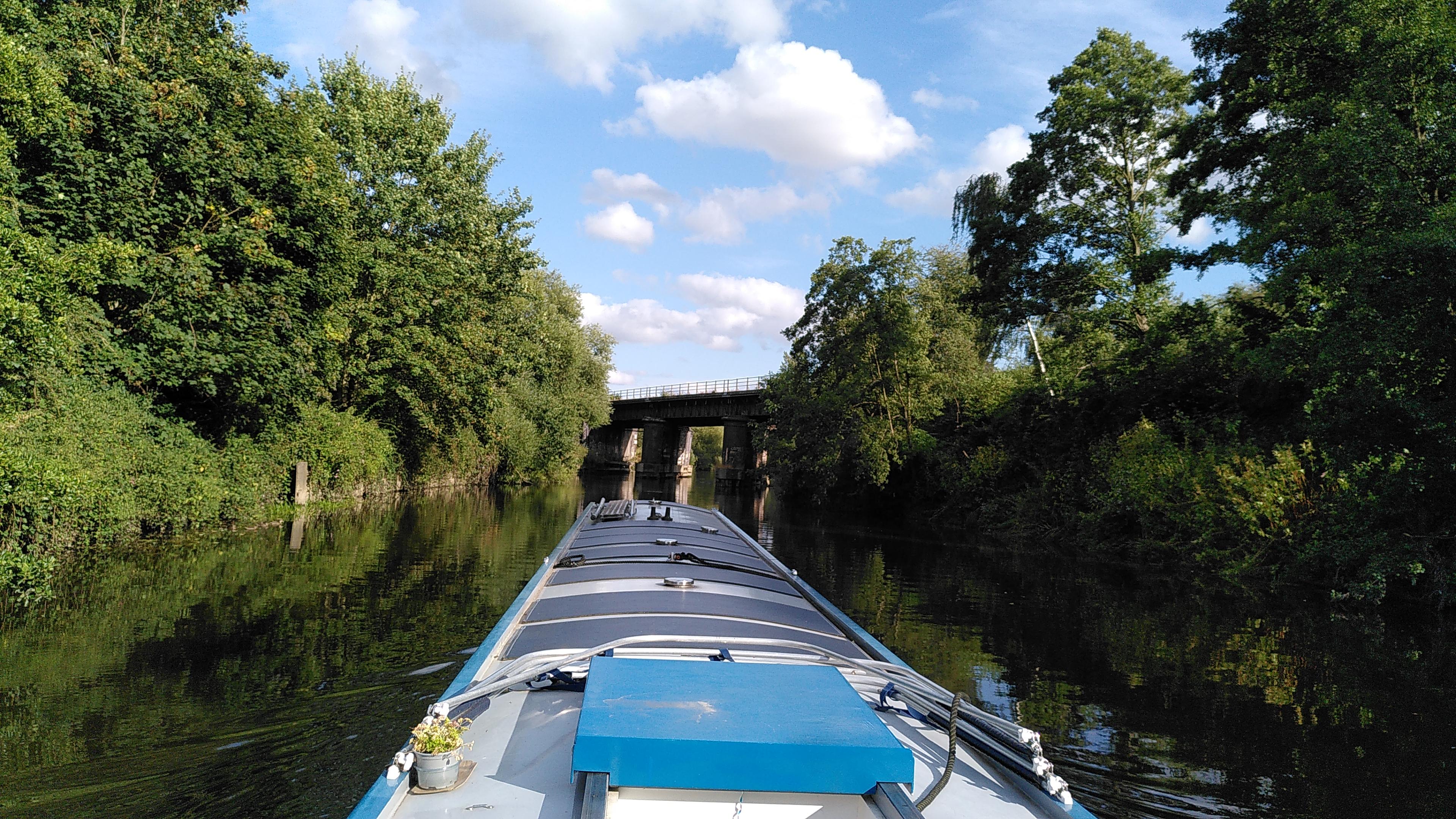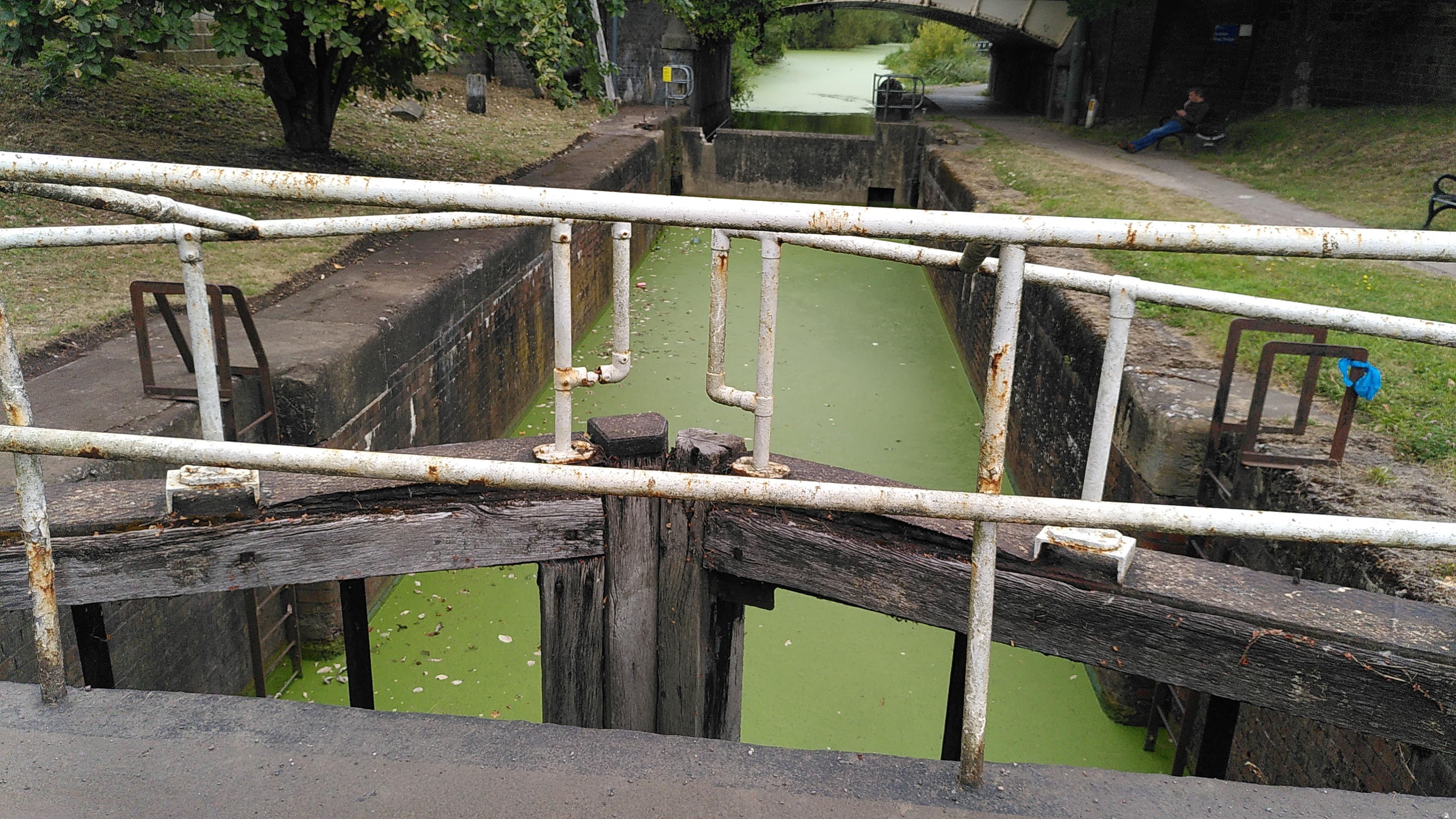 Paul and I had agreed that we only needed one gate open, so once it was ready, the tail gate on his side opened in front and he roared off. Bartimaeus was pulled over in his wake, and with a little bow thruster I was able to follow him out. Before I’d cleared the gates, Paul was already in the lock ahead reversing hard to stop. He leapt off with his centre rope and pulled his boat over, before tying it to a bollard. That left him free to close the gate on his side behind him. By the time I had stopped alongside, Clare and Pete were just catching up to close the other gate and start winding.