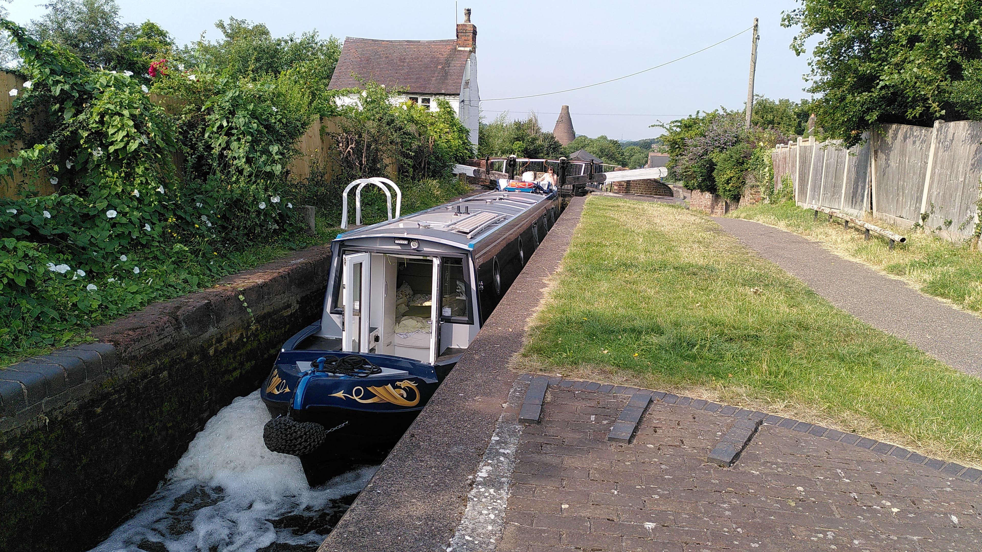 We returned to the main drag, and had some lunch. With the cooler weather, we were enthused to press on up the Delph flight of 8 locks, and then on to another Silver Propellor location – this time the Southern Portal of Dudley Tunnel. The silting in the top pound was so great that we couldn’t get within line of sight of the tunnel. We managed to get to the bank a little further back to see the portal. We don’t fit through that profile!