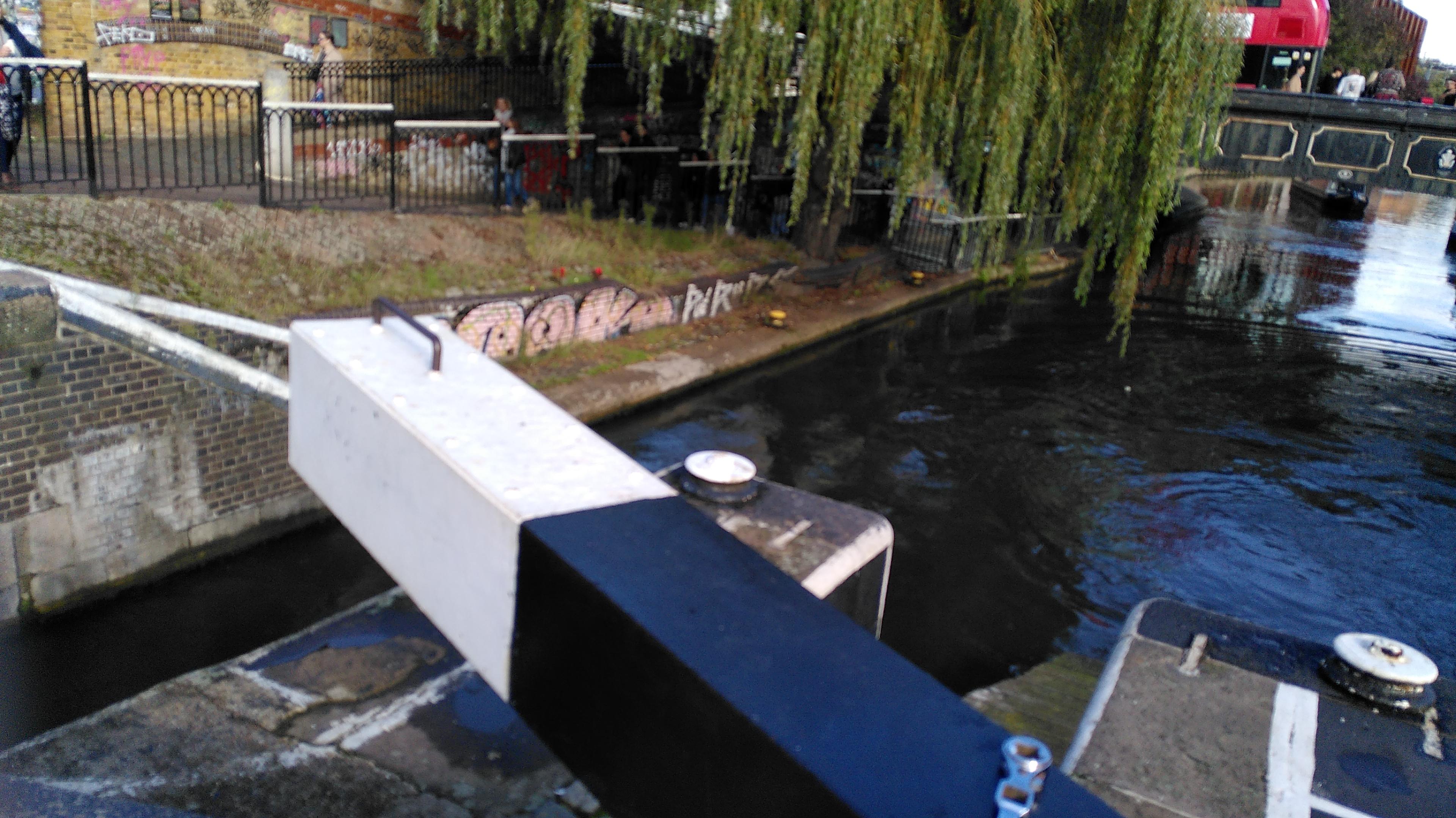 We found a slightly easier mooring than last time, but it was still at boat roof height. My brother, Roy, joined us on board for the evening. The weather forecast no longer threatened a wash-out the following day, and the moorings were officially for one day only, so we arranged for him to join us again when we moved back to Angel.