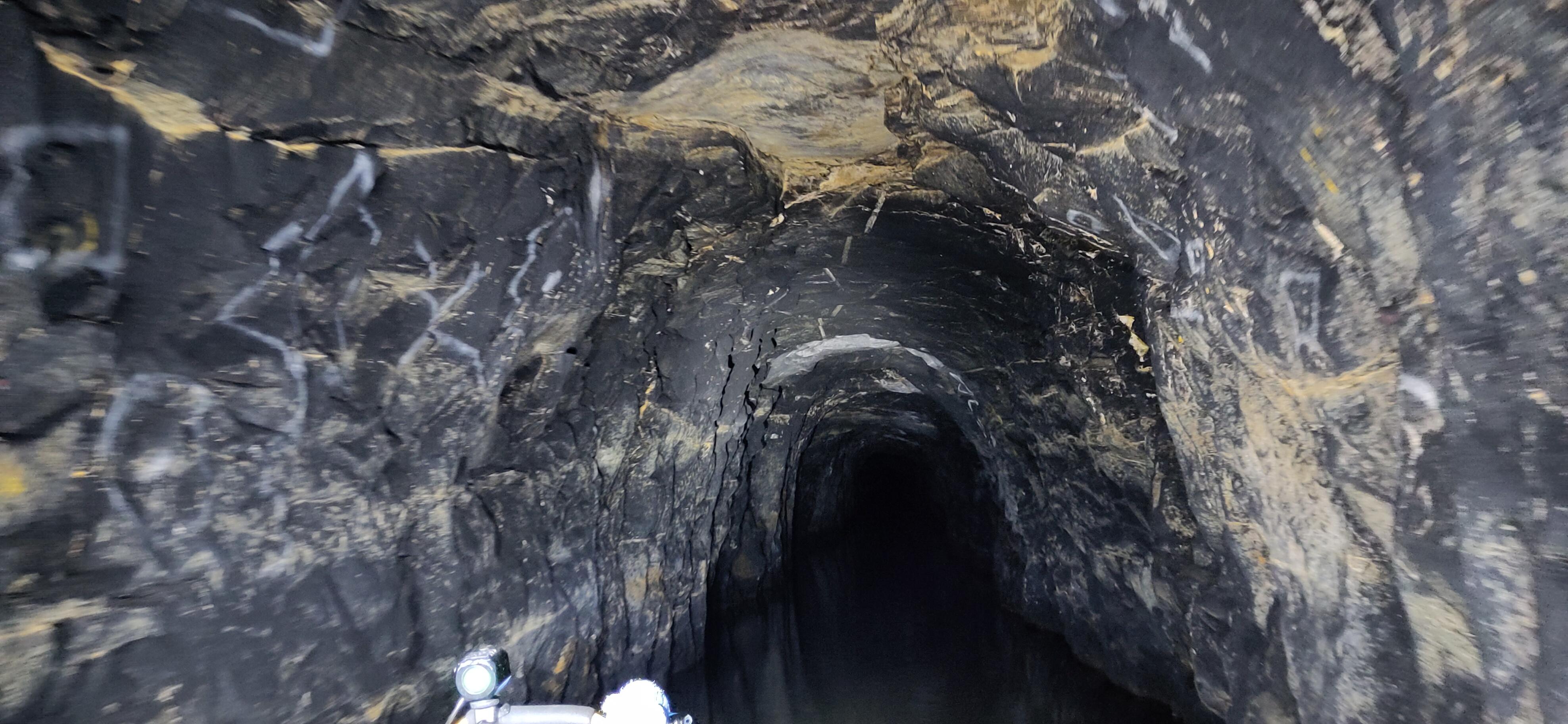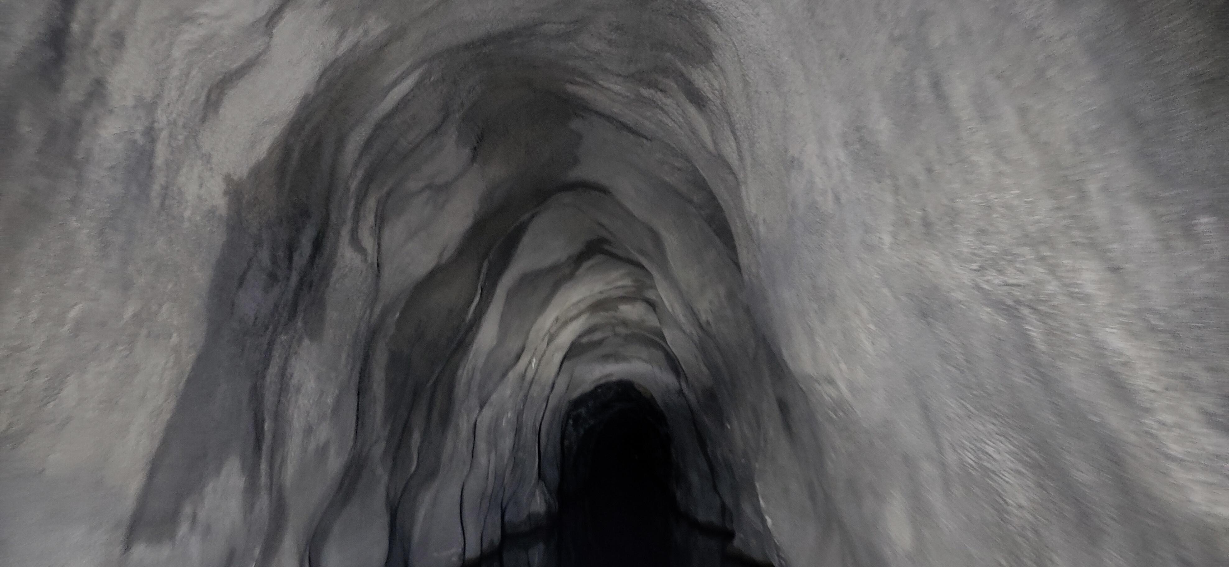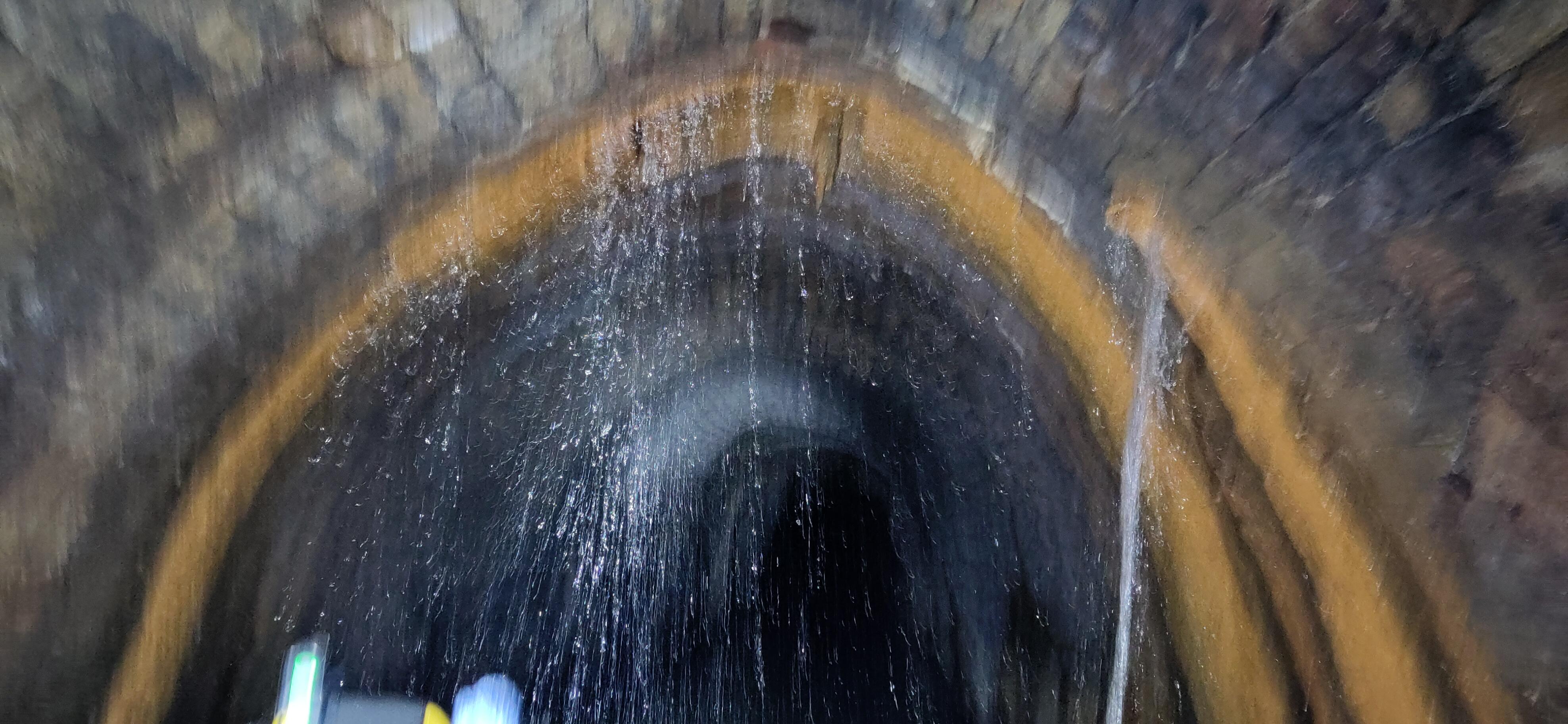 Trevor had warned me that there were a few places where the tunnel is very wet, mostly at the end we were starting from. We could hear the water before we could see it, but there was no way we were going to avoid it. This was the bottom of the shaft we’d seen yesterday. If I hadn’t been dressed for this it would have been miserable, but I was standing in a waterproof coat and hard hat, so I didn’t even feel it. There were a few more wet points like this, but the vast majority of the tunnel was not even drippy.