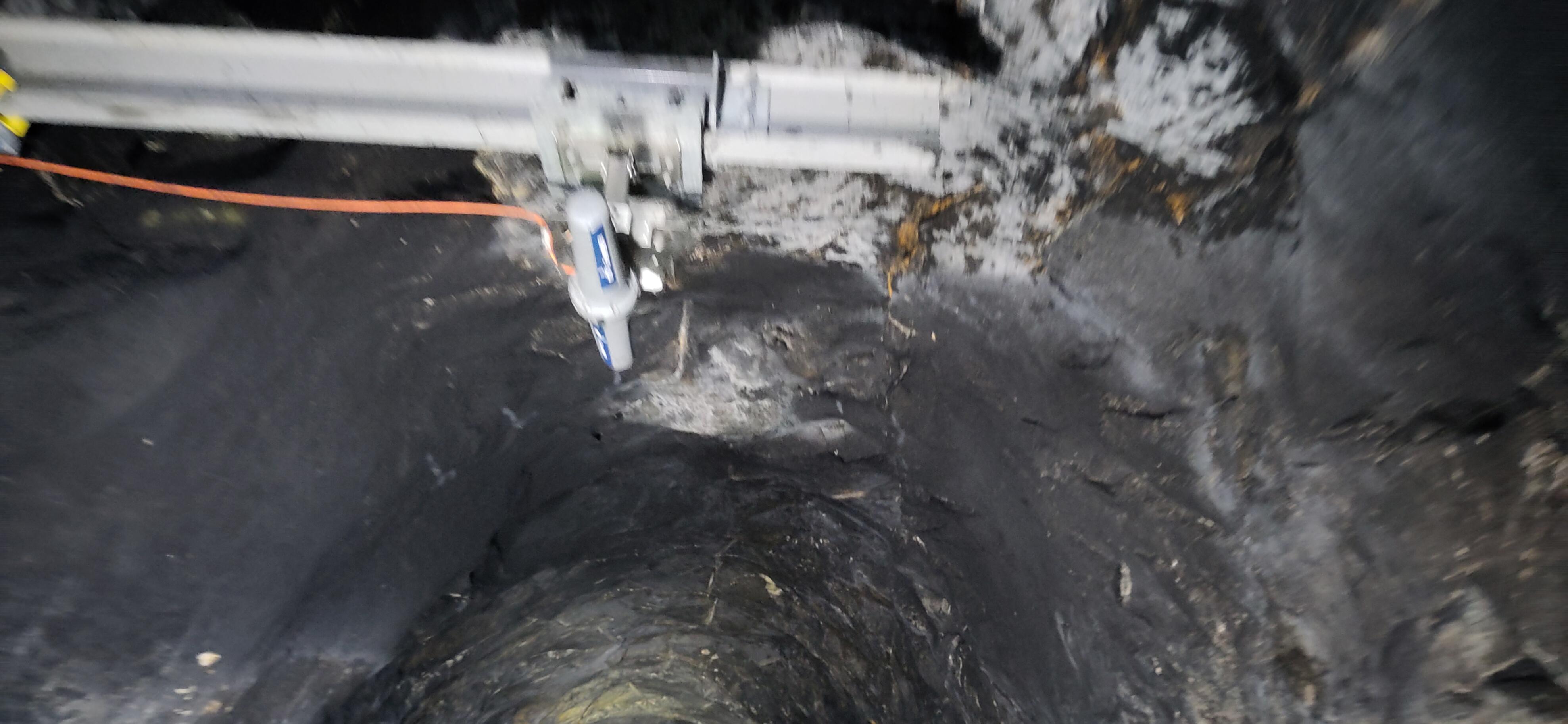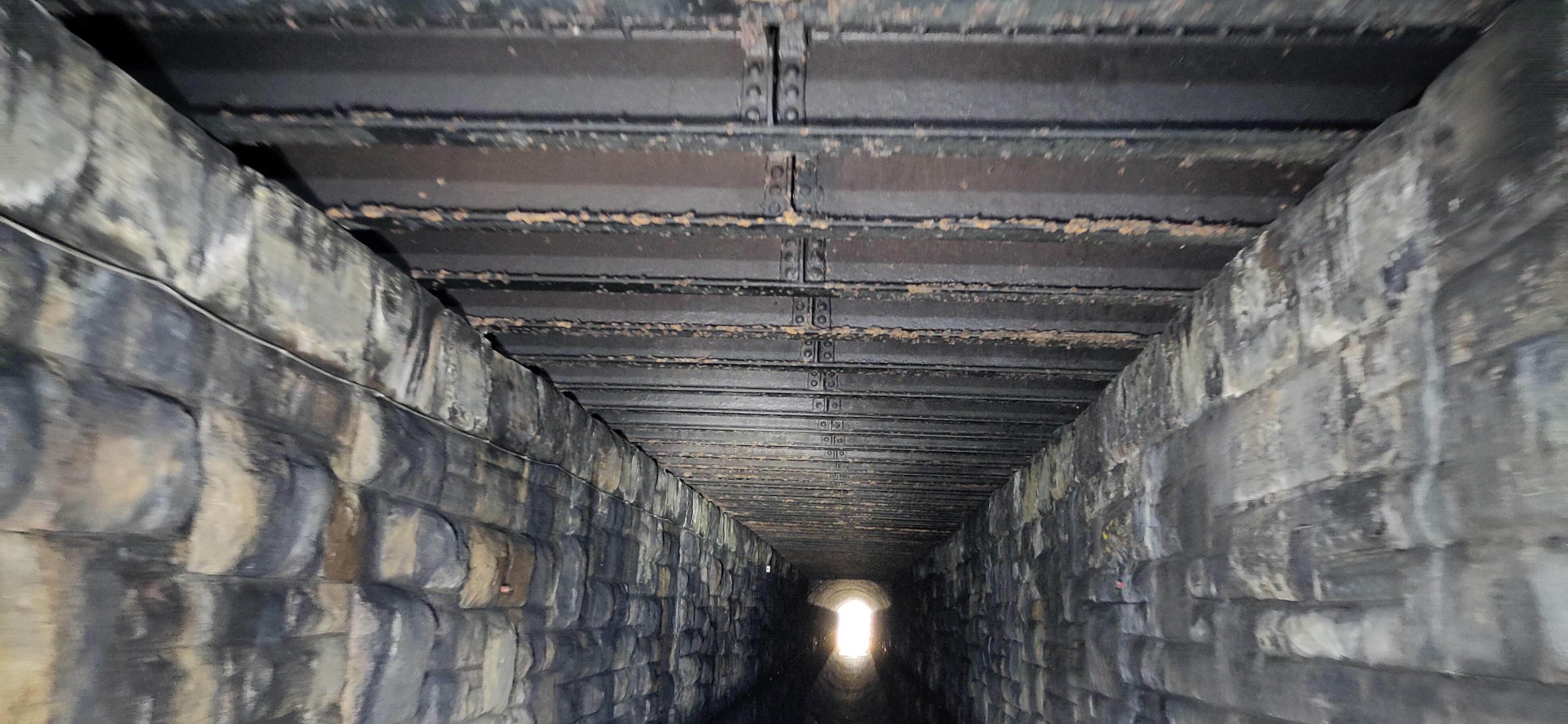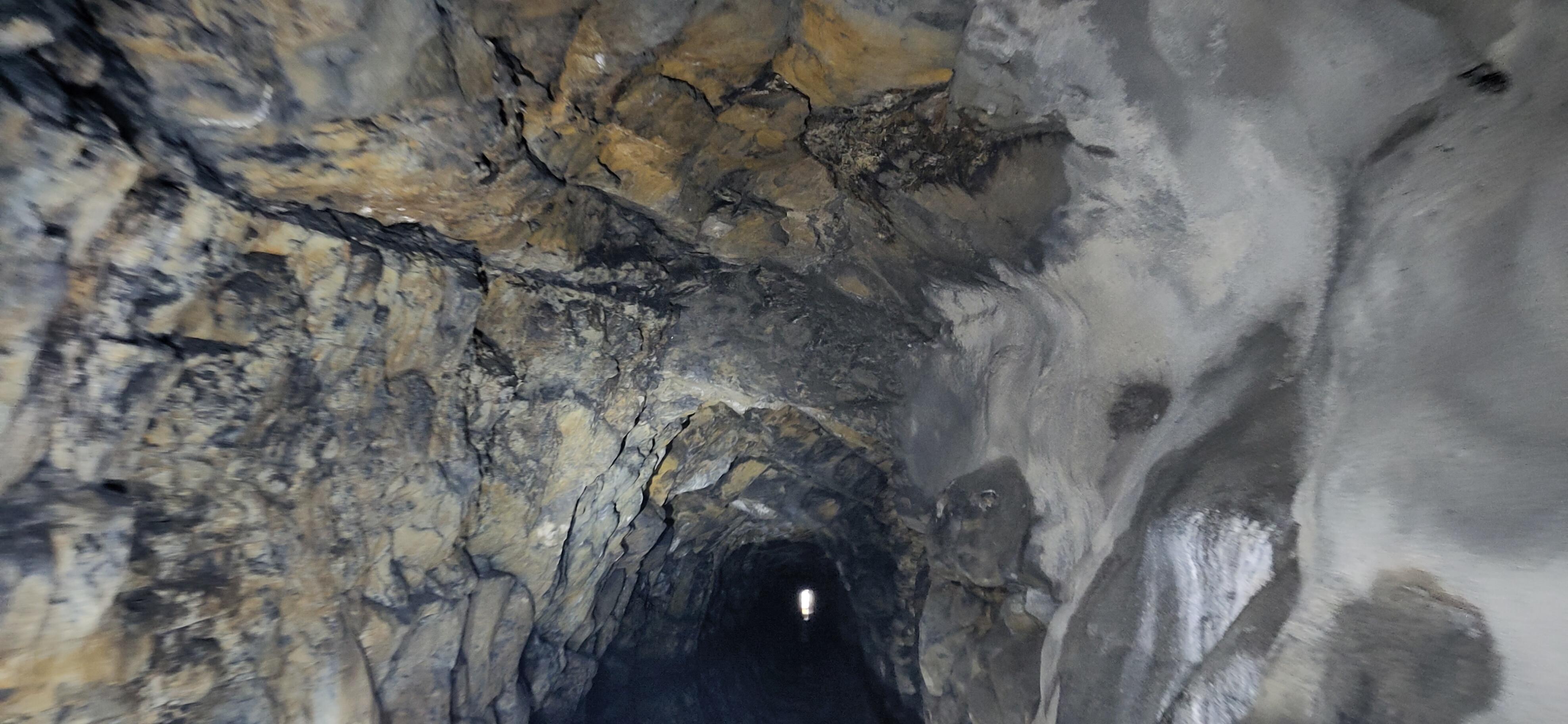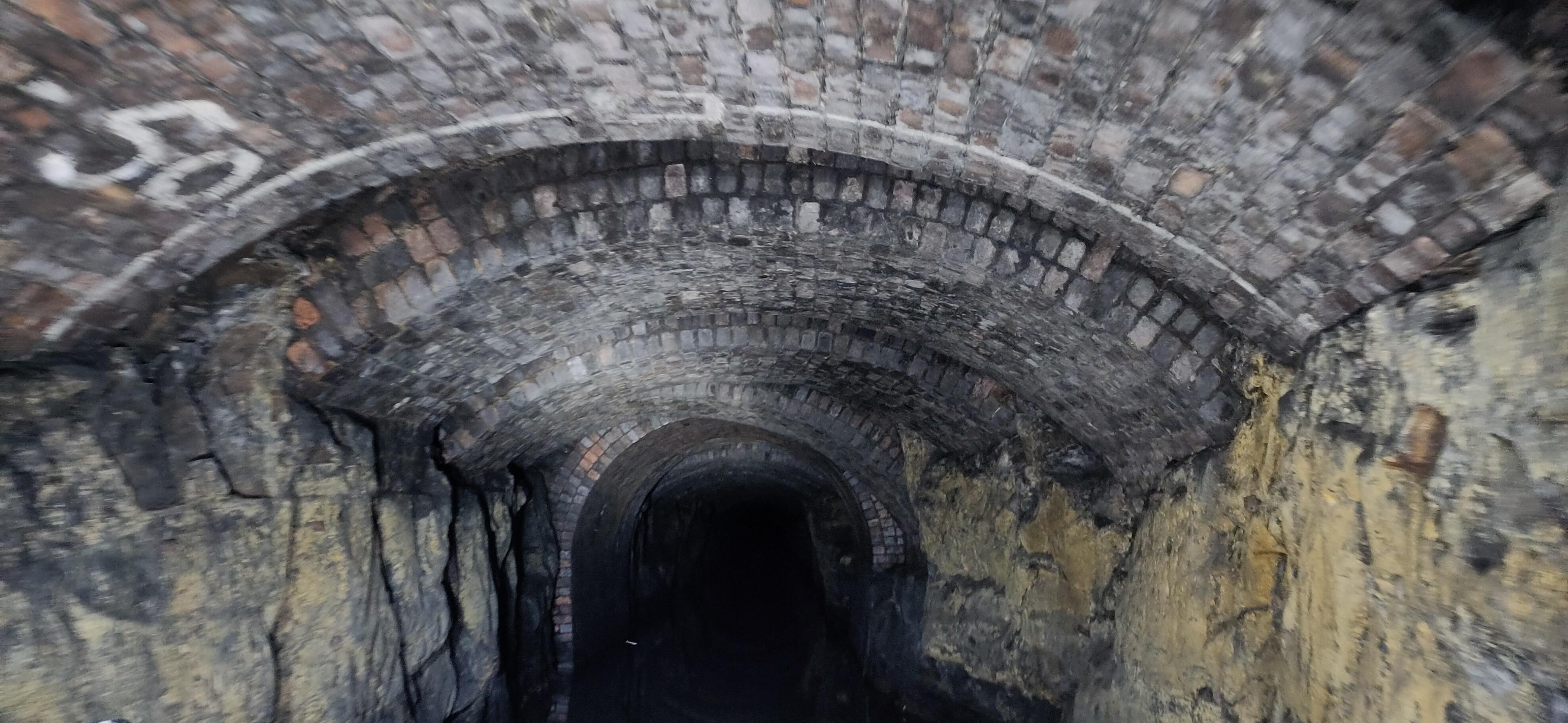 Trevor had warned me that there were a few places where the tunnel is very wet, mostly at the end we were starting from. We could hear the water before we could see it, but there was no way we were going to avoid it. This was the bottom of the shaft we’d seen yesterday. If I hadn’t been dressed for this it would have been miserable, but I was standing in a waterproof coat and hard hat, so I didn’t even feel it. There were a few more wet points like this, but the vast majority of the tunnel was not even drippy.