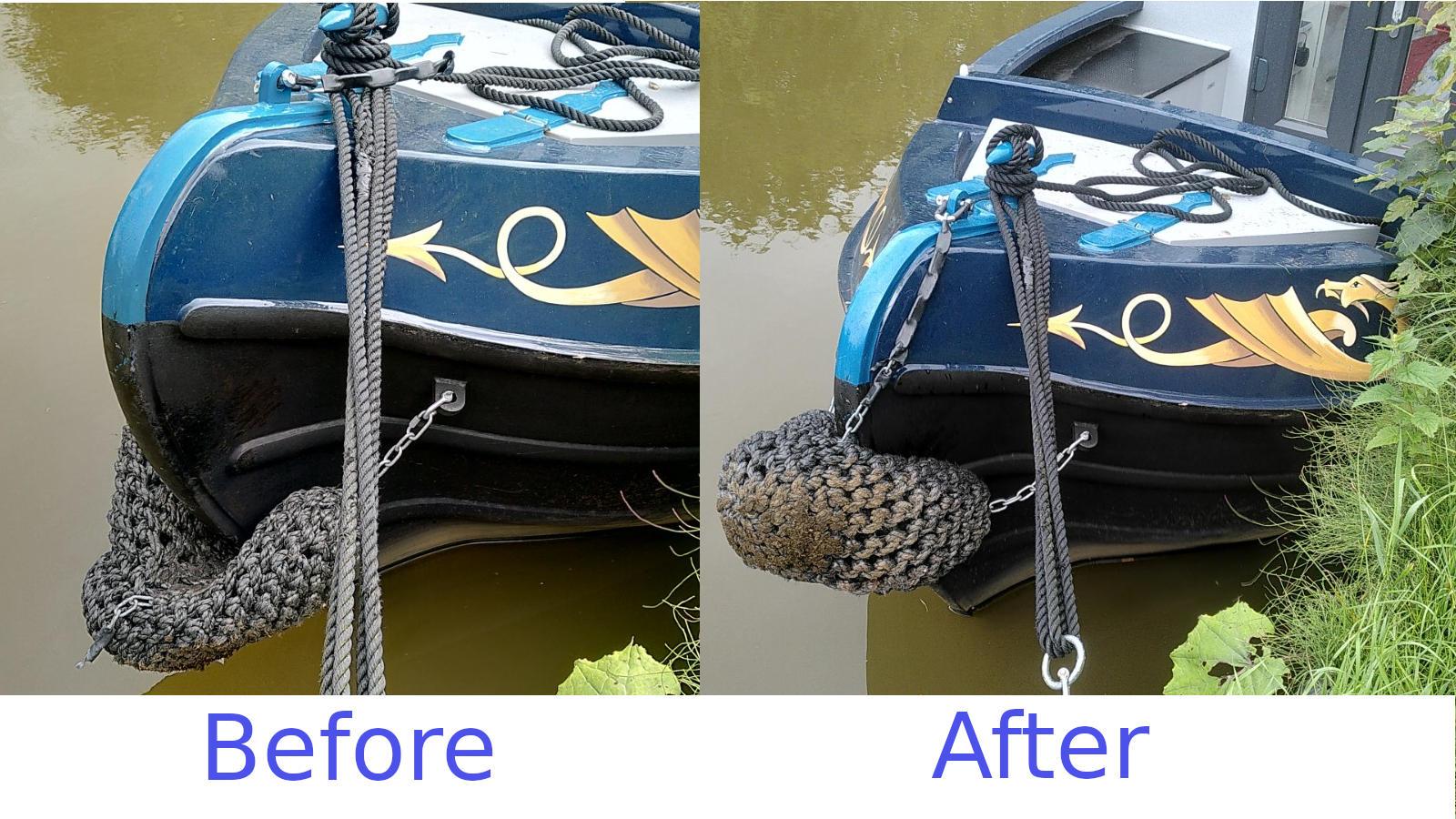 Clare had spotted that one of the chains holding the bow fender was broken. We usually refer to this as the “nose cosy” after it was named such on a holiday many years ago. After some investigation I identified the much bent, but not broken connector. With some careful blows with the hammer normally used to insert mooring spikes I was able to re-use it. The final operation was done using the boat hook and pliers, and was a team effort with both of us balanced on the bow hatch. We should probably replace it at the next opportunity.