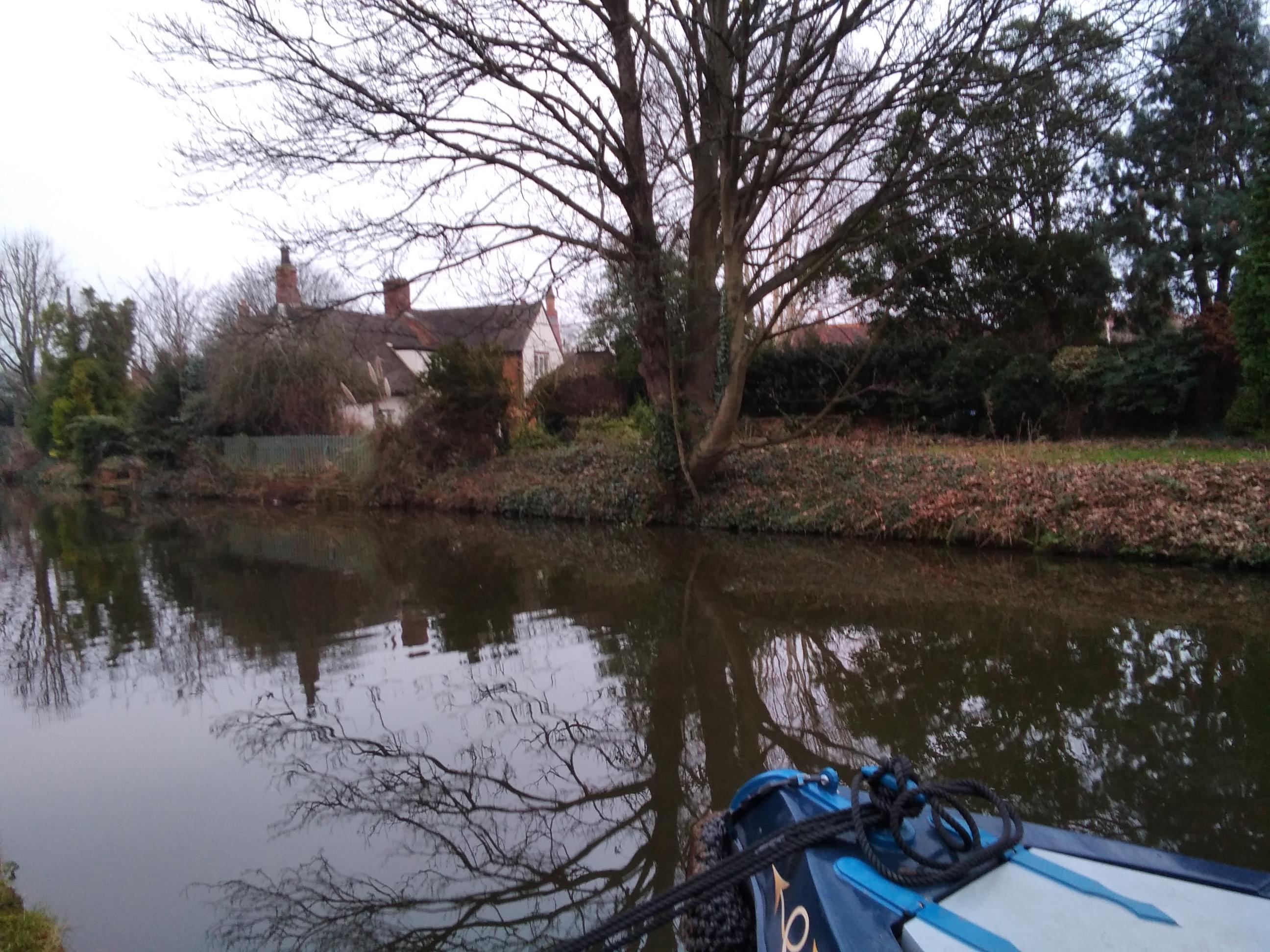 A couple of women crossing the bridge remarked on me doing the harder job. I told them it was certainly warmer but we would swap jobs when he was cold. I finished closing the lock. They walked along the same way I was heading and I said to them as I passed that I had another nice job to do, emptying the rubbish (not a chic coat job!) Shane had the bins ready and handed them to me. “I hope there are some beer and wine bottles in there” called one of the ladies. I still had my windlass in my hand and laid it on top of my recycling container while I tied the general waste bag up – must remember that is there before emtying it, I thought. This job is easier if you are not still carrying locking equipment. Then I went to the glass bin for the bottles and jars that Shane had piled on top of the other recycling. I found the mixed recycling bin and began to tip it in and heard a loud clang. Ah that would be the windlass hitting the bottom of the metal bin, that is almost as tall as I am. I would not be able to reach it right at the bottom, and wouldn’t get out if I managed to get in. But I remembered just the thing – the boat hook on the roof of the boat. Shane got it for me as the boat was a bit away from the side and it was the very dab at catching into the windlass hole and I returned them both to the boat, for fear of any other mishaps and finished the dealing with the recycling.