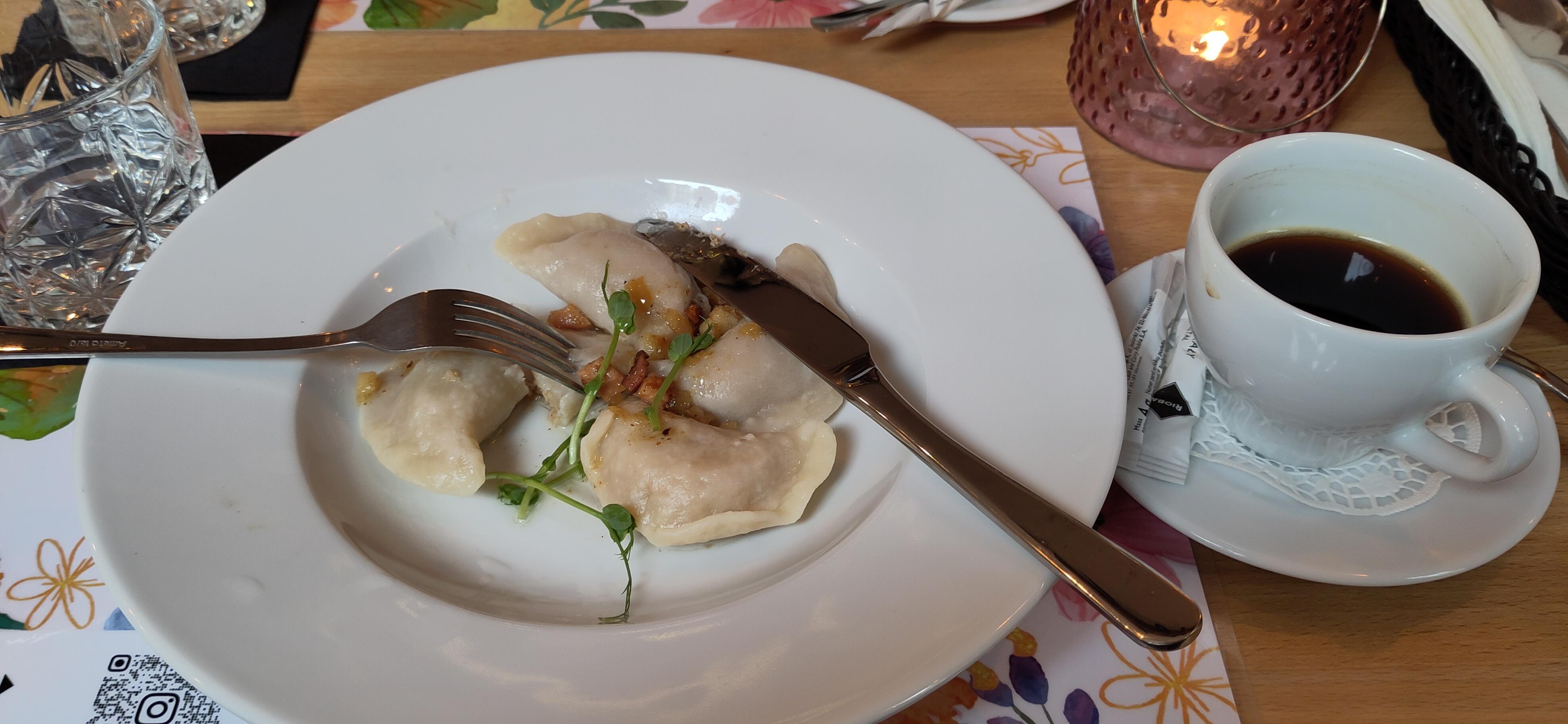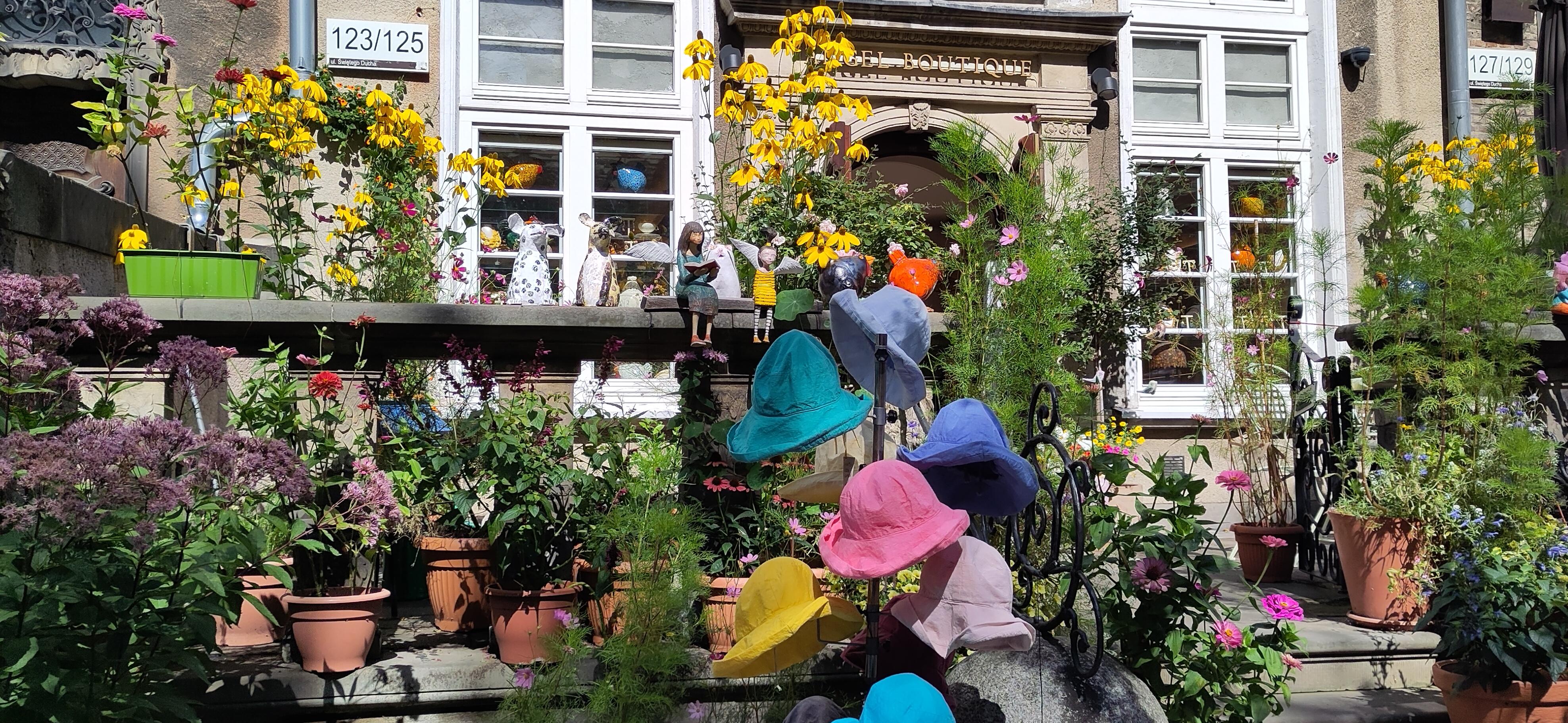 A browse in the shop and we were ready to have a little rest and freshen up, before tackling the fish restaurant. I had no worries with my choice. I often choose sea bass, but as it is also available in many places, I chose zander which I haven't seen in a restaurant before. When the sea basses arrived for Mugs and Marion they were whole, head and tails and all, served en papillotte with vegetables underneath, quite a challenge to eat, but they did well and we managed a dessert too. Fish is such a light dish!
