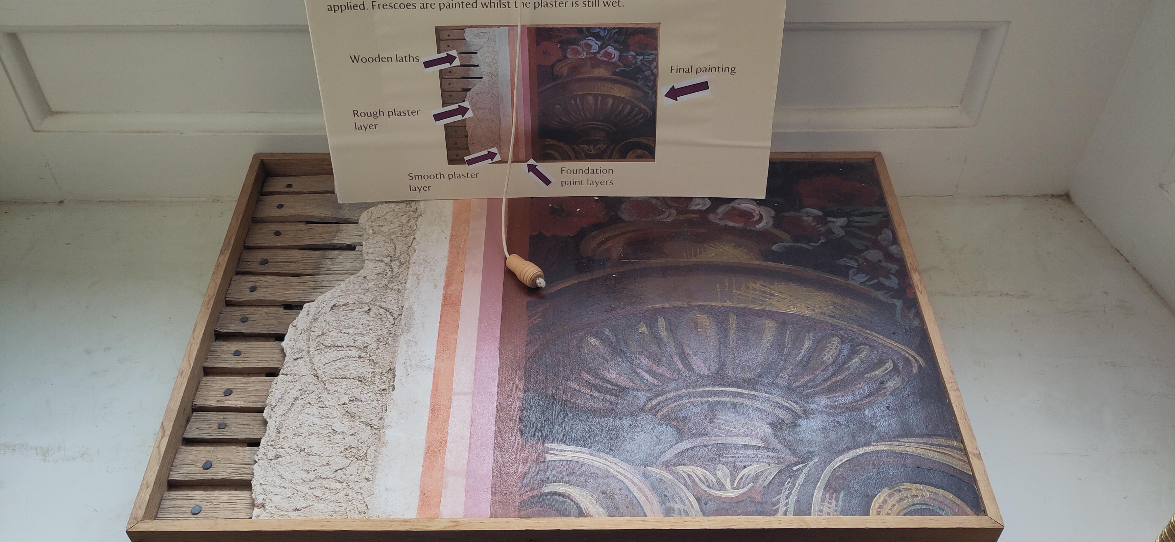 We had completed the downstairs rooms and could now go up the stairs to admire the main feature. As well as the greek myth explanations on the noticeboards, on Achilles, Odysseus and Ajax, a volunteer drew our attention to an addition to the painting that was not on the original plans, a picture of a minister who vehemently opposed the Whigs and said so in one of his sermons. He is depicted being passed by Mercury, to the furies. Vernon so disliked him, he must have requested this addition.
