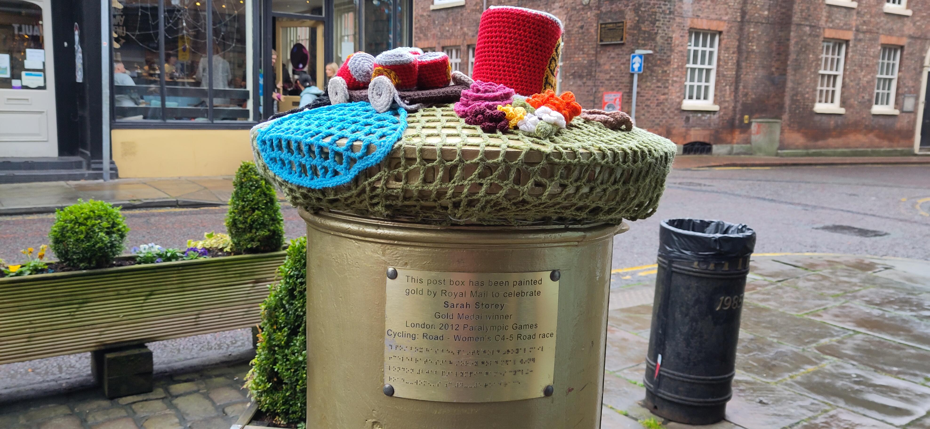 There is no suggestion that there was ever a treacle factory or toffee maker in Macclesfield, to lend the town it’s name. Apparently a wagon of treacle did once spill its contents once and the poor came and took it in handfuls, not an easy thing to carry, perhaps they brought bowls. This event was significant enough that there is a monthly market called the treacle market held on the last Sunday of the month, though treacle is not necessarily for sale. We have missed that for this month. I was driven to do a bit of research into the athlete on the gold pillar box. She’s the most medals of any Paralympic athlete – golds, silvers and bronzes altogether and the most golds too, competing in swimming, as well as a cyclist, and she has also won medals in the able bodied Olympics.