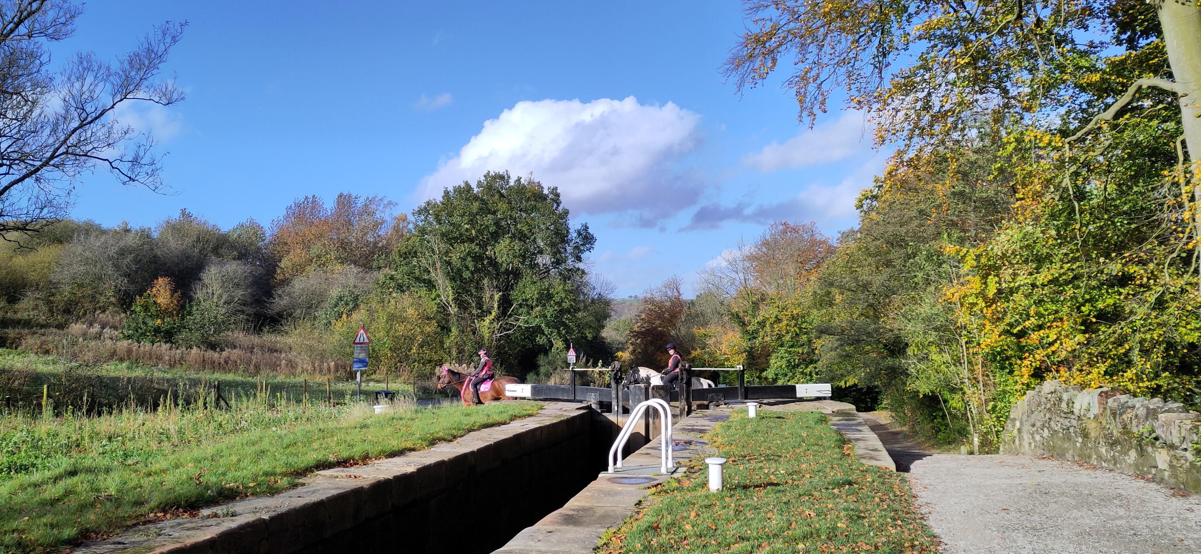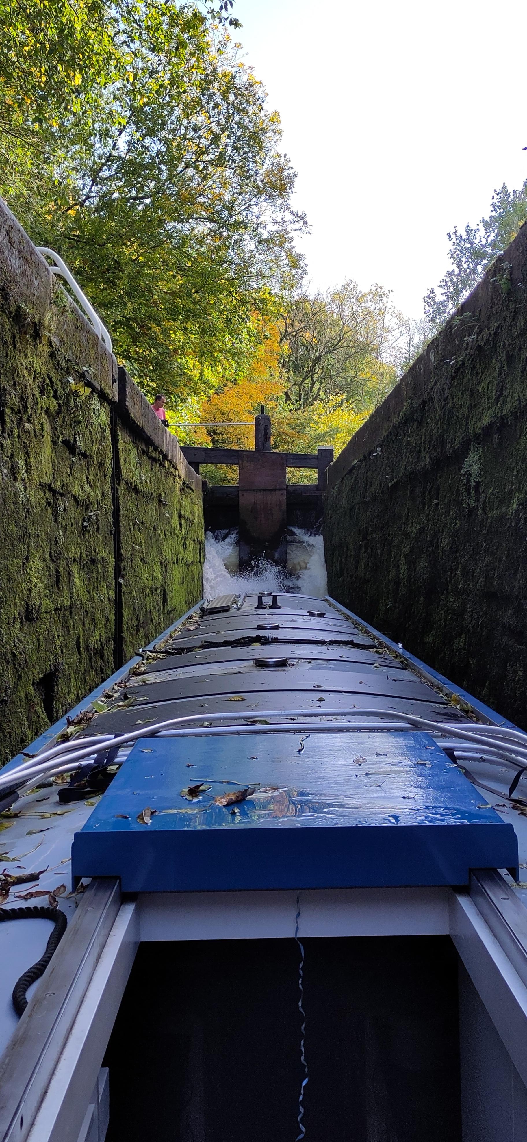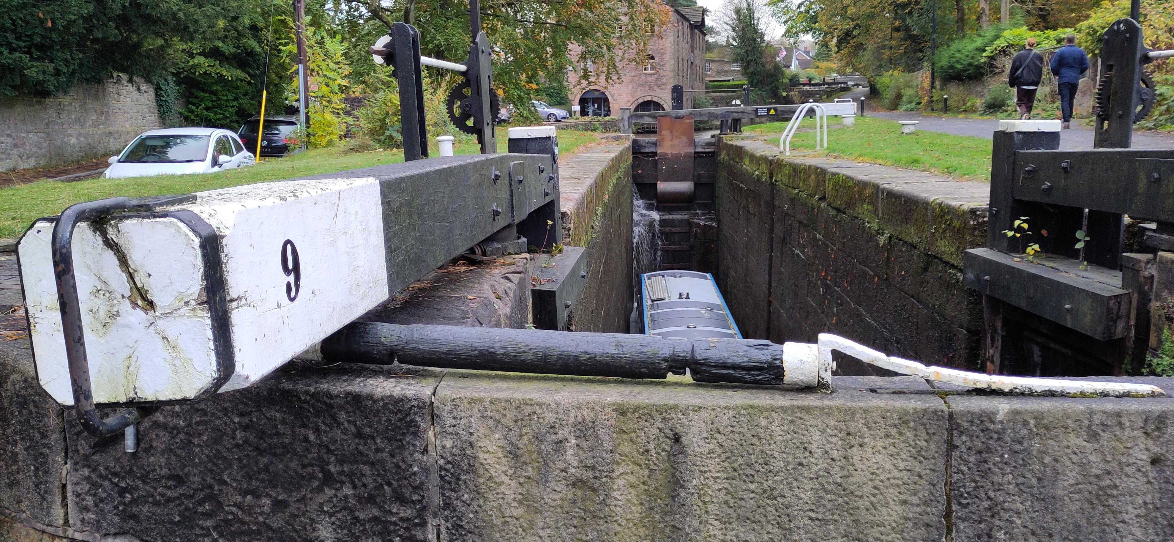 At lock 4 Shane came and told me to pull in as there was an empty pond further up. At first I misunderstood and thought it was a pond we could moor in but in in fact he meant stop now because we couldn’t go all the way up. Shane and another boater, out walking his dog, had taken one extra windlass to see if they could be helpful to others further up the flight. His wife and the dog were waiting. I was a bit concerned as it was a gusty day and hoped the boat wasn’t going to be caught in the wind, but it seemed manageable, and I didn’t need to take up the woman’s offer of taking the rope, which was good since she had the extra complication of a dog and lead. I tied up and chatted to her. She was trying to look at the CRT website, but finding it hard to navigate. Their placid fluffy Alsatian was sitting in a comical human-like pose with his forelegs on the ground and his rump on the bench.
