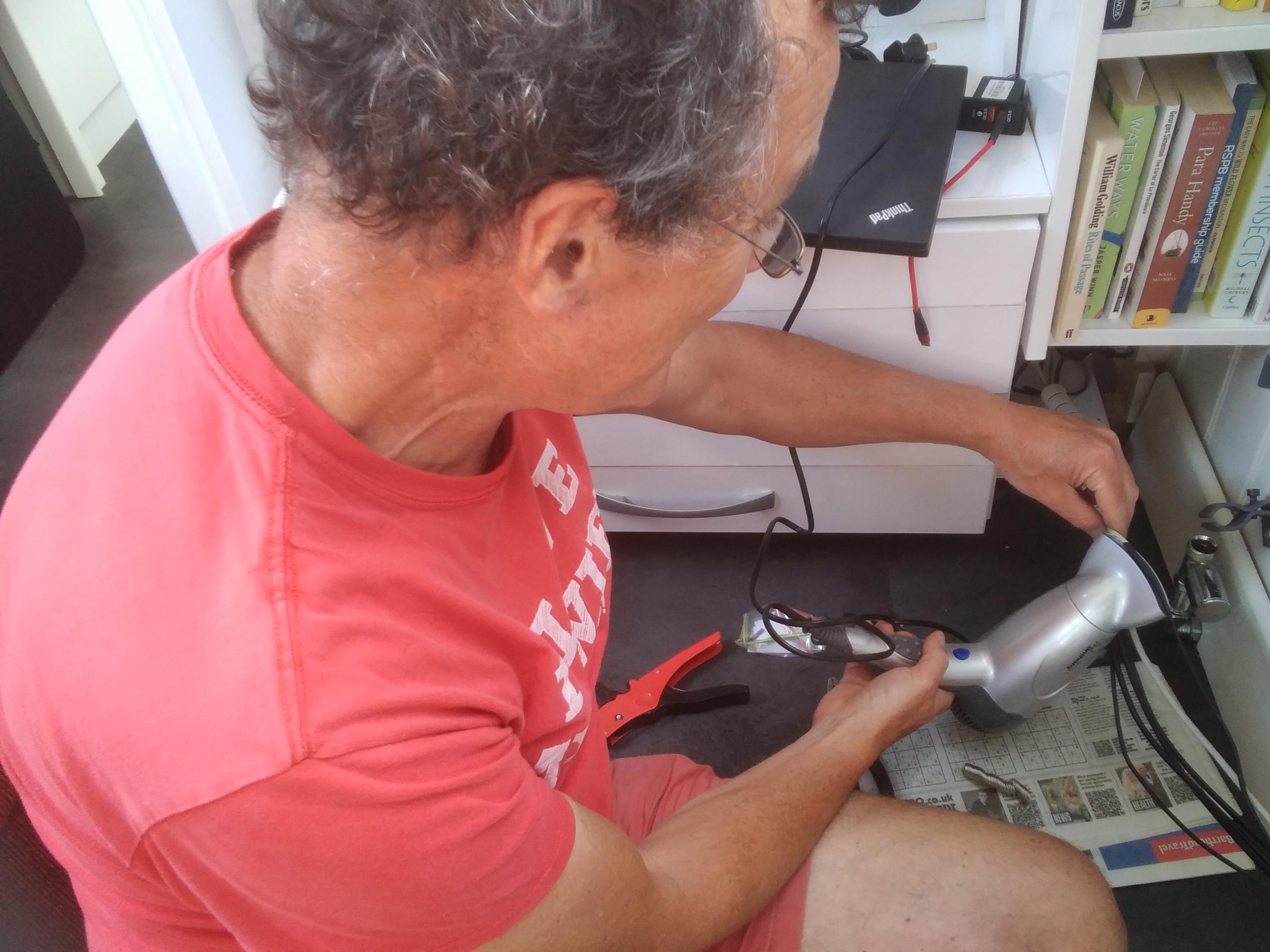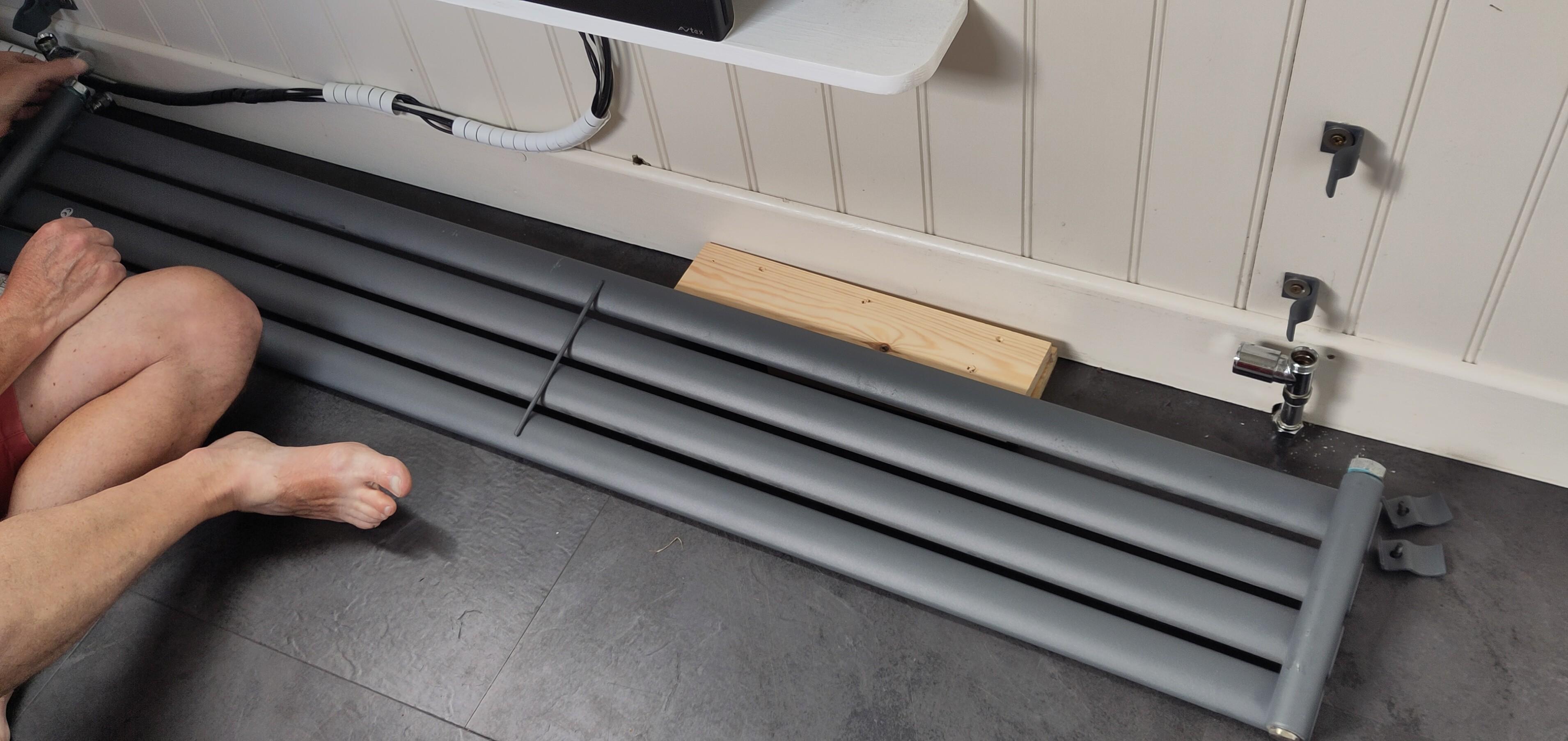 When I installed this radiator last year, I didn’t have a suitable tool to tighten the tails. I did my best, and it seemed to be a reasonably good job at first. Over the winter, leaks at both ends have slightly worsened. Now I had obtained the small tool required to tighten the tails, so I got Clare to help with demounting the radiator. Experience from last time meant we managed it without spraying very much water around. Removing and resealing the tails didn’t take long, but while the radiator was off I took the opportunity to make changes to the wiring that runs behind.
