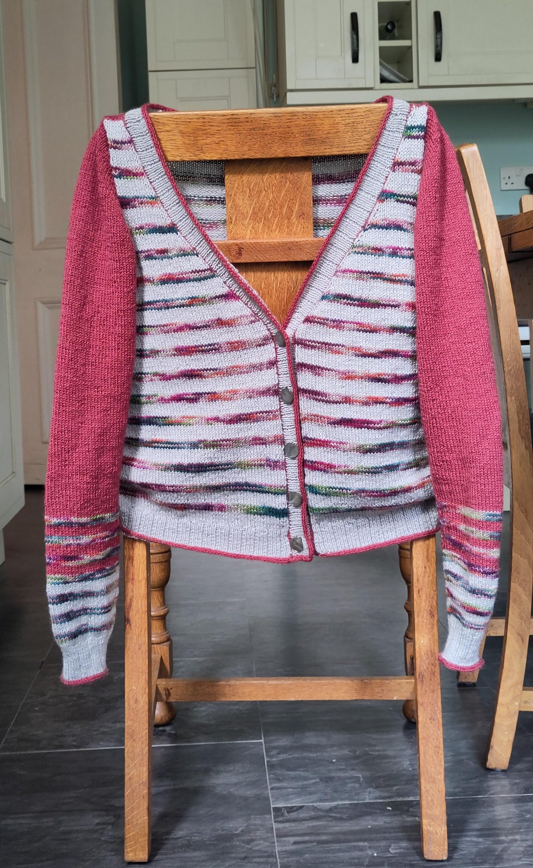 Last month I had a rush to finish the June chapter of my knitted history book. I was reading on the train and in the hotel on the last day of the month. The author was stretching her skills in each chapter and had spun fleece herself before knitting. I have never attempted spinning wool, nor have I tried the skill of this month's chapter, nålbinding, a craft before knitting, used by the Vikings. I keep meaning to try it. The author was finding it sore on her hands so it wasn't encouraging me. I had however brought a whole cardigan with me to Edinburgh and was close to finishing, having cast off the border and button band while on the boat. Now I only had to sew in ends, add the buttons and, most scarily, the buttonholes. The pattern, Funky Grandpa, had a page of pictures and instructions on "afterthought buttonholes" which involved using two needles to pick up stitches on either side of where the buttonhole would be, then, horror of horrors, cutting a stitch and unravelling the knitting in between before creating an edge with casting off the new live stitches and securing them and the cut ends. I focussed on putting on the buttons and weaving in all the loose ends first, before tackling the buttonhole tutorial.