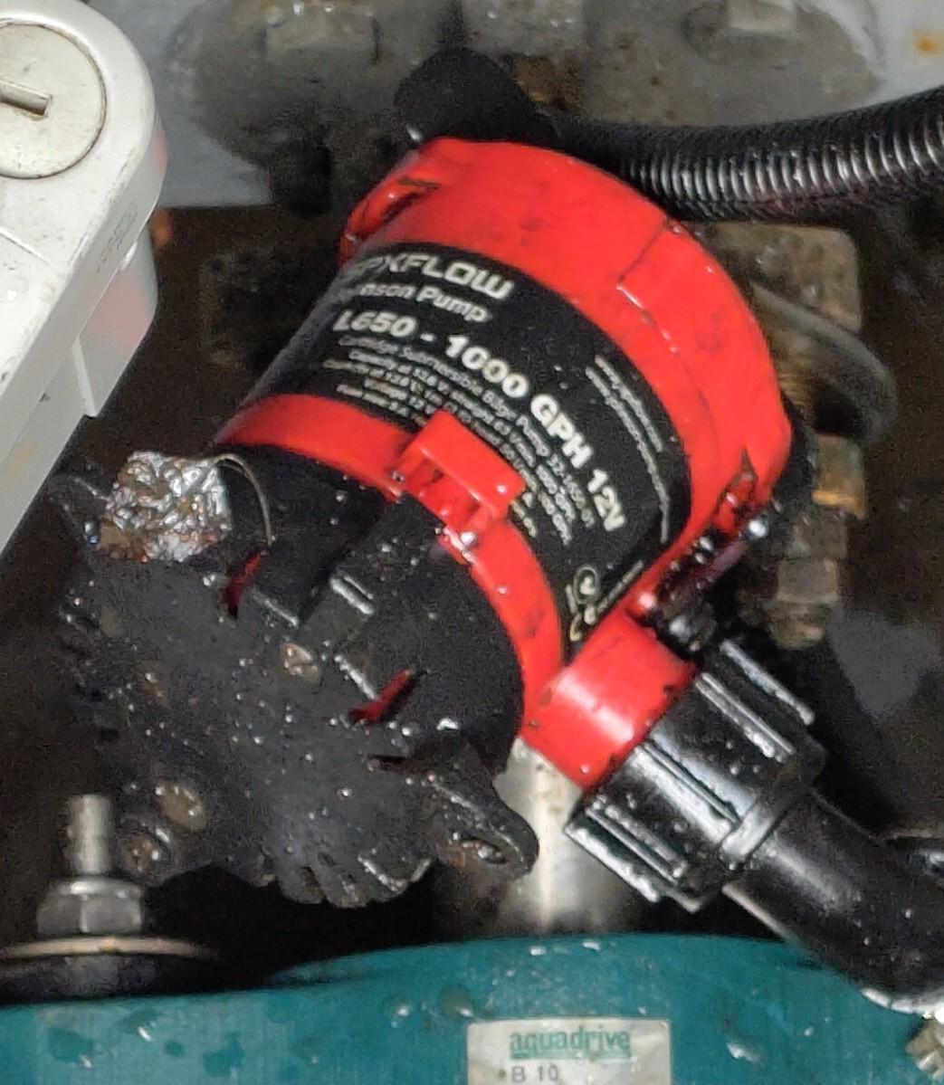 After some fiddling I worked out how to disconnect it from the pipe, and how to remove the impeller from its housing. More experiments showed that the pipe to the outside world was not blocked, and that the impeller could push water in to it, but with not enough strength to eject the water from the boat. I have ordered a replacement pump, fingers crossed we don’t take on too much water before I fit that.