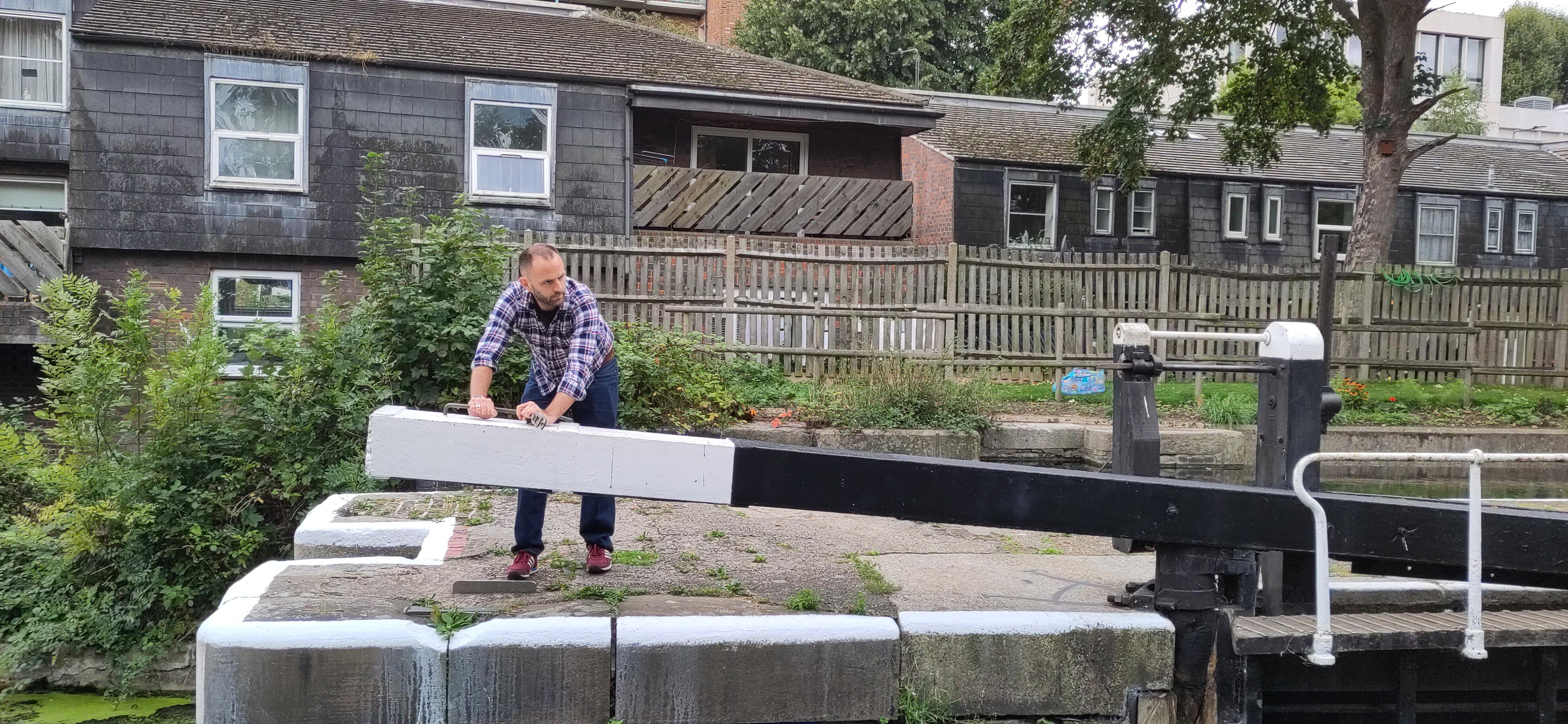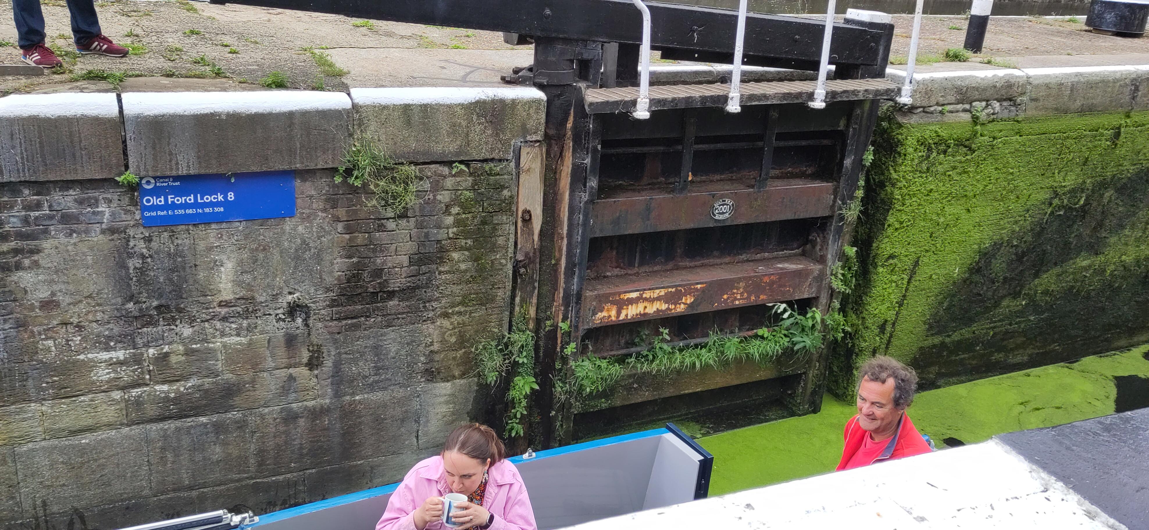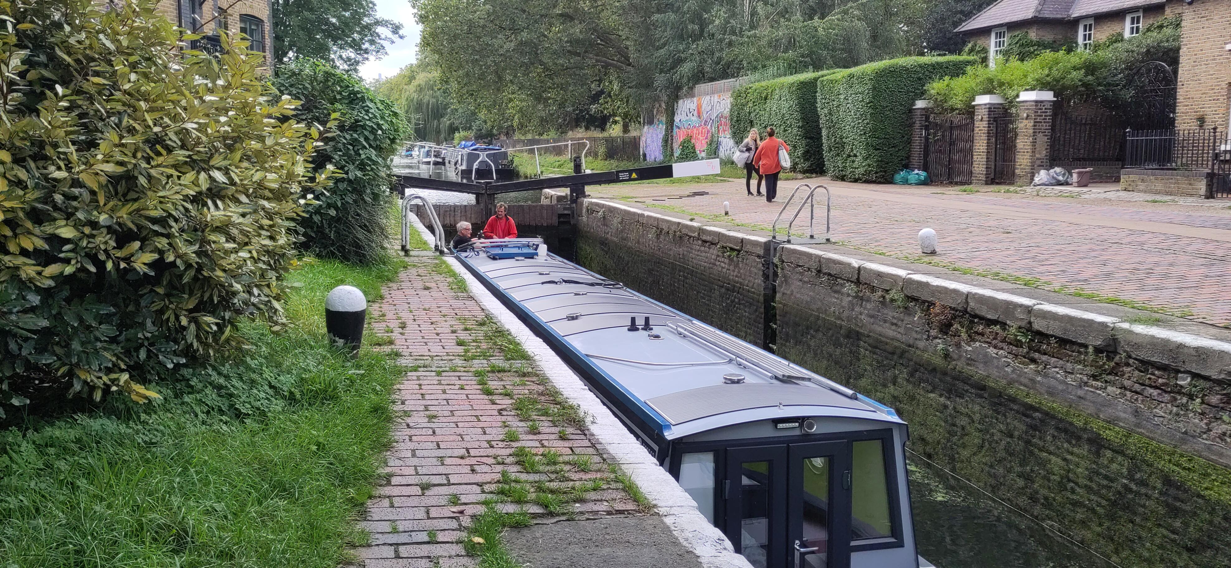 We went as far as Victoria Park where Kirsty had worked out that they could easily get back home. We look forward to seeing them shortly at their wedding, amazed they had time to fit us in but very glad they did. Also here was Paul, Shane’s uni friend from Birmingham, who was in London for a few days. They crossed places with him, with a brief hi and goodbye and we were away again through a couple more locks with a new passenger, though he has been here before. There was still the new experience of the overtipping lock for him. I had to sit astride the lock arm to wind, as there was a puddle where I should be standing.