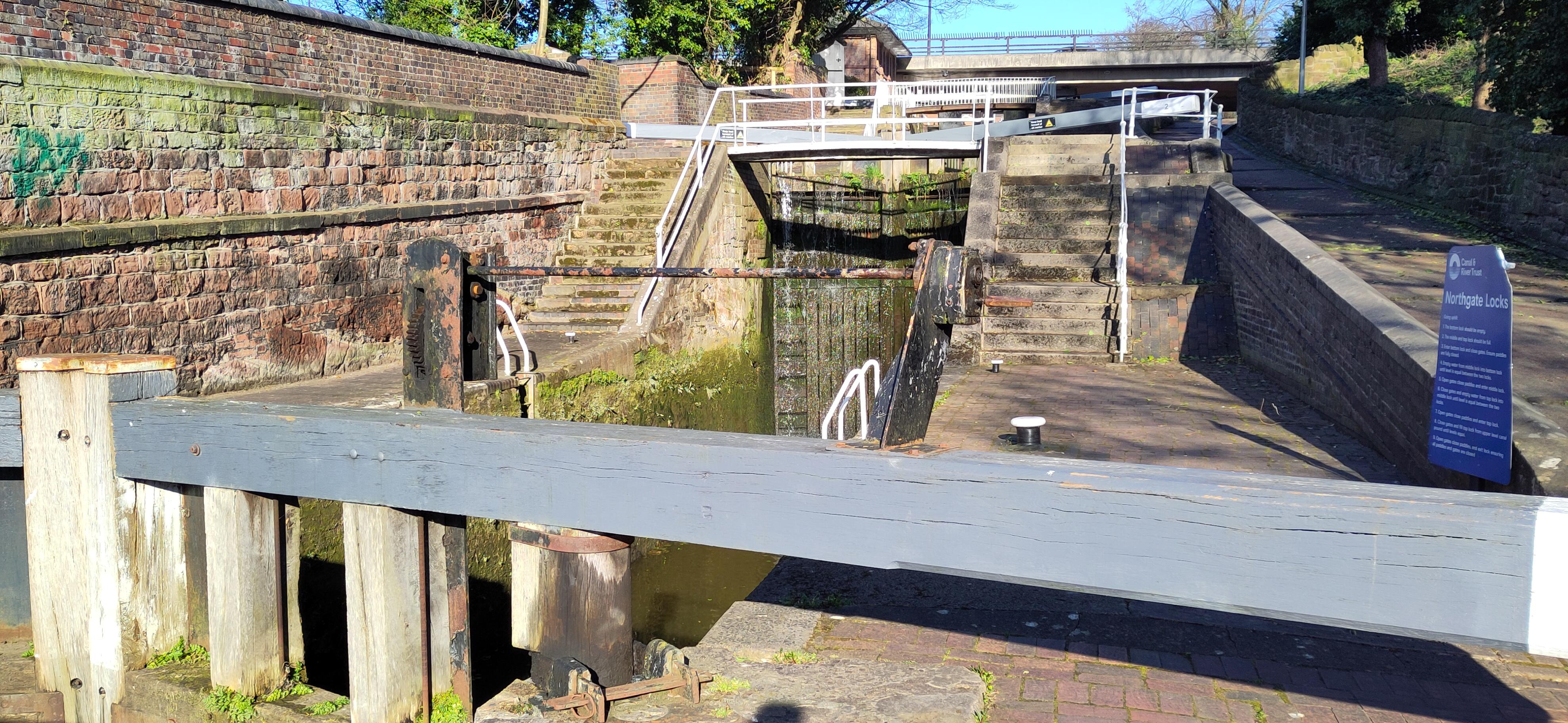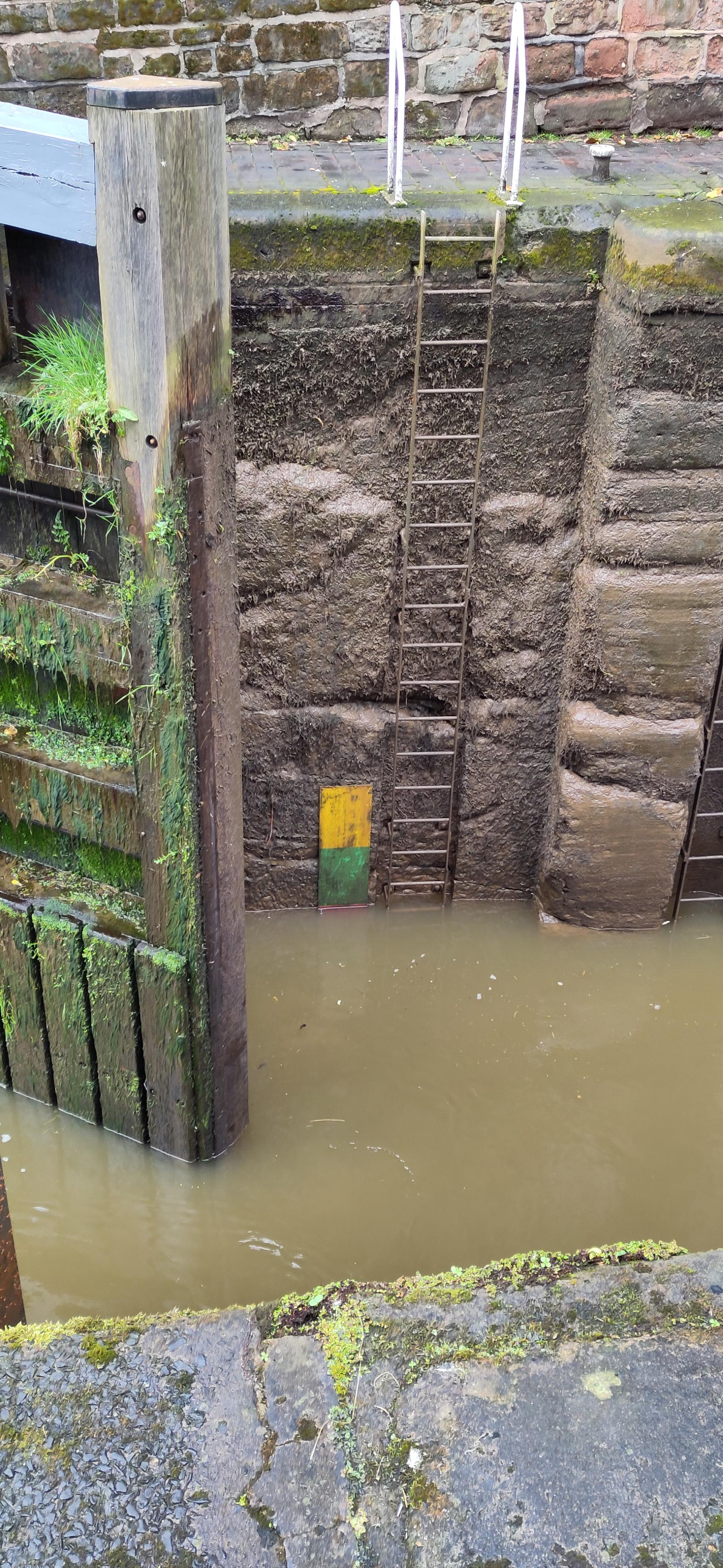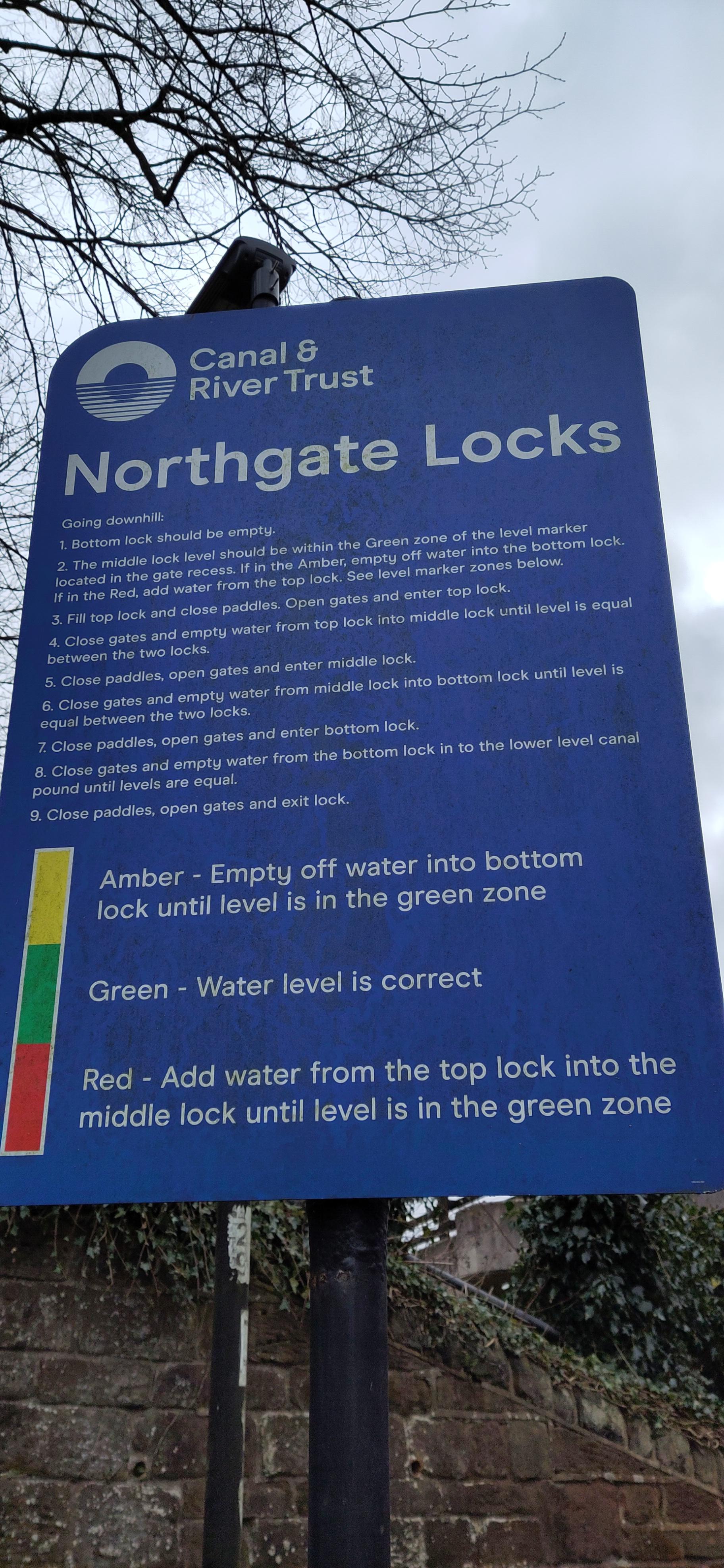 I read the start of the long instructions. Top lock should be filled – yes it already was full, so I opened the gate and Shane went in. The middle lock should be only part way, I thought so and the bottom looked empty but seemed very far away. We had seen someone else a few days ago at the bottom lock saying he couldn’t see the coloured panels as he went through so I didn’t go and look for them. That was a mistake, but I wouldn’t have seen them either, but I could have checked more thoroughly.