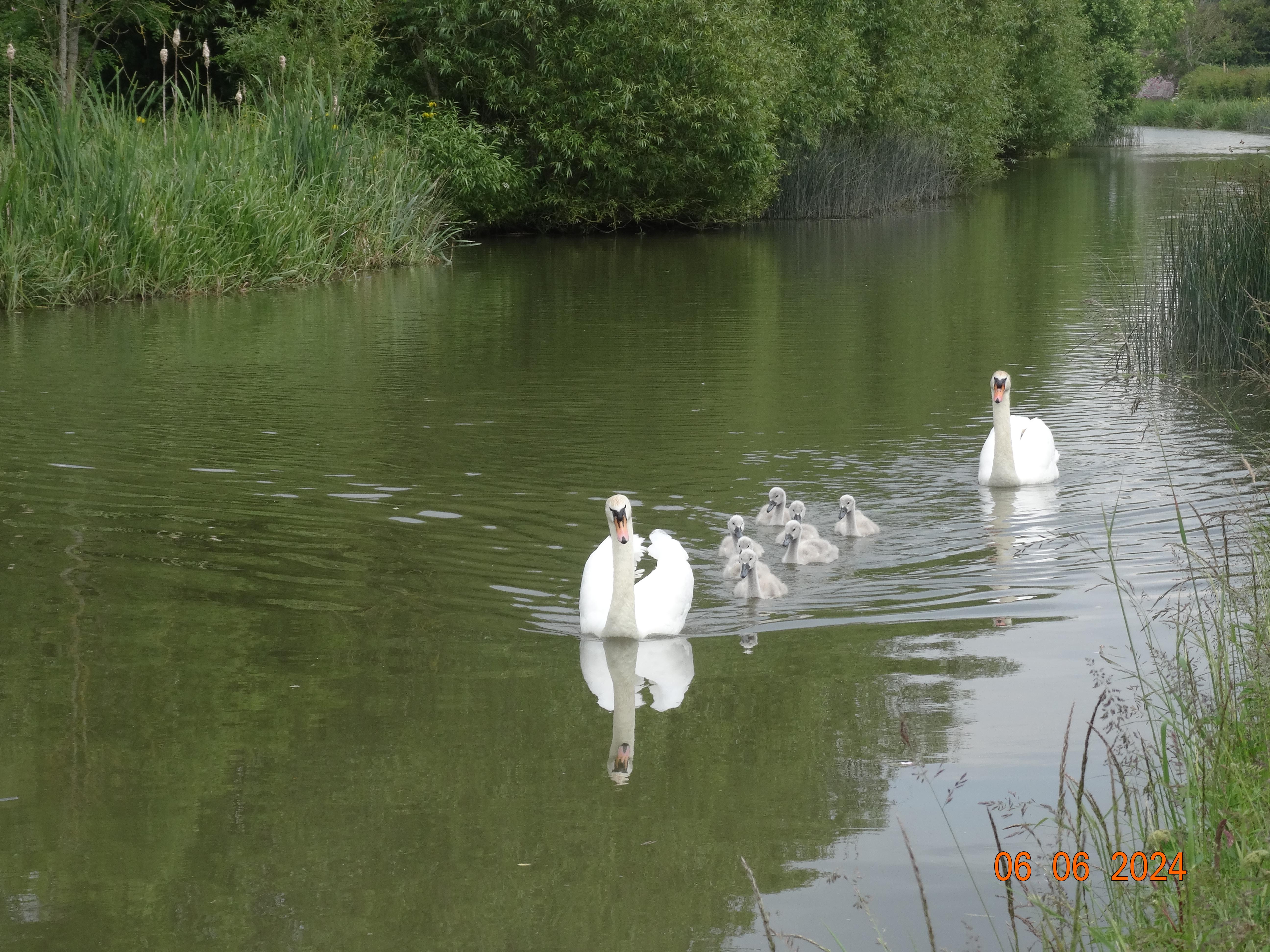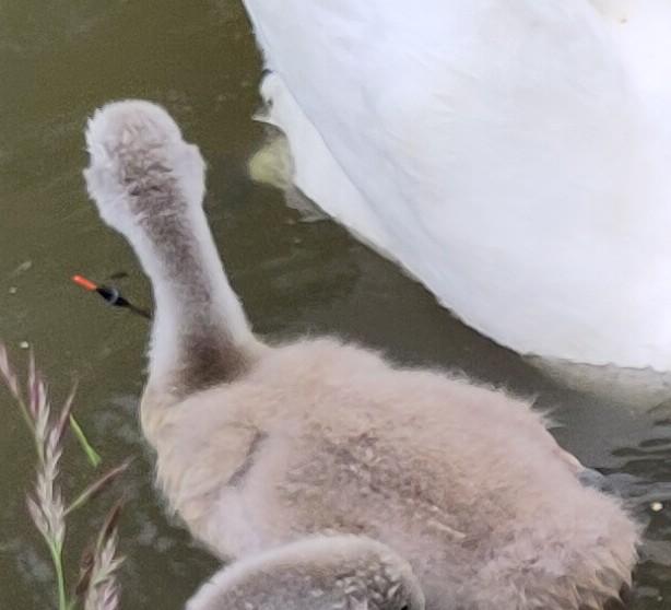We set off after leisurely breakfast, and had a very pleasant cruise, in nice weather and the odd lock. We came across a swan family just before our possibly overdue lunch, as we were coming in to moor for it. This family had an accompanying man, who explained to us that one of the cygnets had a fishing line with float, stuck in or possibly beside its beak. This looked at least uncomfortable, and this cygnet was shaking its head slightly more than the others were, we thought, and seemed to lead small waves of reciprocal head shaking, we felt. But the situation certainly looked unhealthy. The man was trying to sort it out, but was having a bit of bother with stage one, which was getting that cygnet, of the seven, to come near, and the parents not to come near. He was giving lots of feed type pellets, having too much attention from both parents, and having not much success at attracting the relevant cygnet. Various potential cygnet-catching and adult swan repelling tools at hand on Bartimaeus were discussed (variety of bags, rope, mushroom box, boat hook) and were ruled out before … or after … application. In the meantime we contacted a wild animal rescue centre, ultimately to no avail on this occasion, and in the meantime the float part was visibly dangling lower than before, and the swans and man moved away, and the rest of us being very hungry, got on with lunch. Man came back after about 20 minutes, reporting that he had freed cygnet (!) and showing us the fishing line with float (no hook, (hook stuck in skin had been a part of all of us’ worry)) and with some water weed stuck on one end which had been all the way down its gullet.