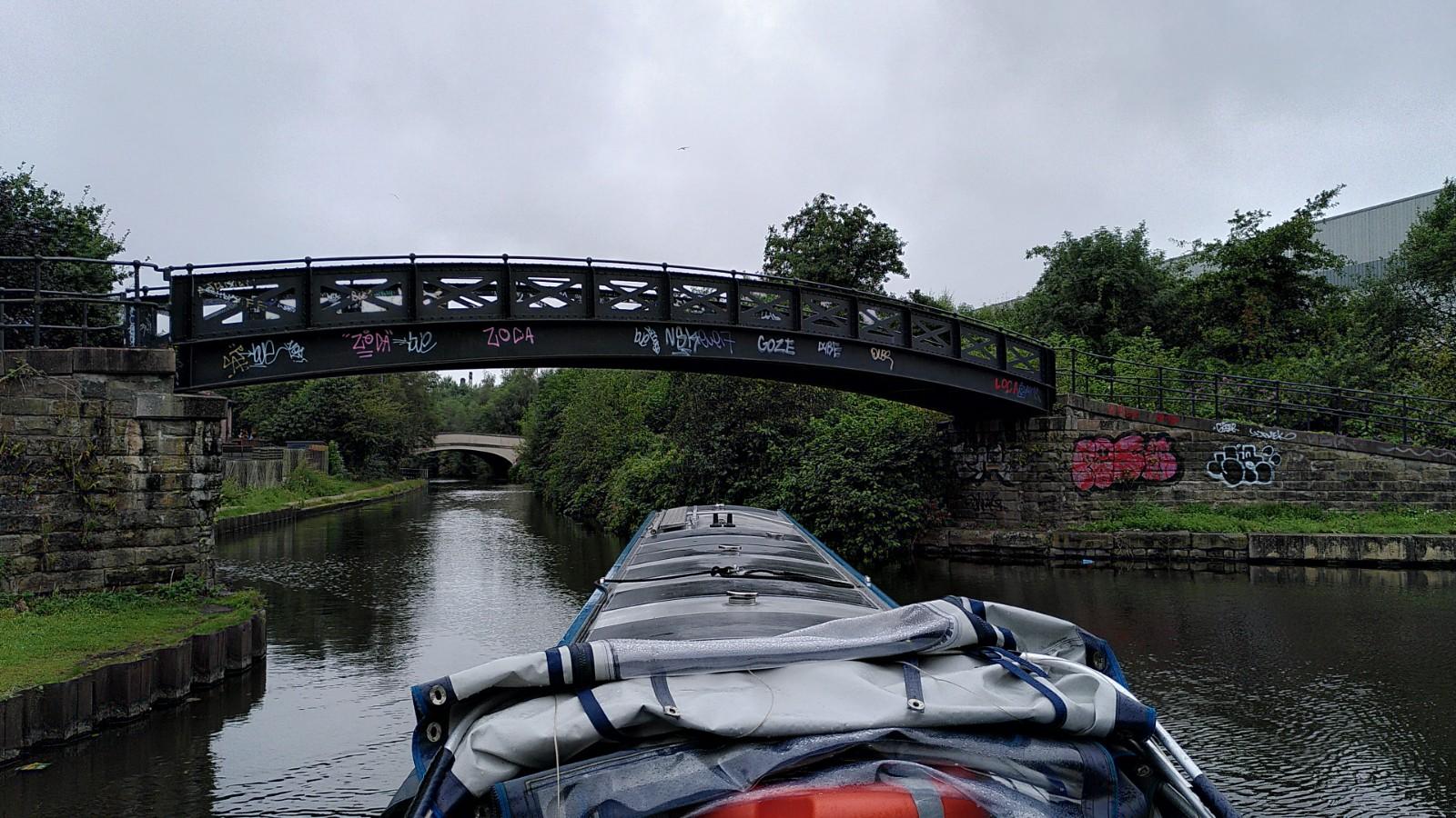 We drove through Manchester today; it was raining – but I repeat myself. To be fair, it was only the edge of Manchester, and it was only the edge of raining. We left Lymm promptly after breakfast. The Bridgewater Canal is wide and well-dredged so it was easy to make good time (the speed limit is 4mph). Even where there were moored boats, we didn’t generally need to slow down much as our passage hardly disturbed them. We stopped in Sale for a shopping trip. I’d spotted a bike shop with excellent reviews and hoped to get some new gloves for both cycling and helming (typical August purchase). Unfortunately for me her reviews must have got even better – the sign said the shop was shut for wedding and honeymoon.