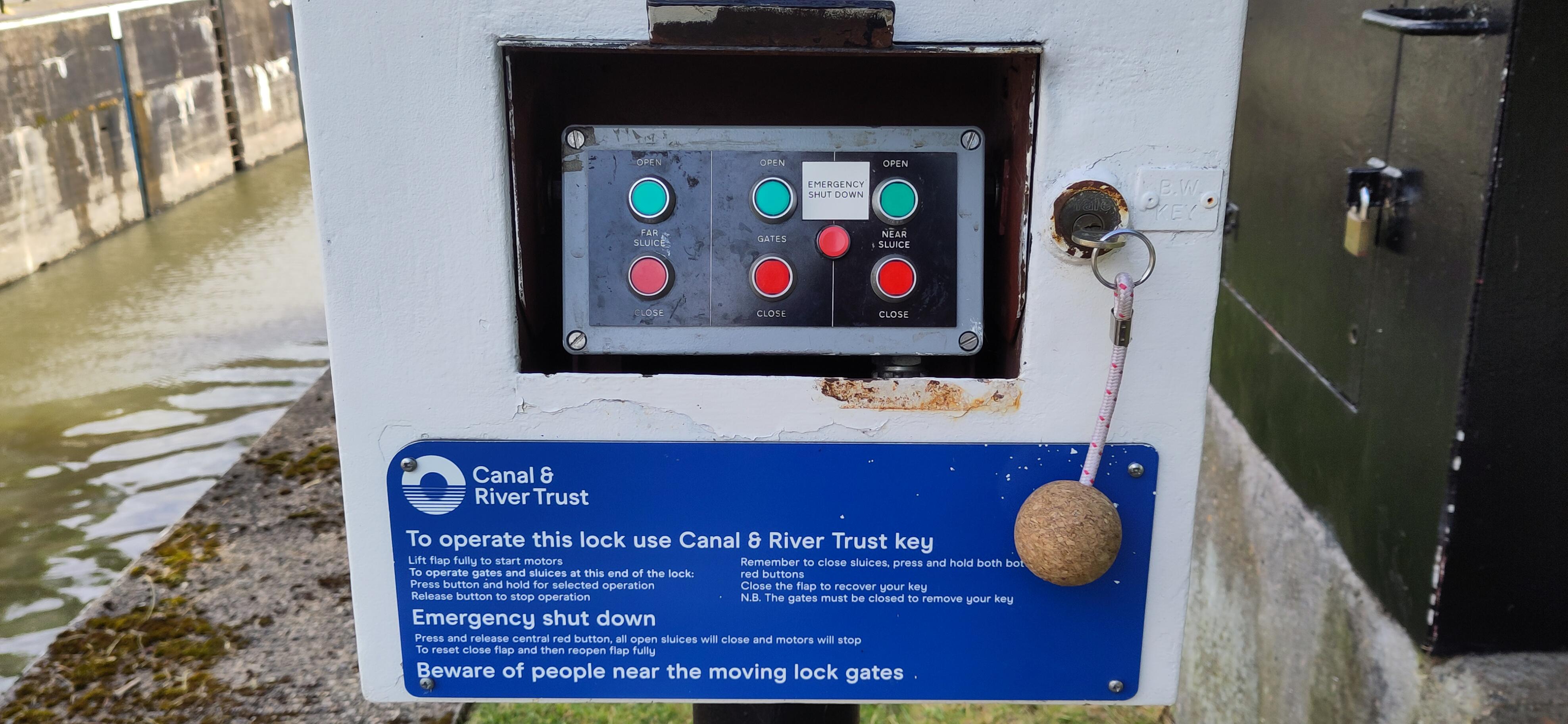 We weren’t surprised to see the lights at amber when we arrived – which means you have to work the lock yourself. Clare clambered up a ladder armed with the facilities key. The lock was set our way, so it wasn’t long before she opened the gates and I drove in. While I was getting the back of the boat tied up, Clare closed the gates. She was a little confused by the layout of the control panel – it was different from any she’d seen before. Once the gates were closed, the paddles needed to be shut. There were separate buttons for Near and Far. It took a little experiment to establish that this meant the near and far sluices at this end of the lock, not the other end.