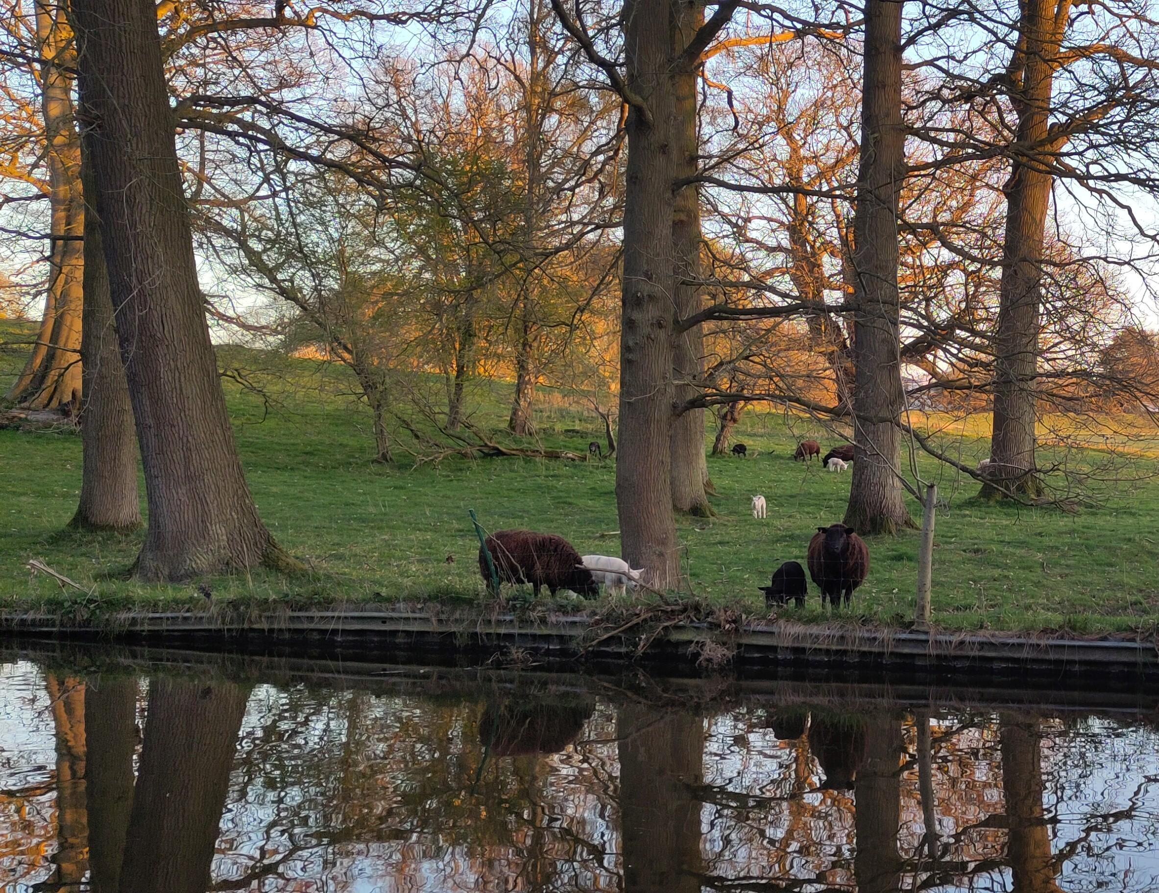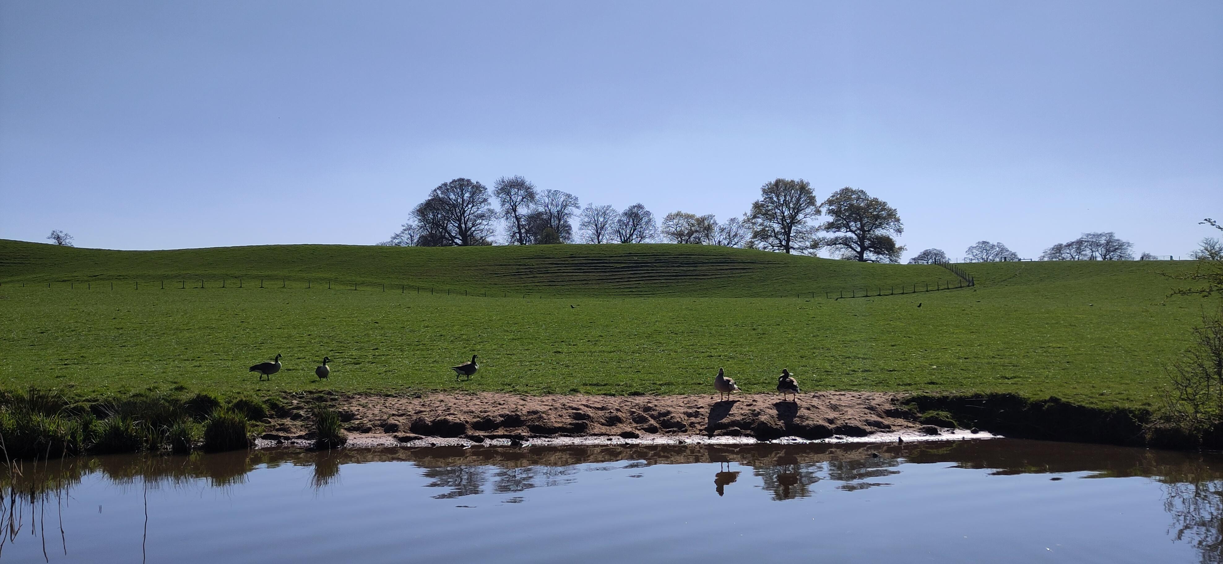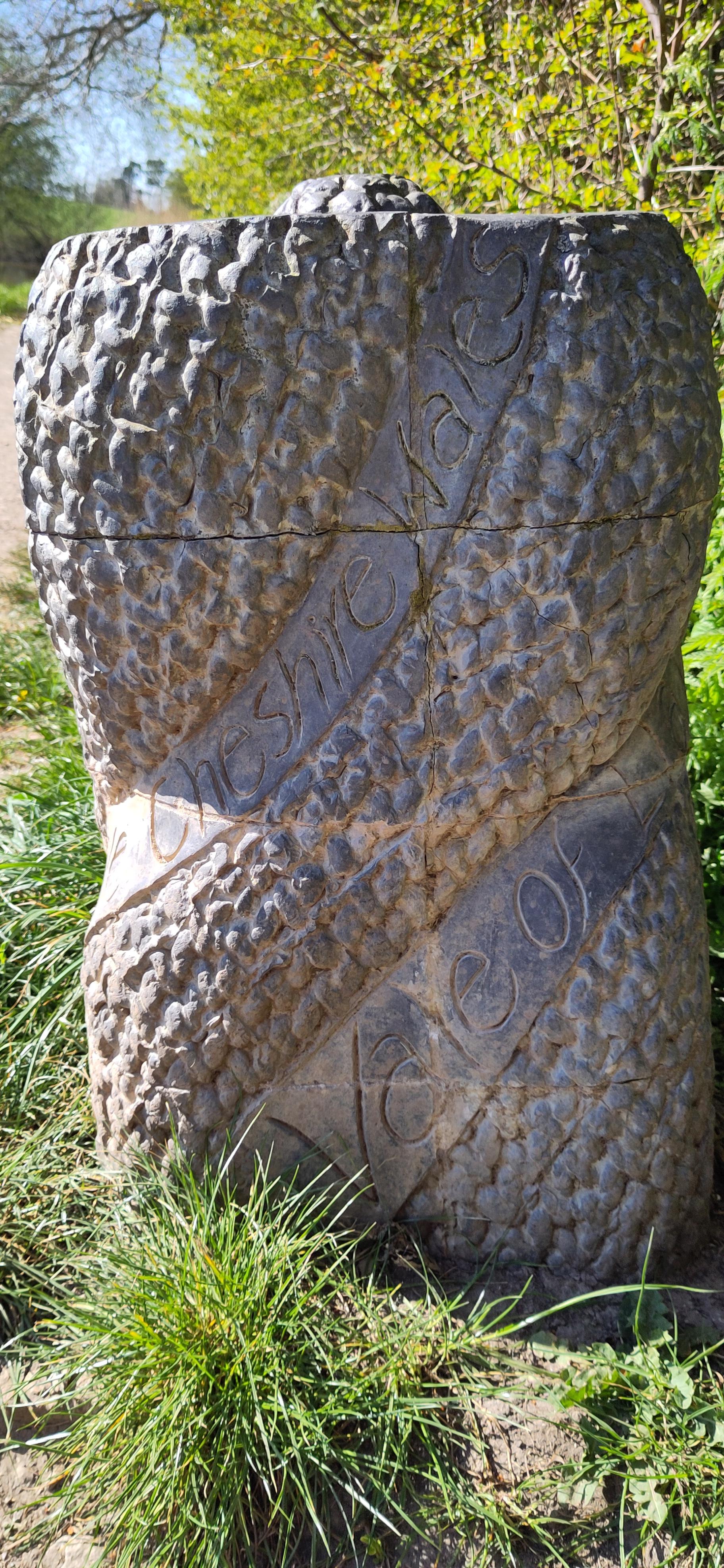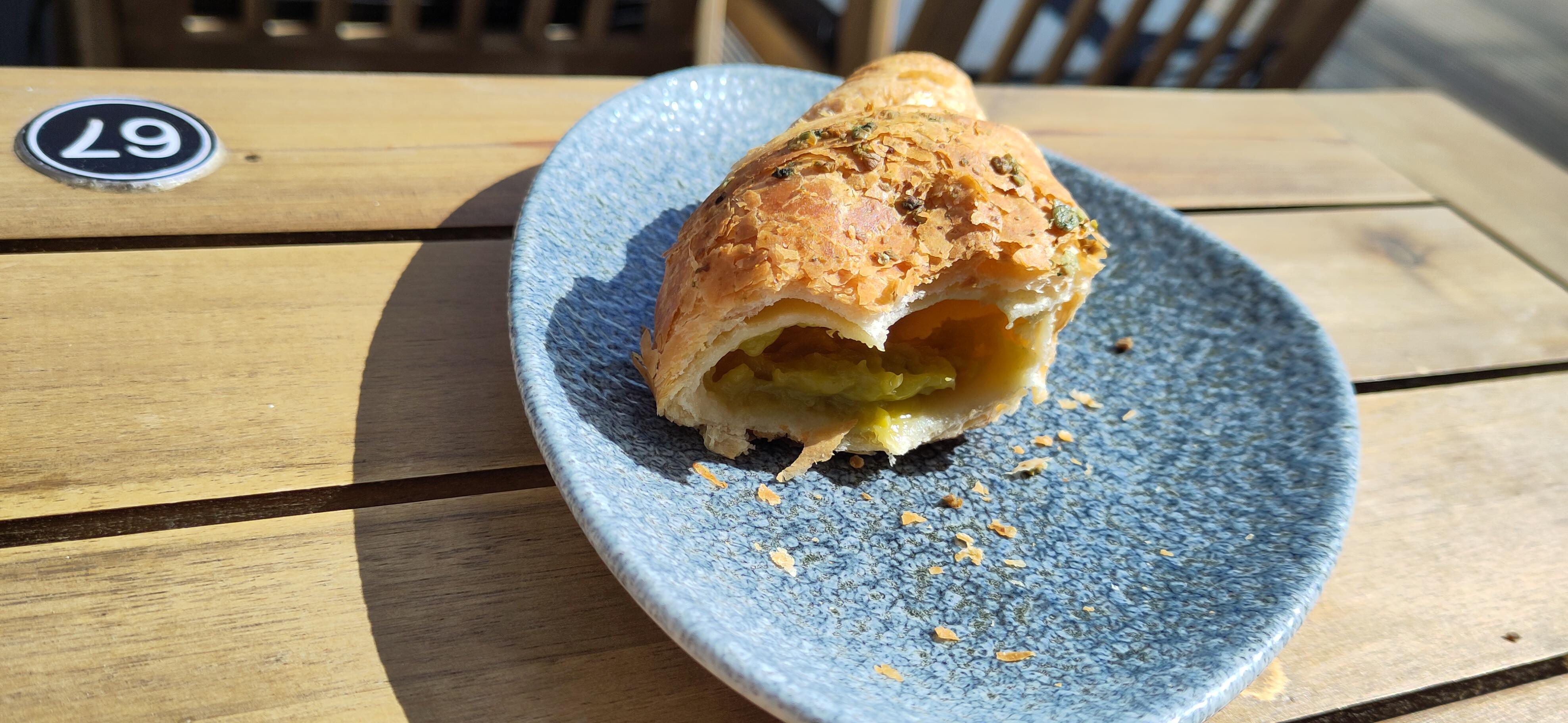 Shane was ready for some liquid refreshment and this route swung us past a cafe with a view to over the water so we ensconced ourselves on a sunny seat on their terrace after checking the array of cakes. Shane wasn't going to have a cake but now he had seem them he selected a chocolate croissant. Shane kept the table while I went in to order, but was told they didn't have chocolate croissant. I had not noticed the flecks were not brown on the pastry that I had assumed was a chocolate croissant, but green. I blame the adjustment from the brightness outside, and my unfamiliarity with pistachio croissant. I was further wrong footed when I requested gingerbread only to be told they didn't have that either. What I thought was gingerbread was apple and miso cake. Again, I have never seen that, so no surprise I hadn't guessed. I decided to give it a go (and it was very good, very moist) then I hurried out to check with Shane and offer alternatives. Bara brith was available, even if we were not quite in Wales, but he stuck with the croissant, The filling was a bit greener than any croissant interior I have met at home or abroad.