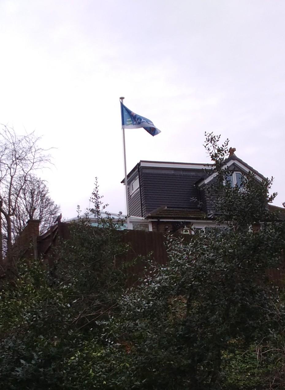 Looking out this morning, watching squirrels and moorhens on the opposite bank, I noticed the house opposite was flying a Christmas flag. Flags seem to be very popular these days and certainly lots of canal boats have them. Many are national, pirate is popular, but there are lots of regional ones we have seen on boats.. Black country flag, Lancashire, Worcestershire. But this one is seasonal.